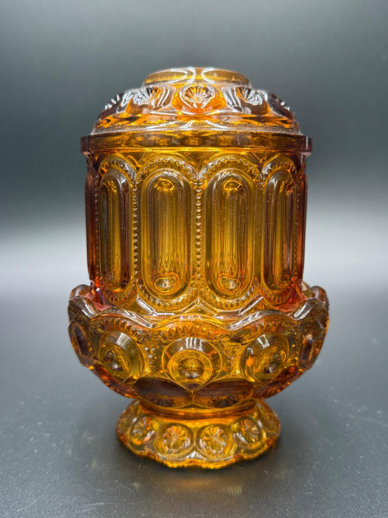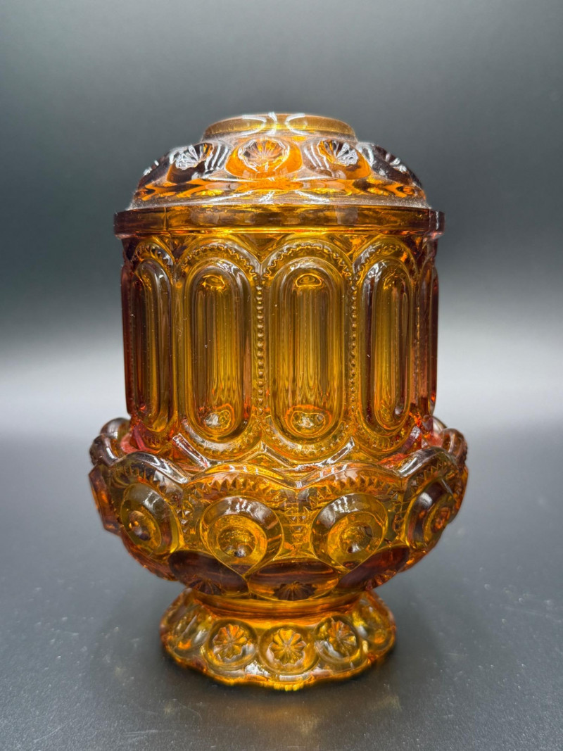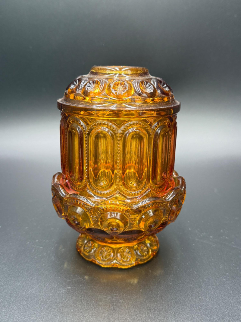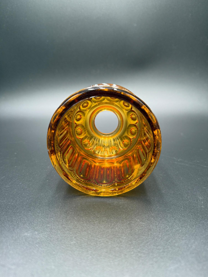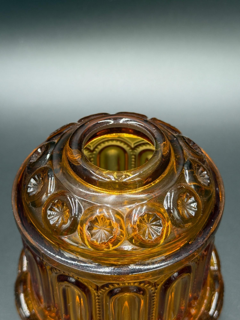 Vintage LE Smith Amber Glass Moon and Stars Fairy Lamp Amber pressed glass fairy lamp with a cylindrical top and rounded base. Features the classic “Moon and Stars” pattern with oval and circular motifs. The two-piece design houses a small candle or light source. Likely made by LE Smith Glass Co. based on pattern and form. Measurements: