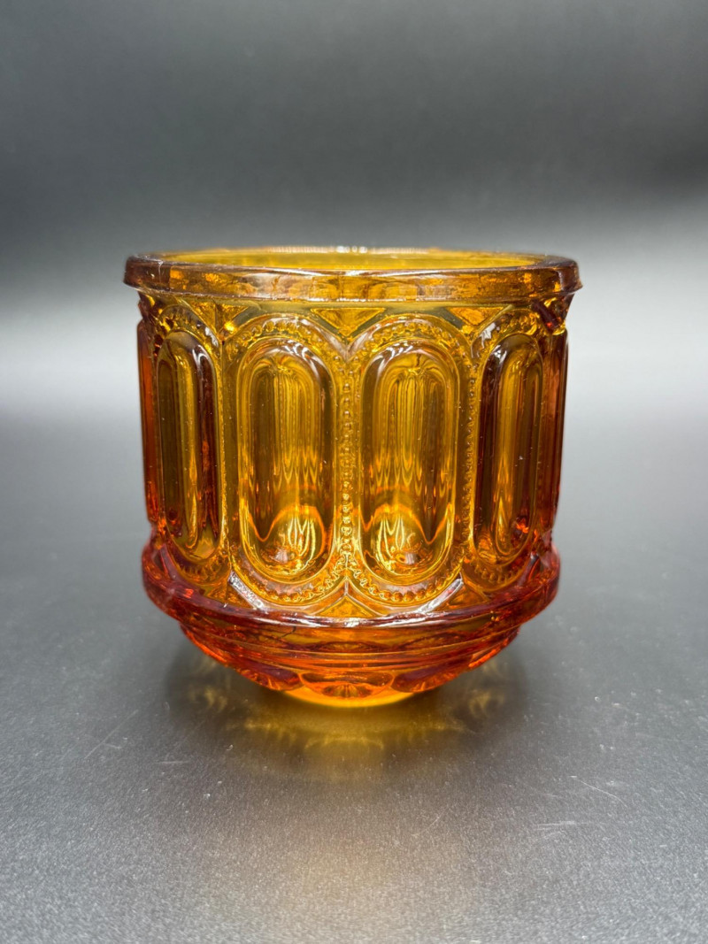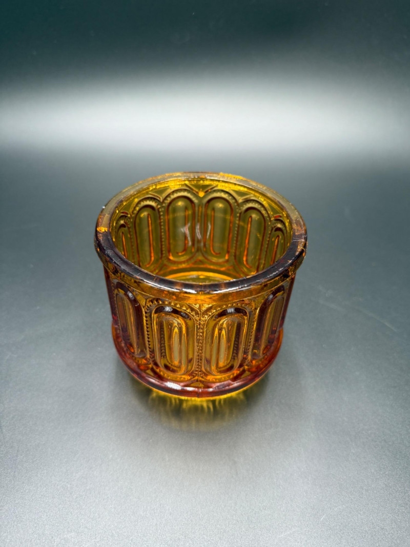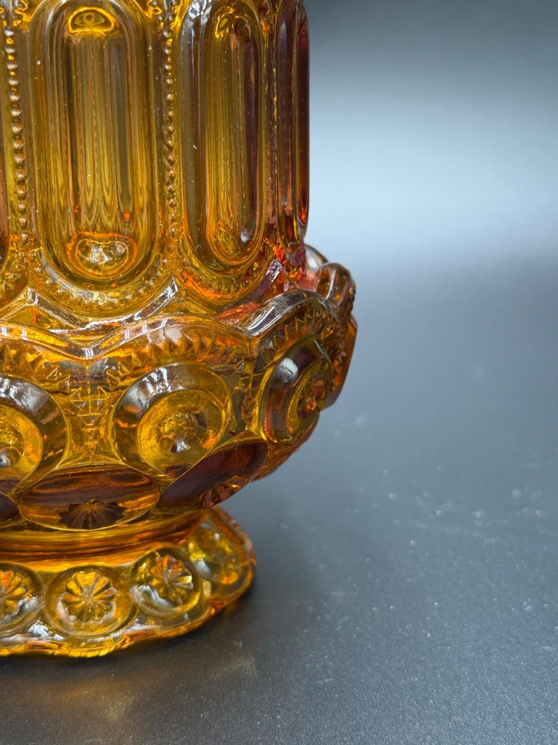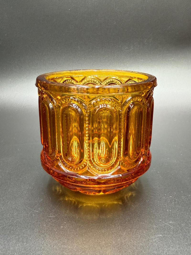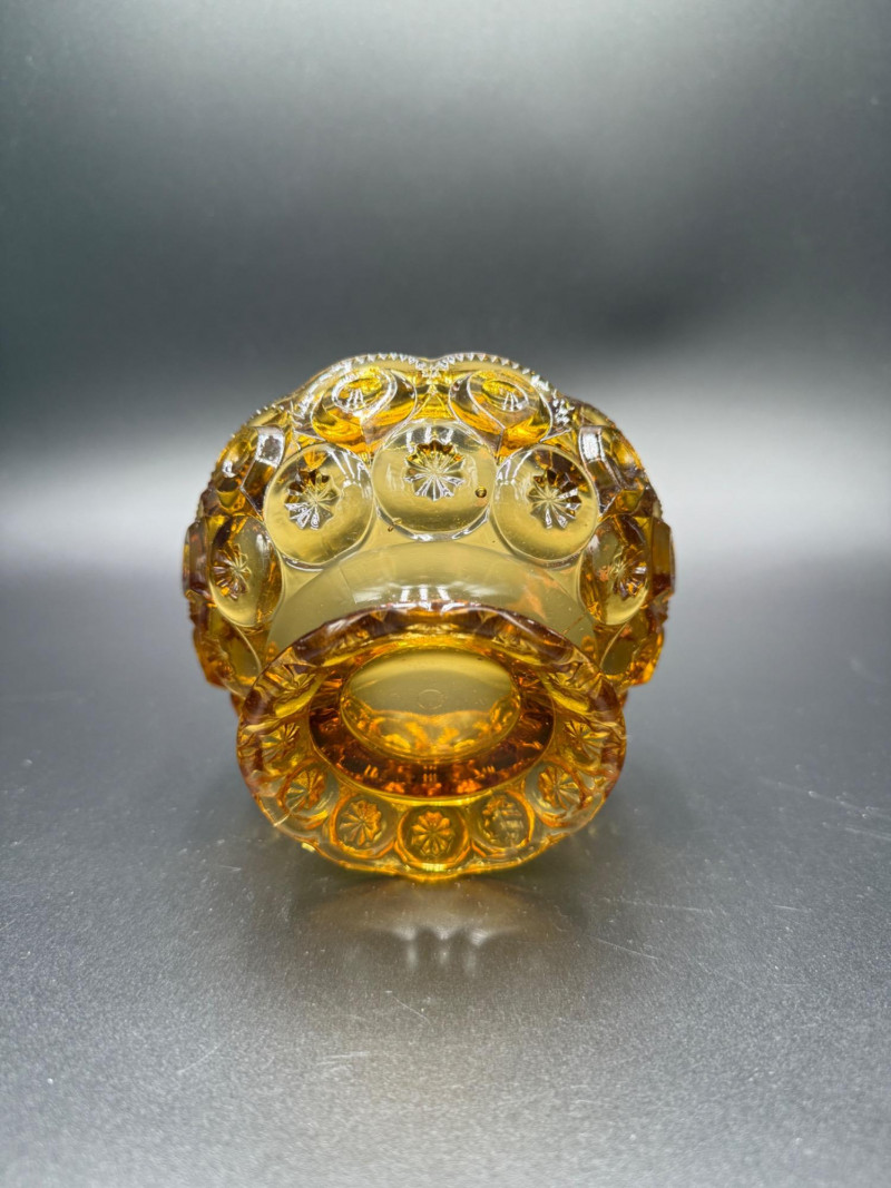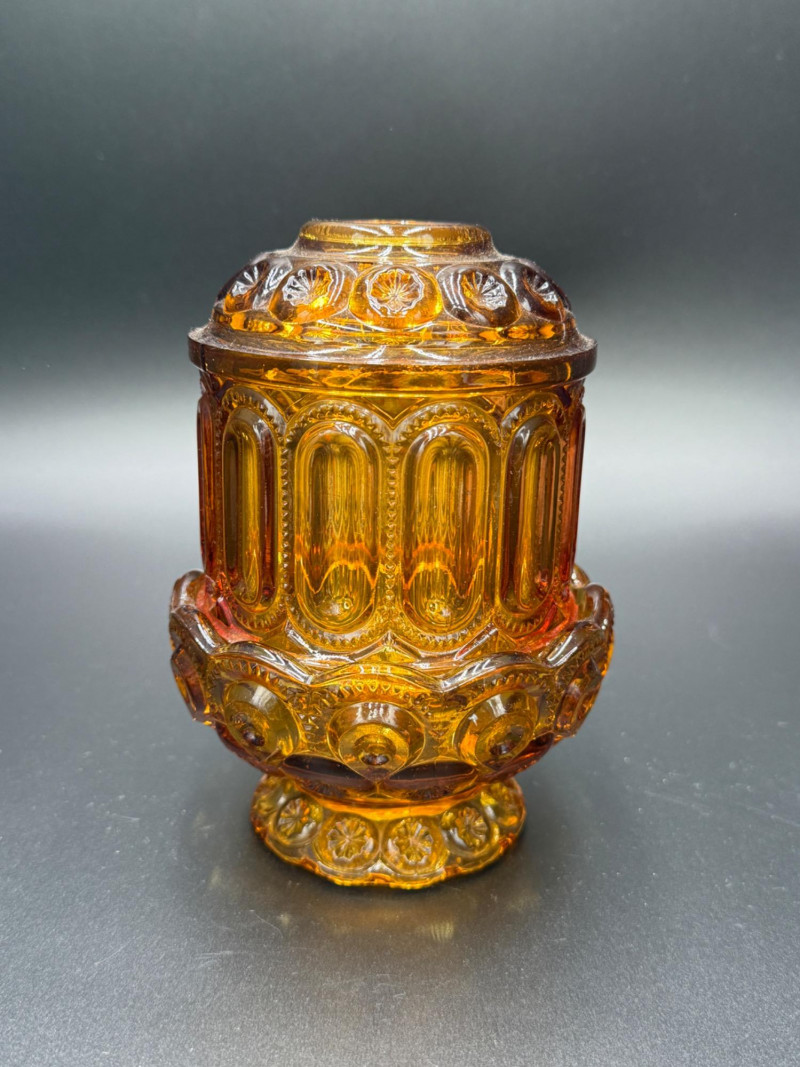 Vintage LE Smith Amber Glass Moon and Stars Fairy Lamp Amber pressed glass fairy lamp with a cylindrical top and rounded base. Features the classic “Moon and Stars” pattern with oval and circular motifs. The two-piece design houses a small candle or light source. Likely made by LE Smith Glass Co. based on pattern and form. Measurements: