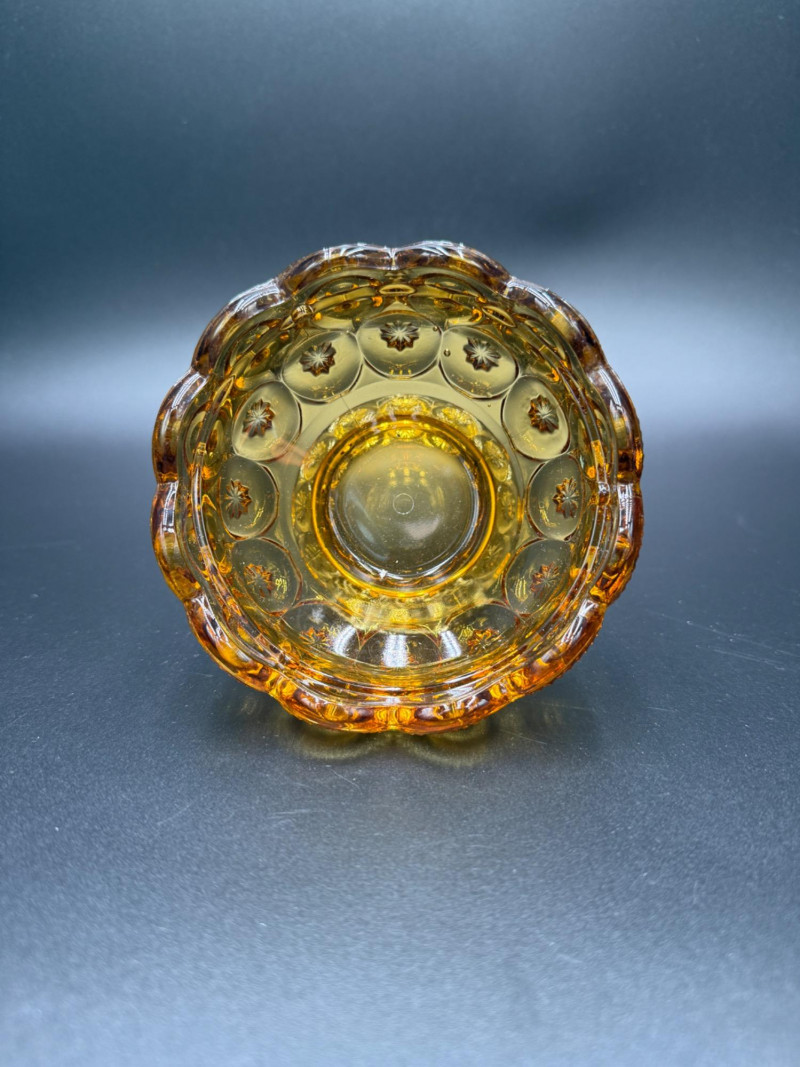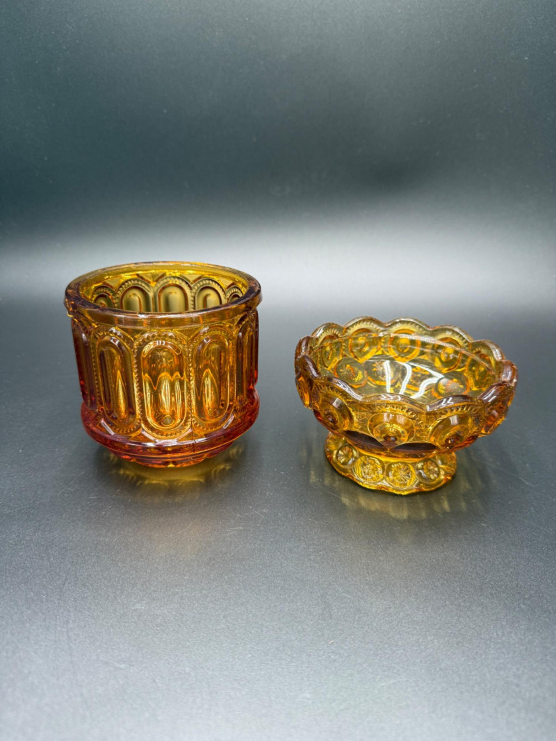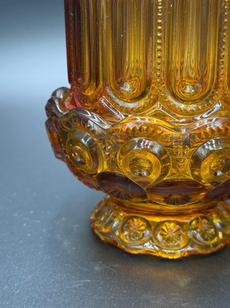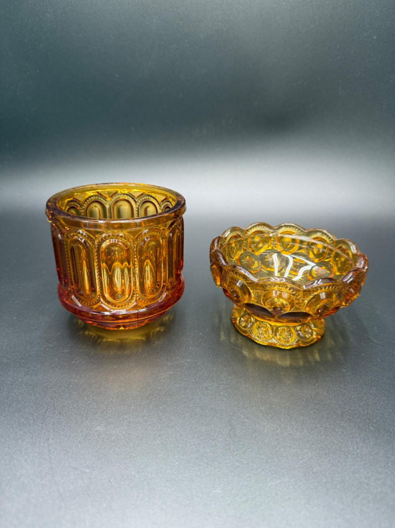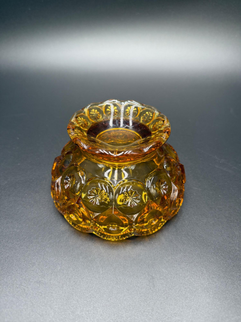 Vintage LE Smith Amber Glass Moon and Stars Fairy Lamp Amber pressed glass fairy lamp with a cylindrical top and rounded base. Features the classic “Moon and Stars” pattern with oval and circular motifs. The two-piece design houses a small candle or light source. Likely made by LE Smith Glass Co. based on pattern and form. Measurements: