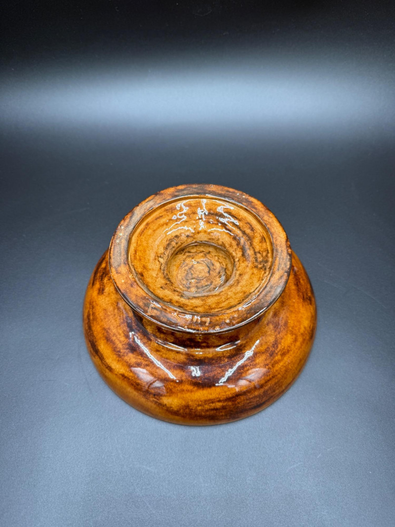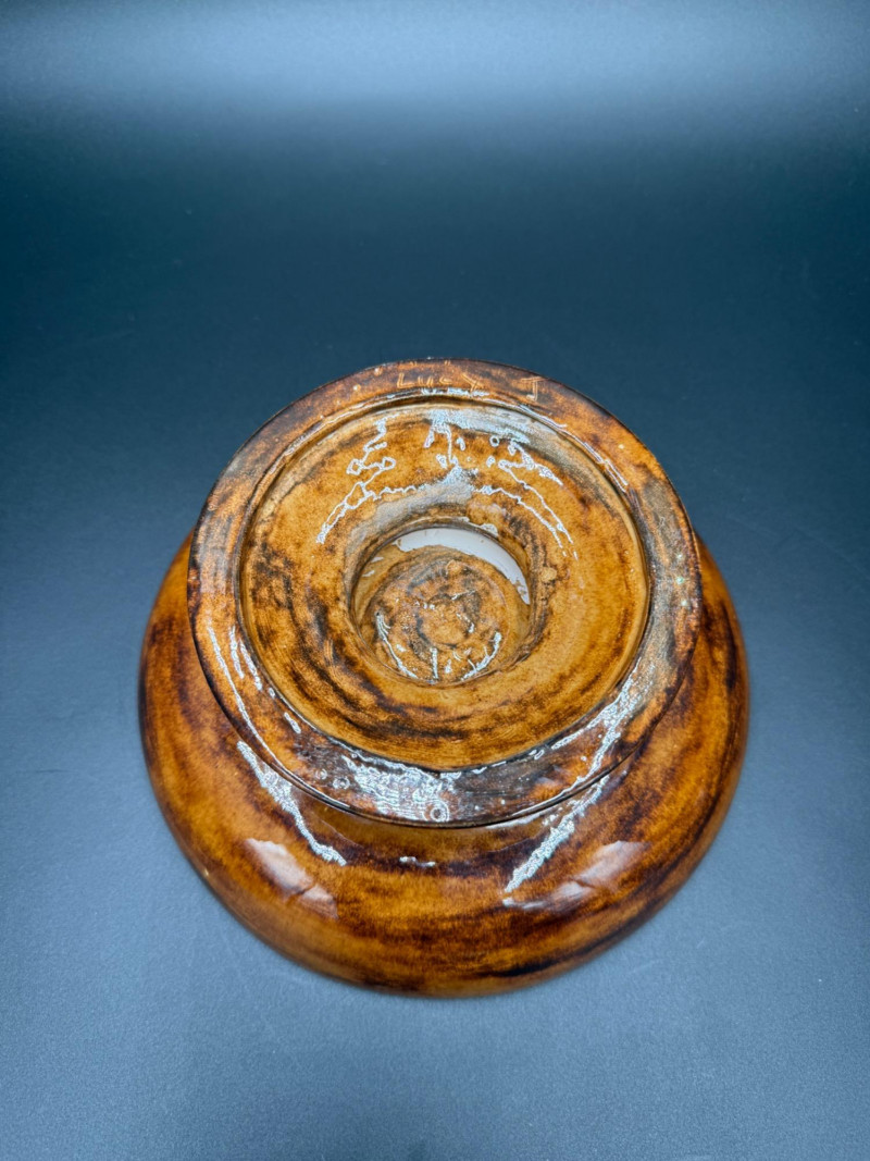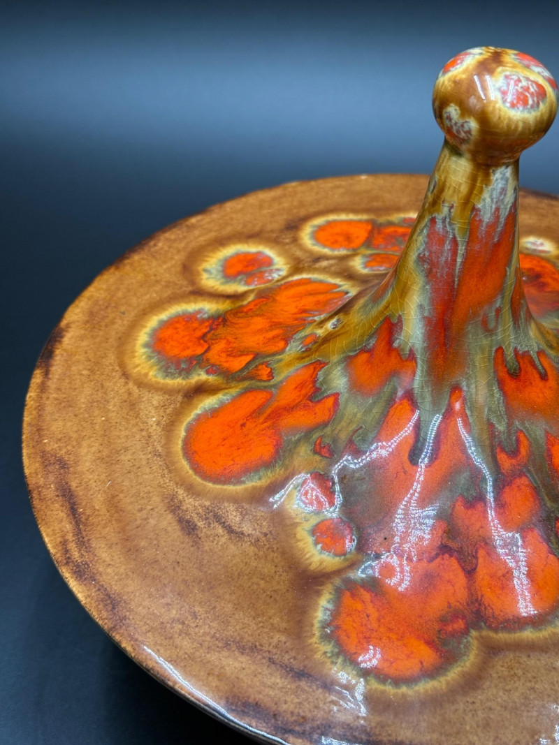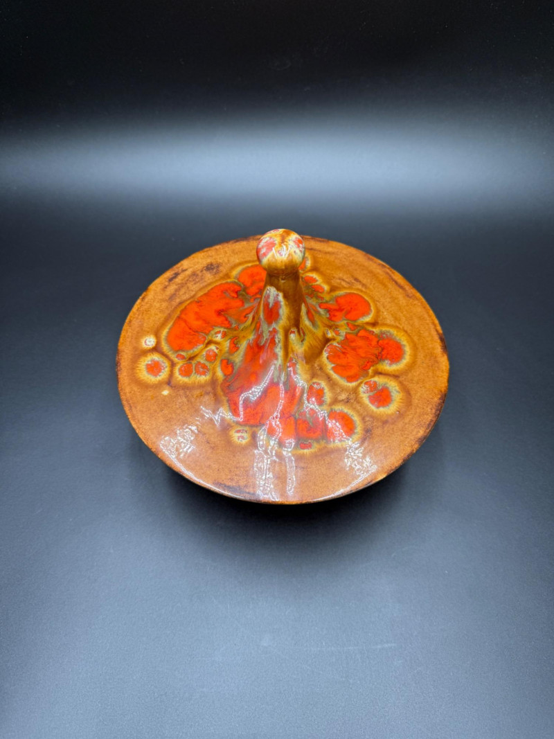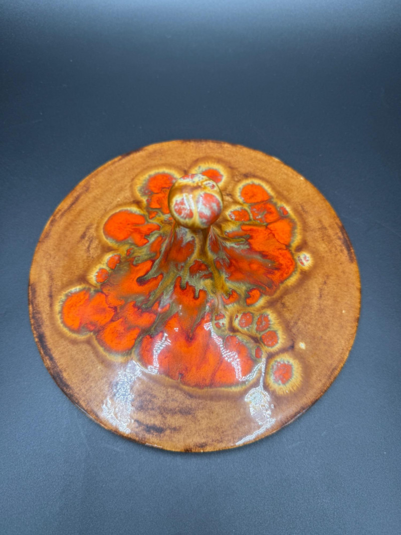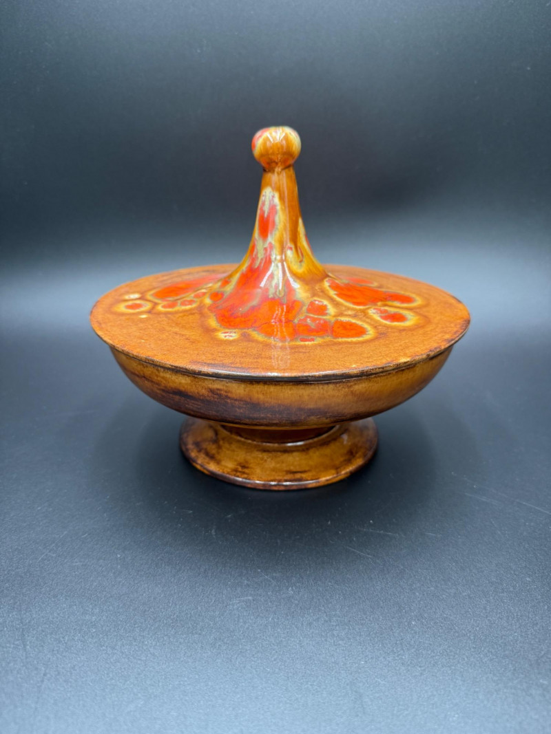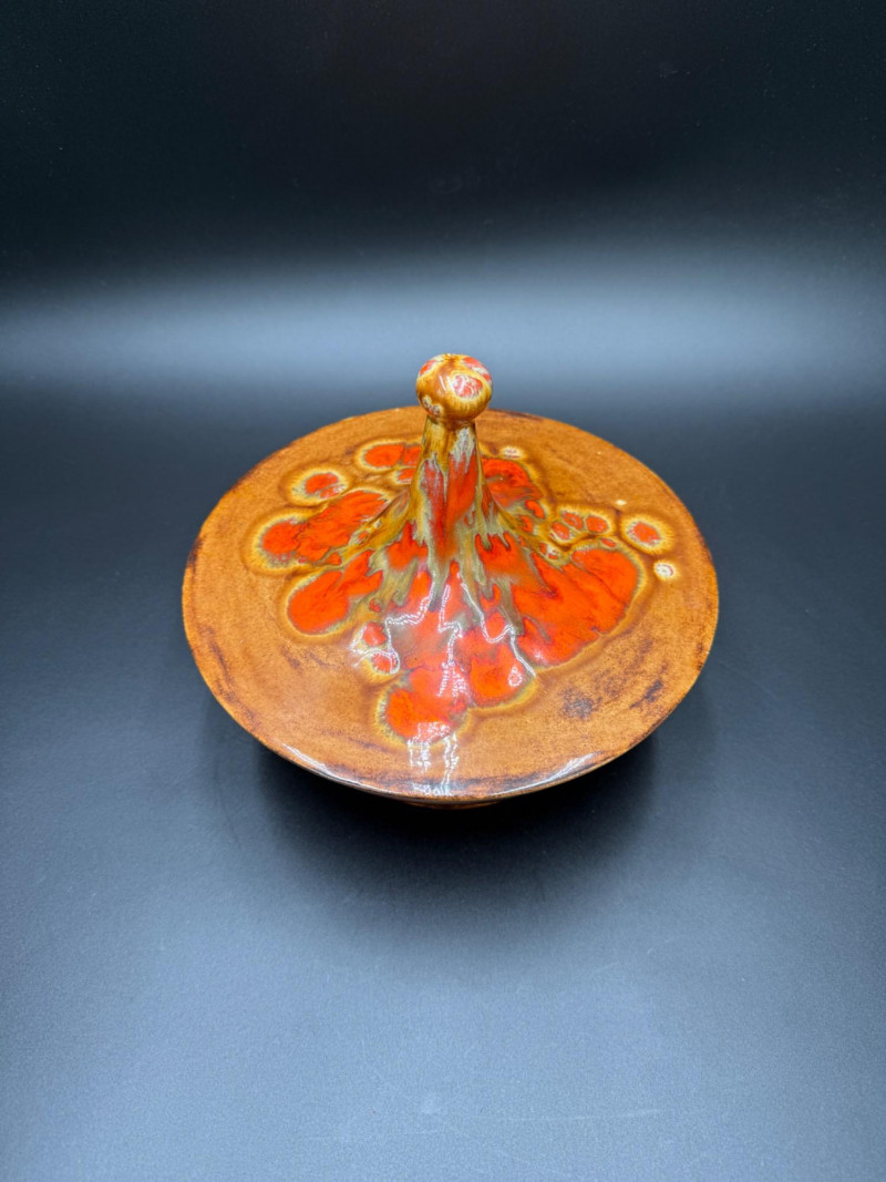 Two-piece ceramic container with a domed lid featuring a tall central knob. The lid is decorated with red and orange glaze drips radiating from the center. The container base has a rounded form with a short foot and matching glaze. The underside of the lid is signed “Lucy J”.