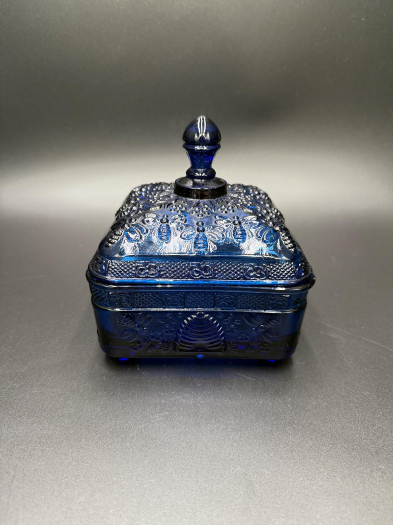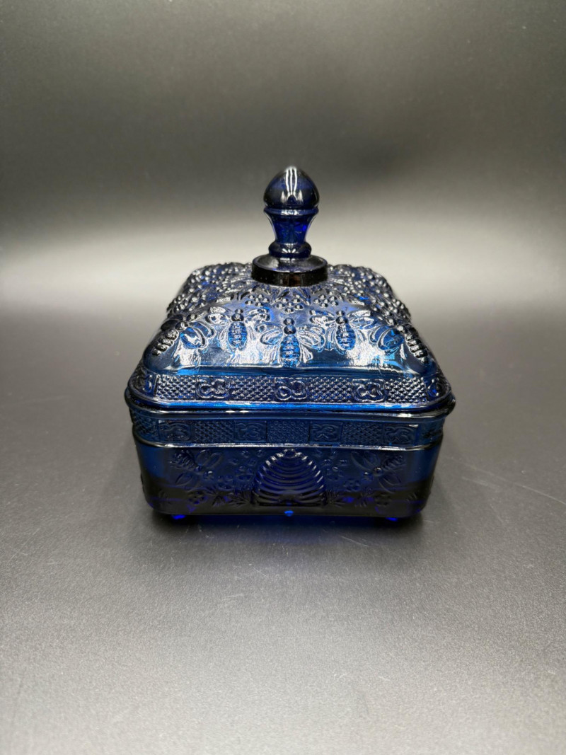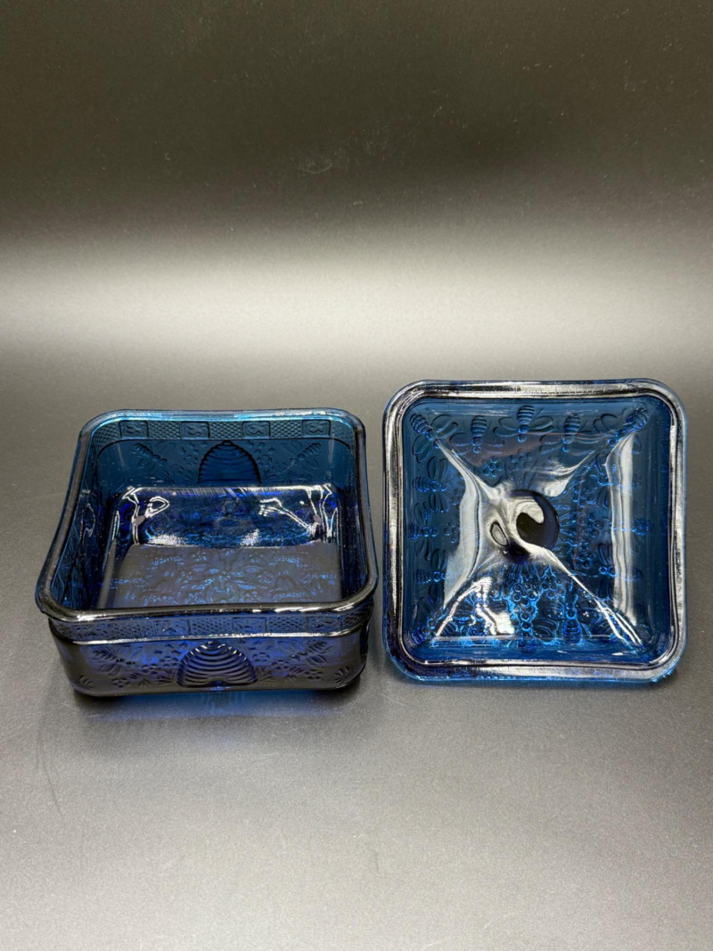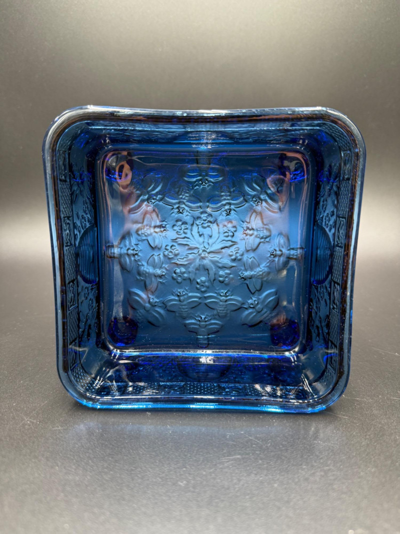 Vintage Cobalt Blue Pressed Glass Covered Dish – Bee & Hive Pattern This striking vintage covered dish is crafted from deep cobalt blue pressed glass and features intricate relief designs of bees, flowers, and hive motifs on all sides. The square base and matching domed lid are richly detailed, offering both visual texture and historic charm. A faceted finial tops the lid for easy handling and an added decorative touch. The base interior continues the ornate pattern work with symmetrical bee and floral impressions, showcasing the craftsmanship throughout. A stunning collector’s piece, perfect for display or functional use as a candy dish, trinket box, or centerpiece. This pattern and color are becoming increasingly hard to find, especially in such well-preserved condition. Dimensions: Base: 5.5" × 5.5" × 2.5" Lid: 5.25" × 5.25" × 3.5"
