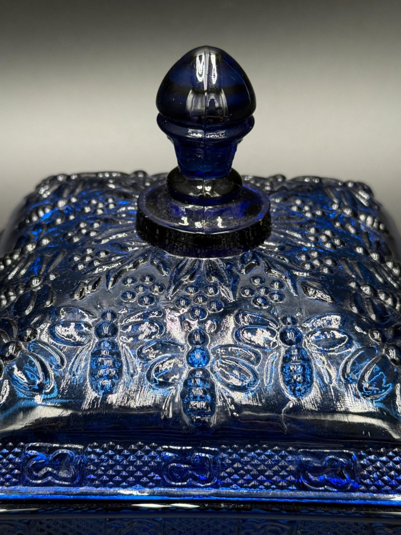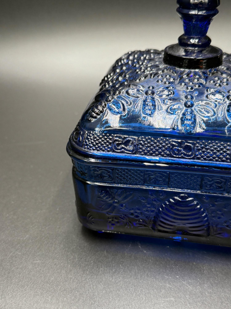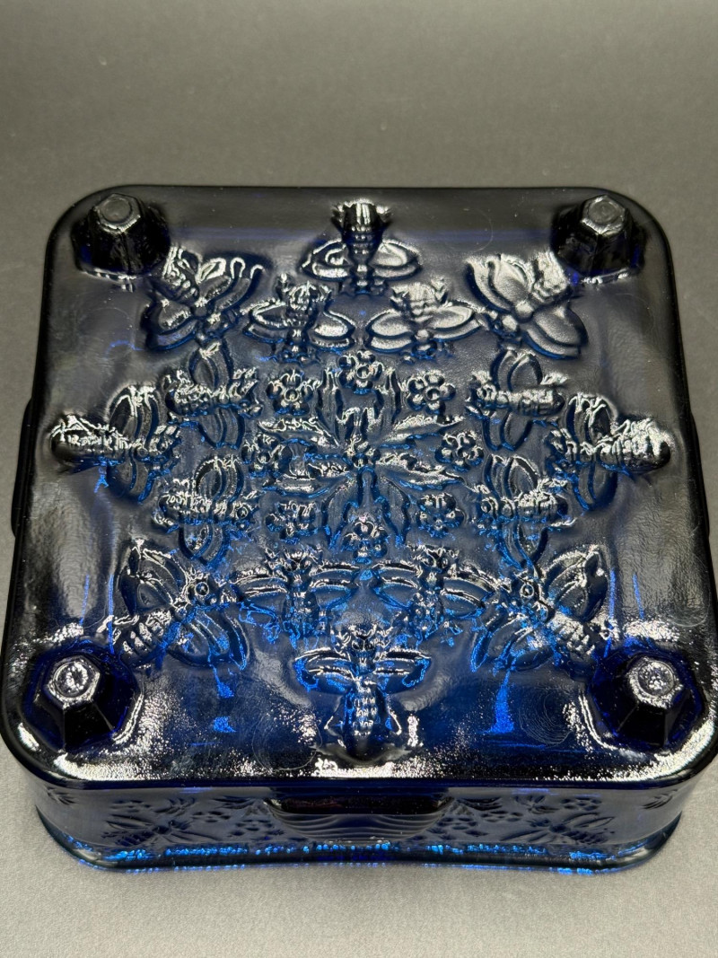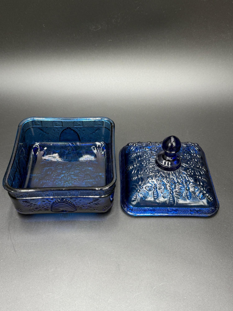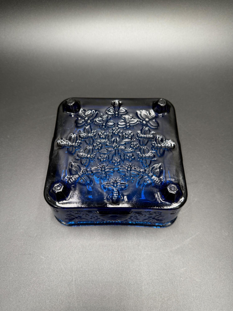 Vintage Cobalt Blue Pressed Glass Covered Dish – Bee & Hive Pattern This striking vintage covered dish is crafted from deep cobalt blue pressed glass and features intricate relief designs of bees, flowers, and hive motifs on all sides. The square base and matching domed lid are richly detailed, offering both visual texture and historic charm. A faceted finial tops the lid for easy handling and an added decorative touch. The base interior continues the ornate pattern work with symmetrical bee and floral impressions, showcasing the craftsmanship throughout. A stunning collector’s piece, perfect for display or functional use as a candy dish, trinket box, or centerpiece. This pattern and color are becoming increasingly hard to find, especially in such well-preserved condition. Dimensions: Base: 5.5" × 5.5" × 2.5" Lid: 5.25" × 5.25" × 3.5"