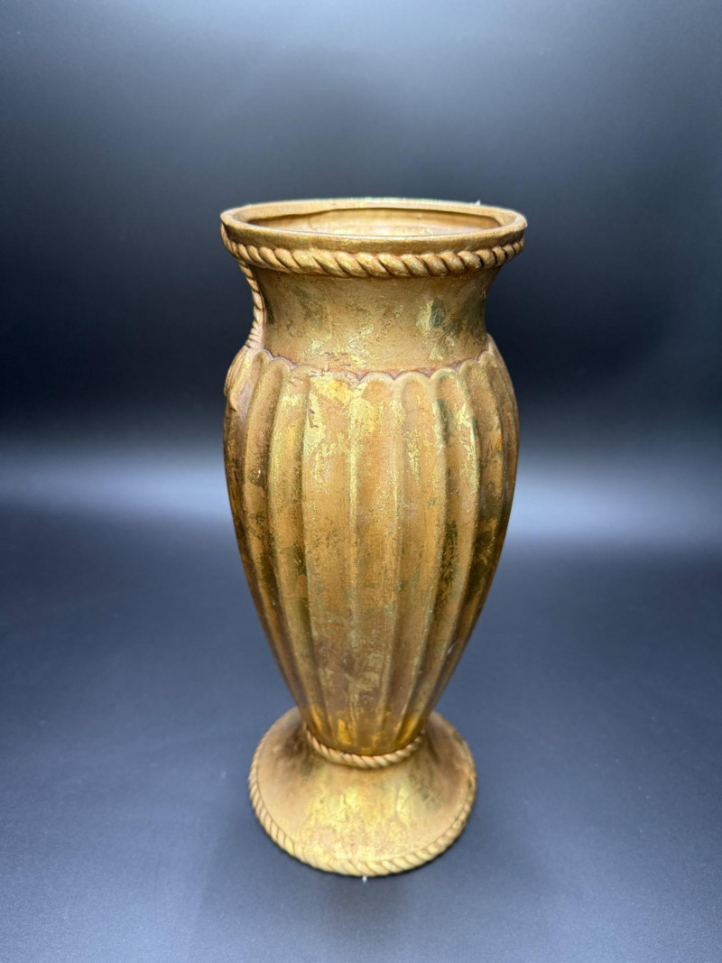 Vintage Gold Painted Vase with Rope Detail Dimensions: Approx. 4.5" diameter × 12" height.