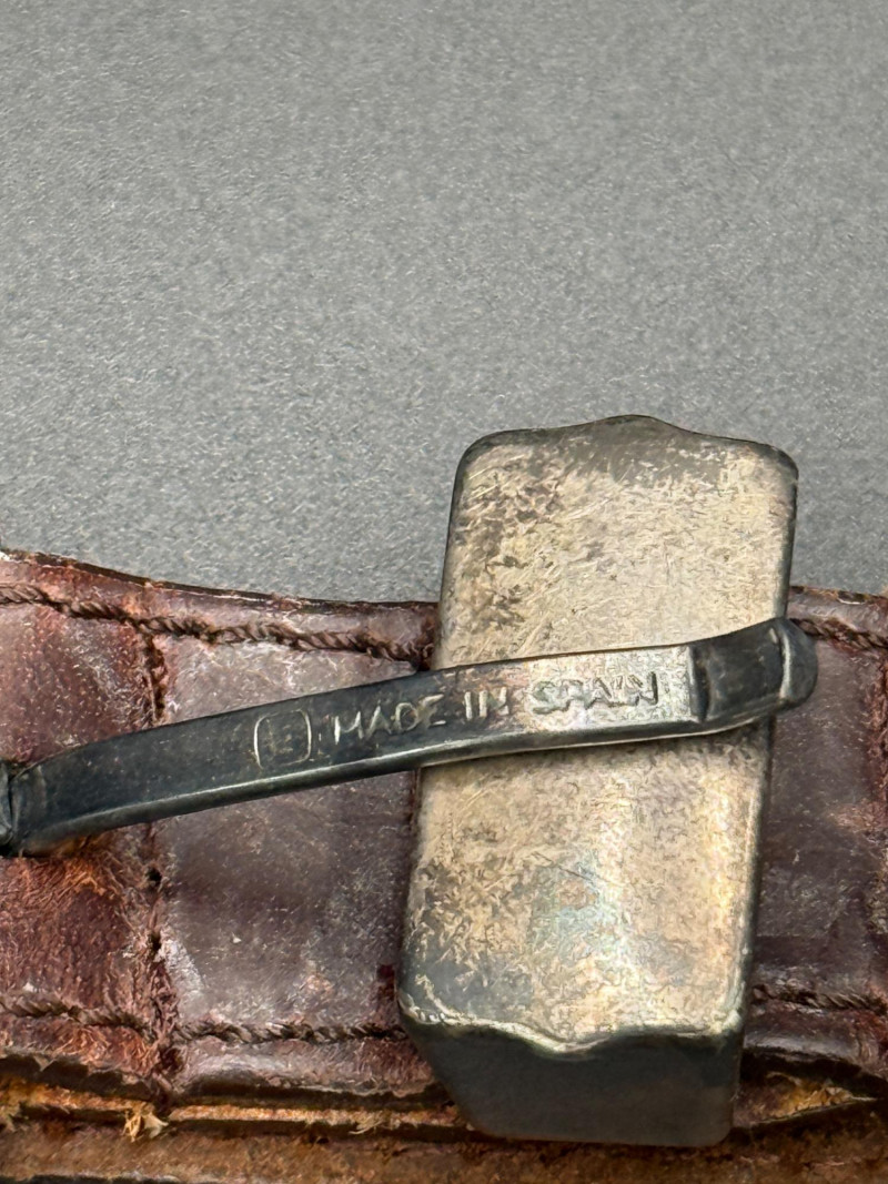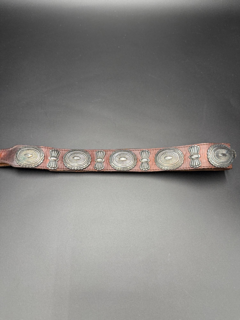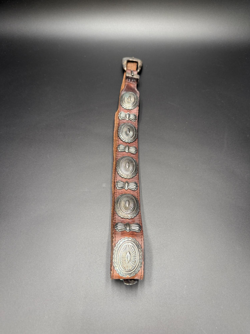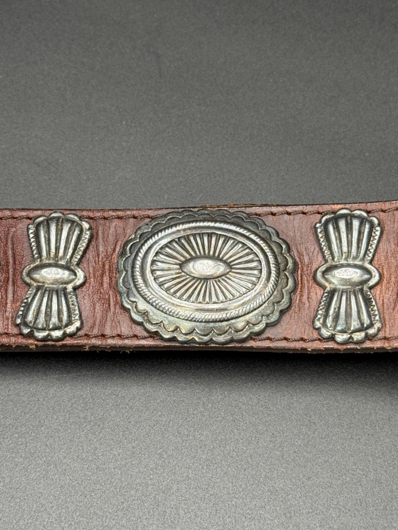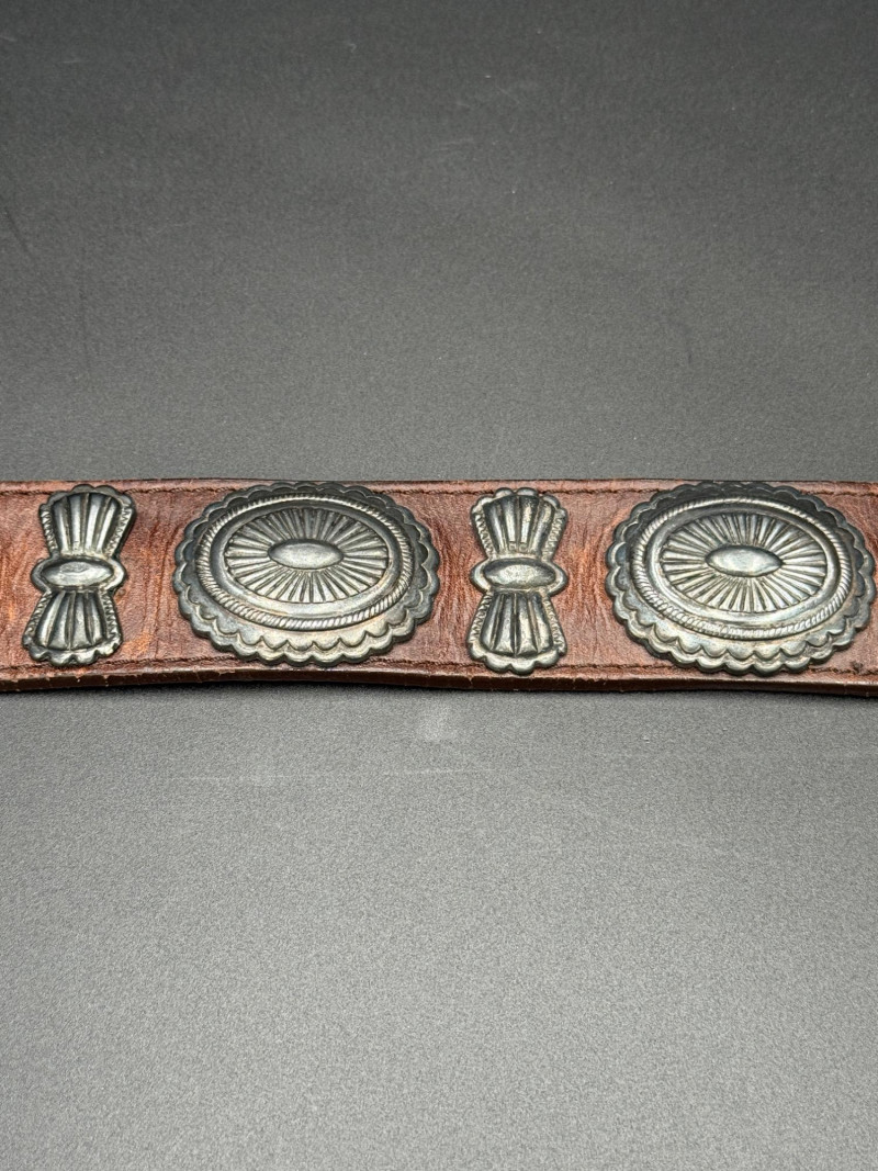 Leather Belt with Silver Hardware Brown leather belt with eight stamped silver-tone conchos and a marked "Made in Spain." Features a silver-tone tip, loop, and multiple adjustment holes. Measurements: 39.5 inches long.