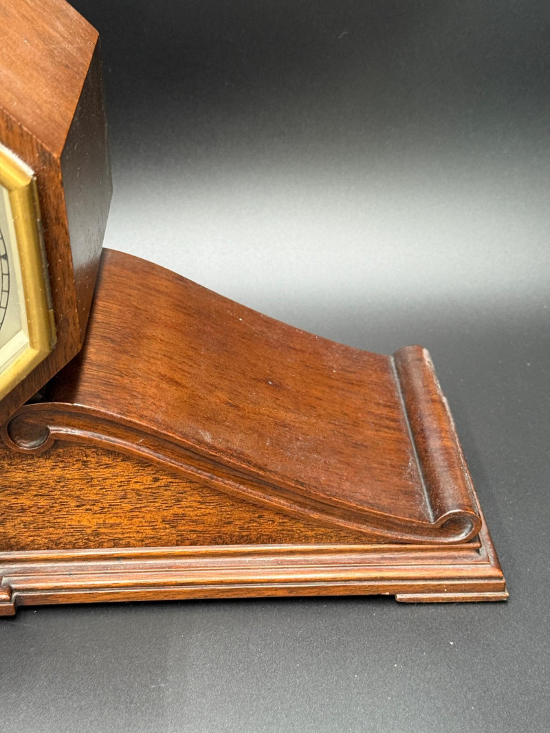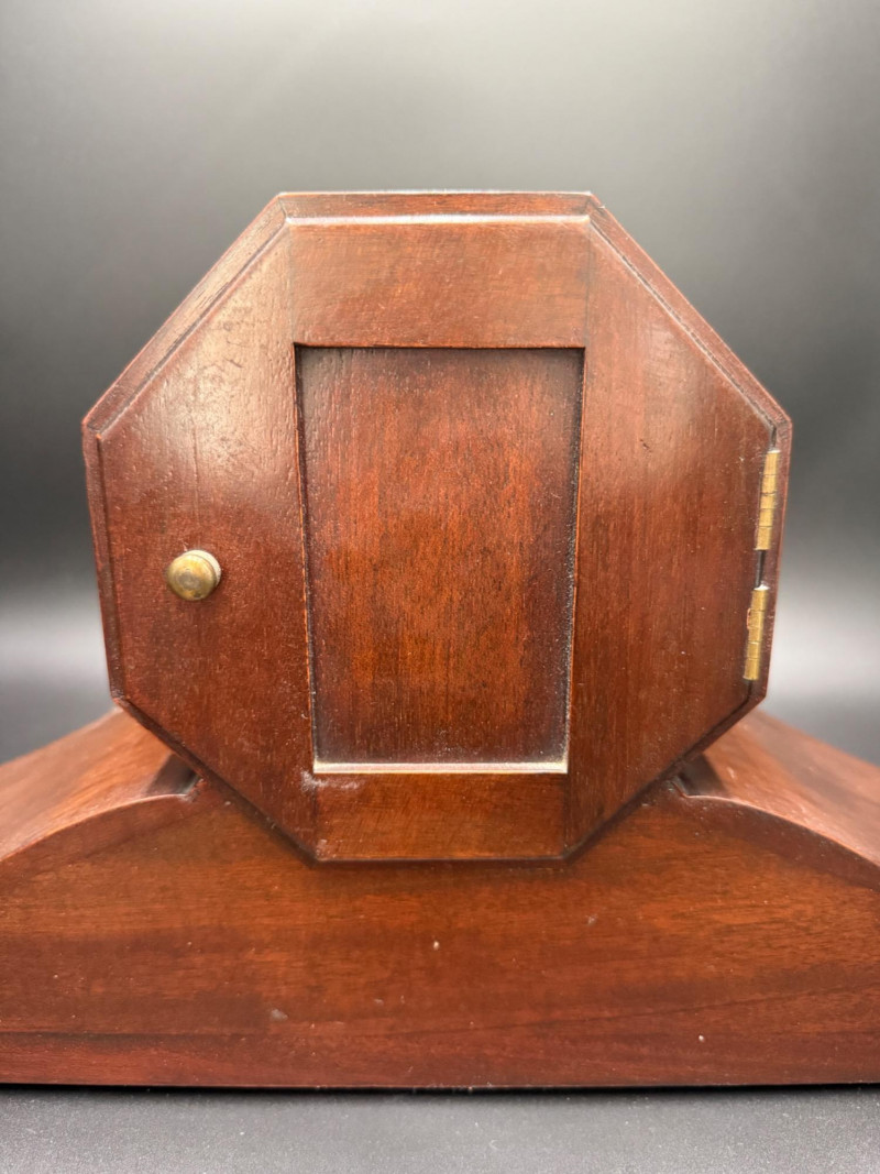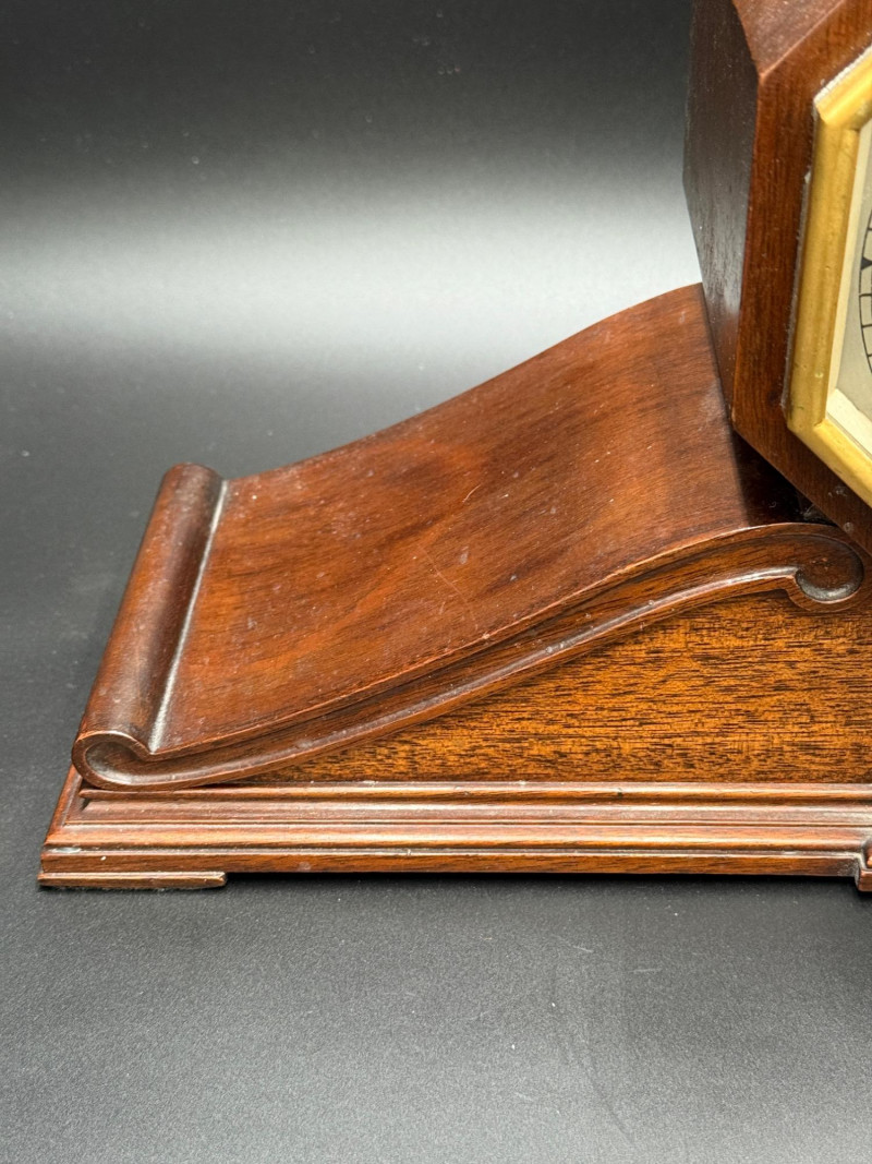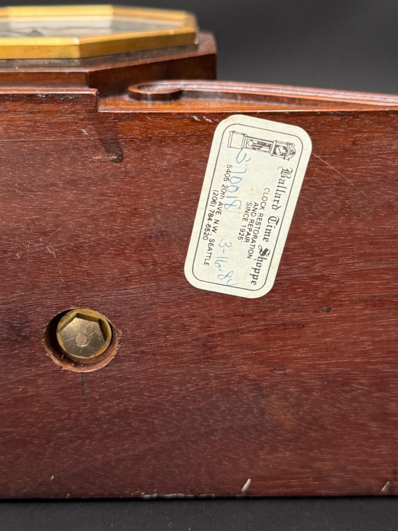 Seth Thomas Wooden Mantle Clock Seth Thomas wooden mantle clock with octagonal face, brass bezel, and mechanical movement. Service label dated 1987. Note: Functionality untested.