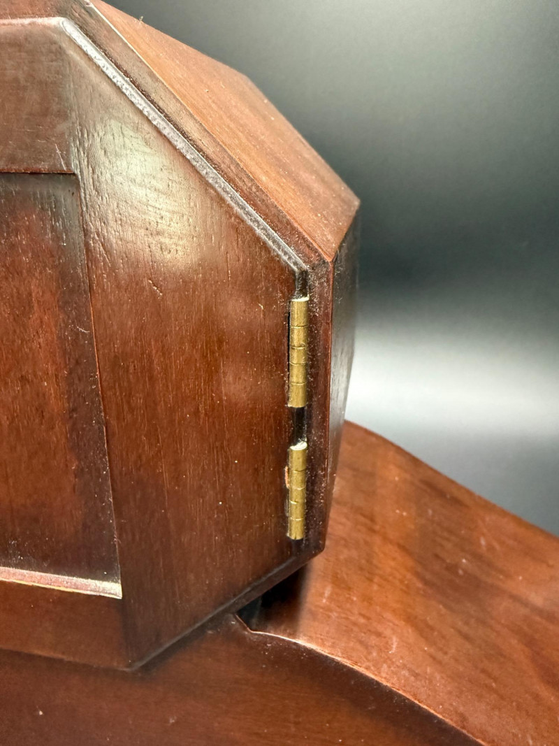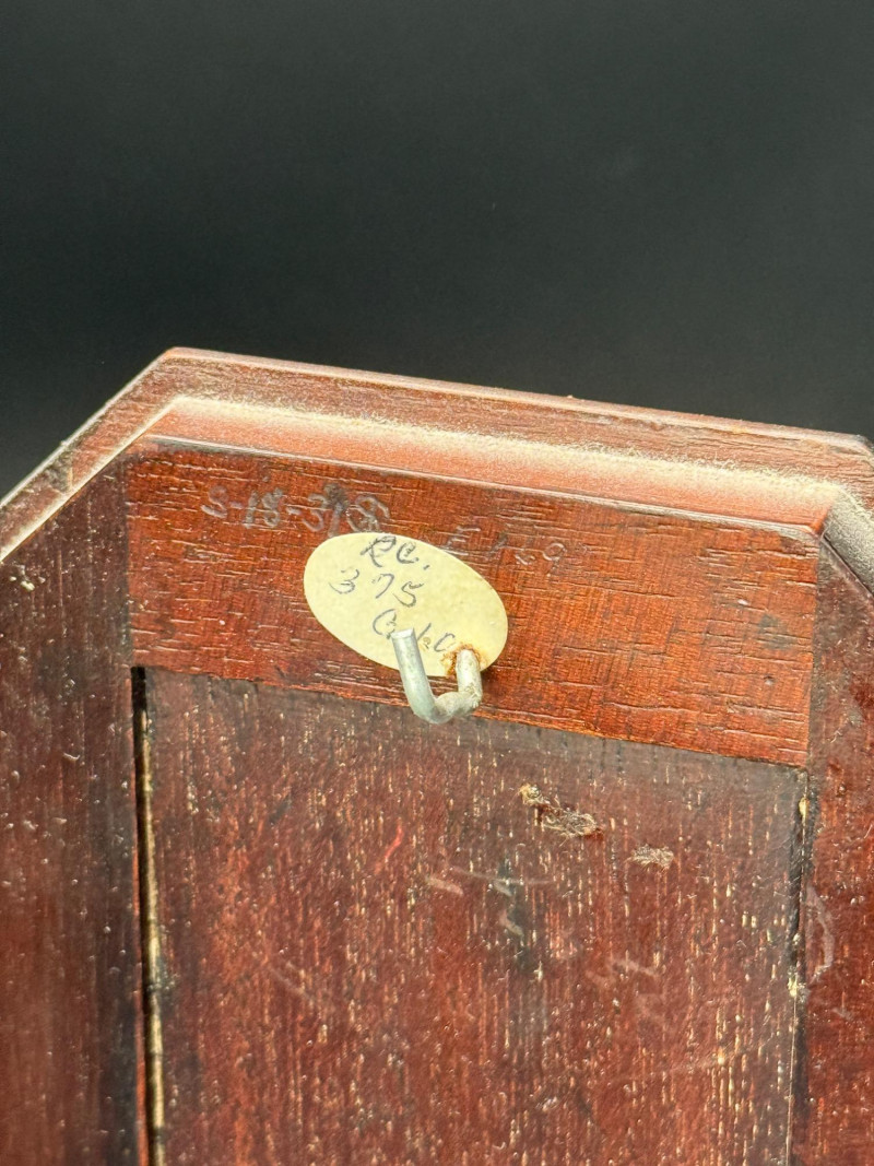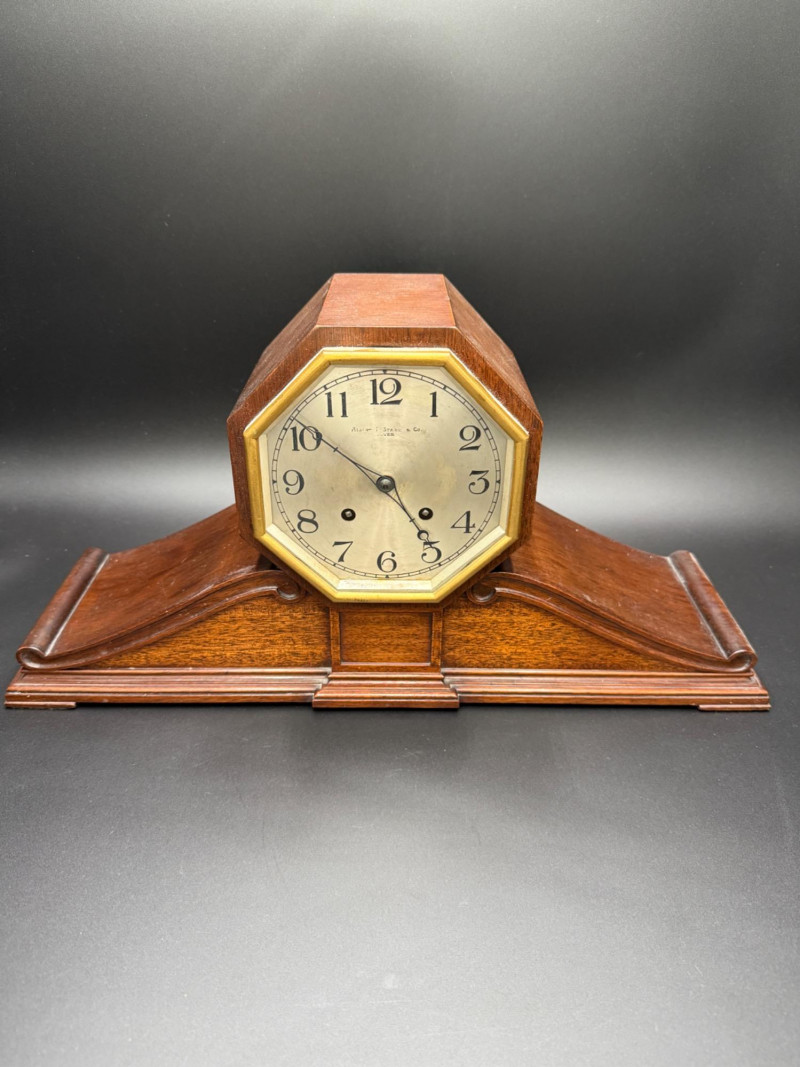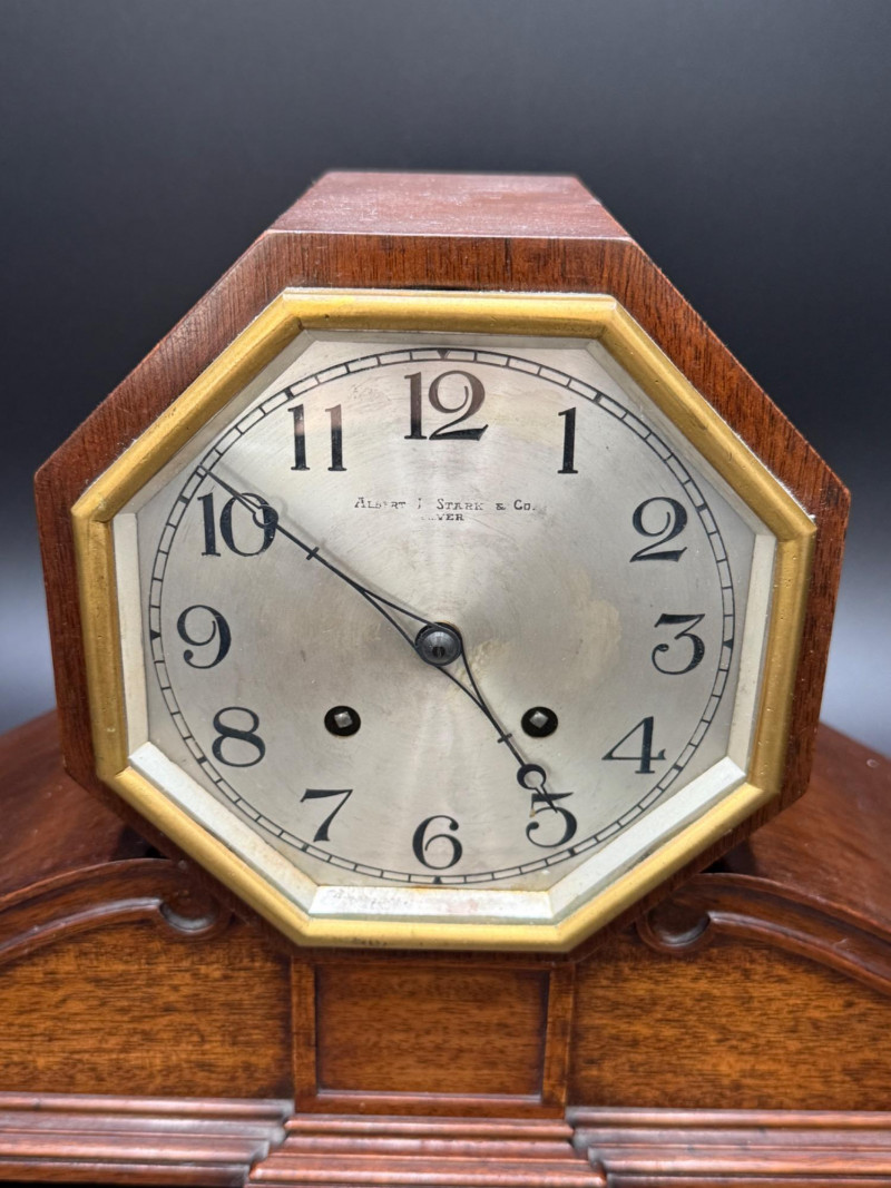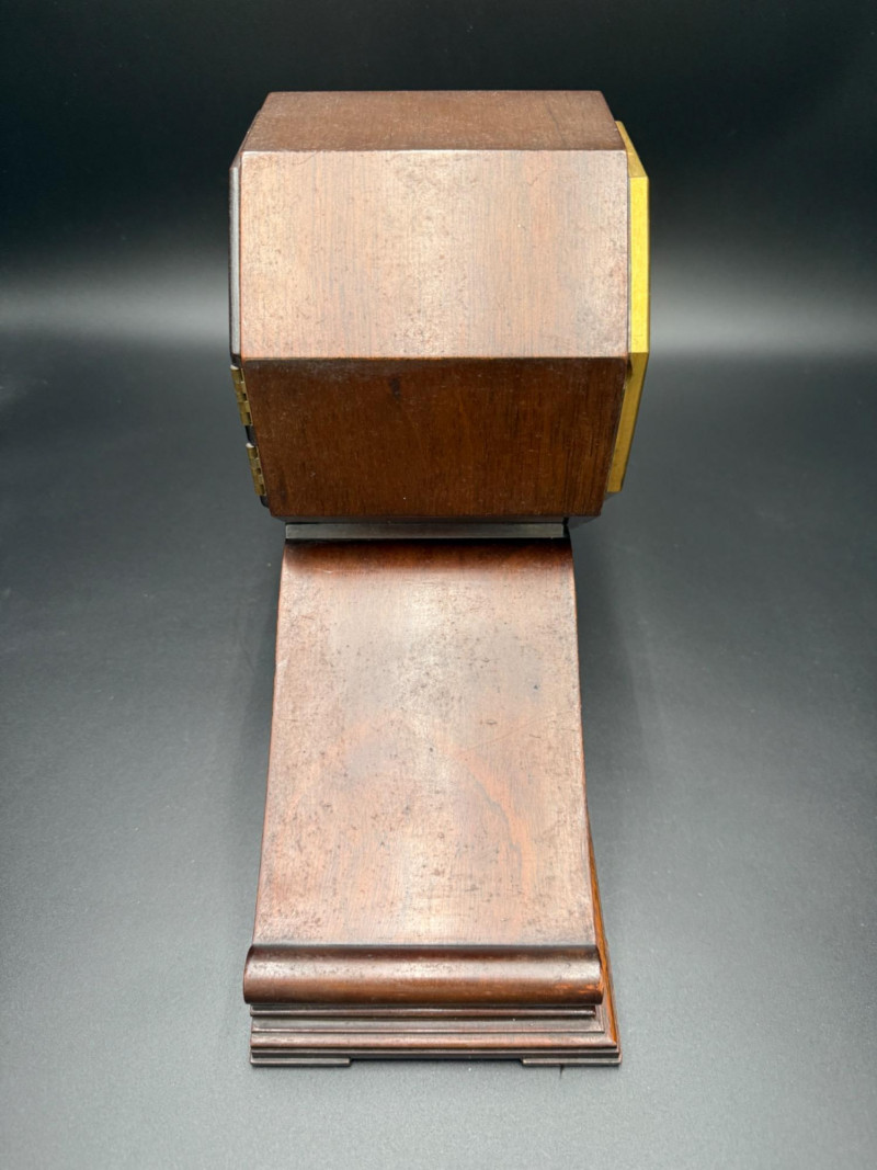 Seth Thomas Wooden Mantle Clock Seth Thomas wooden mantle clock with octagonal face, brass bezel, and mechanical movement. Service label dated 1987. Note: Functionality untested.