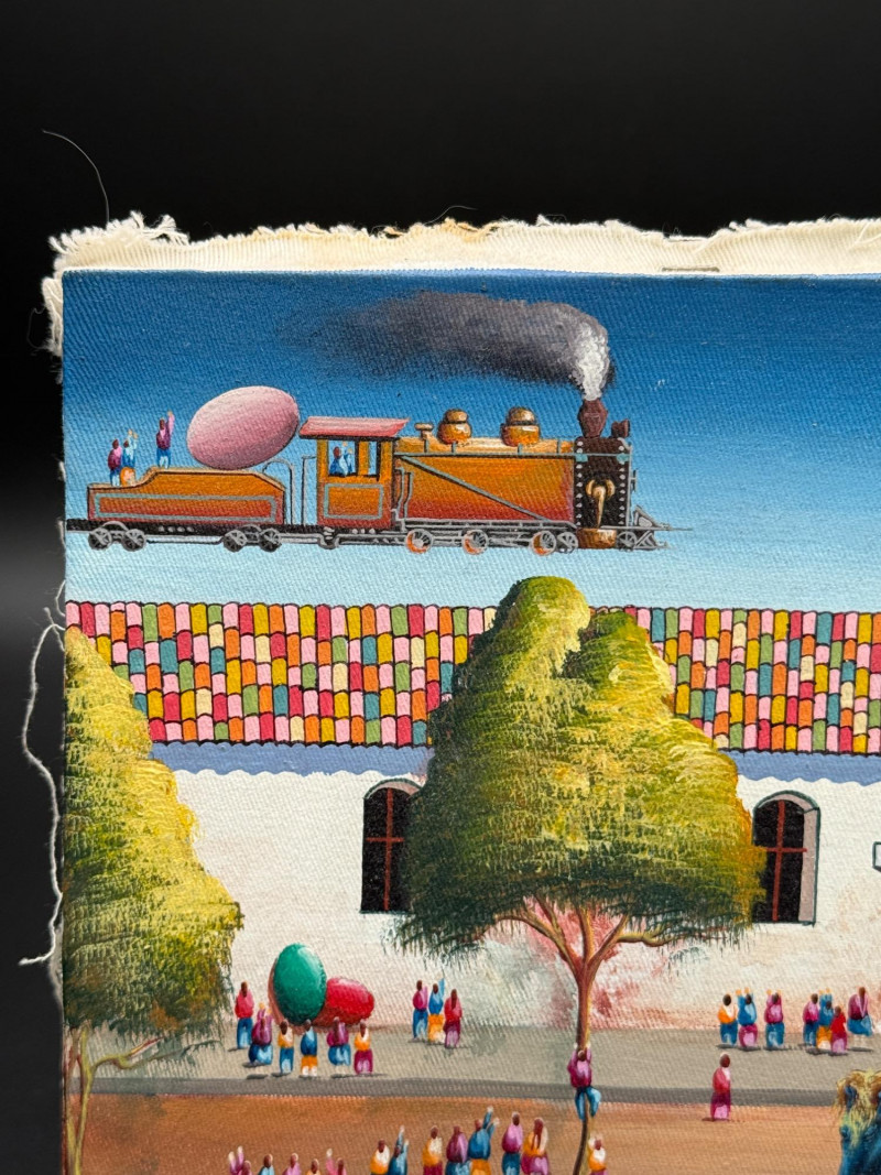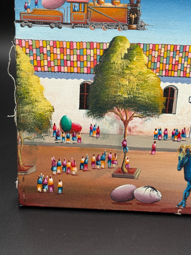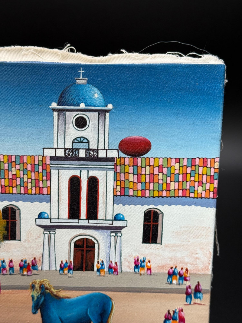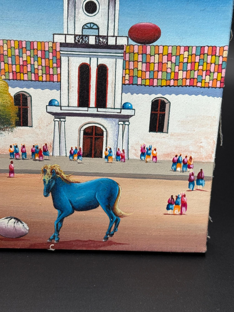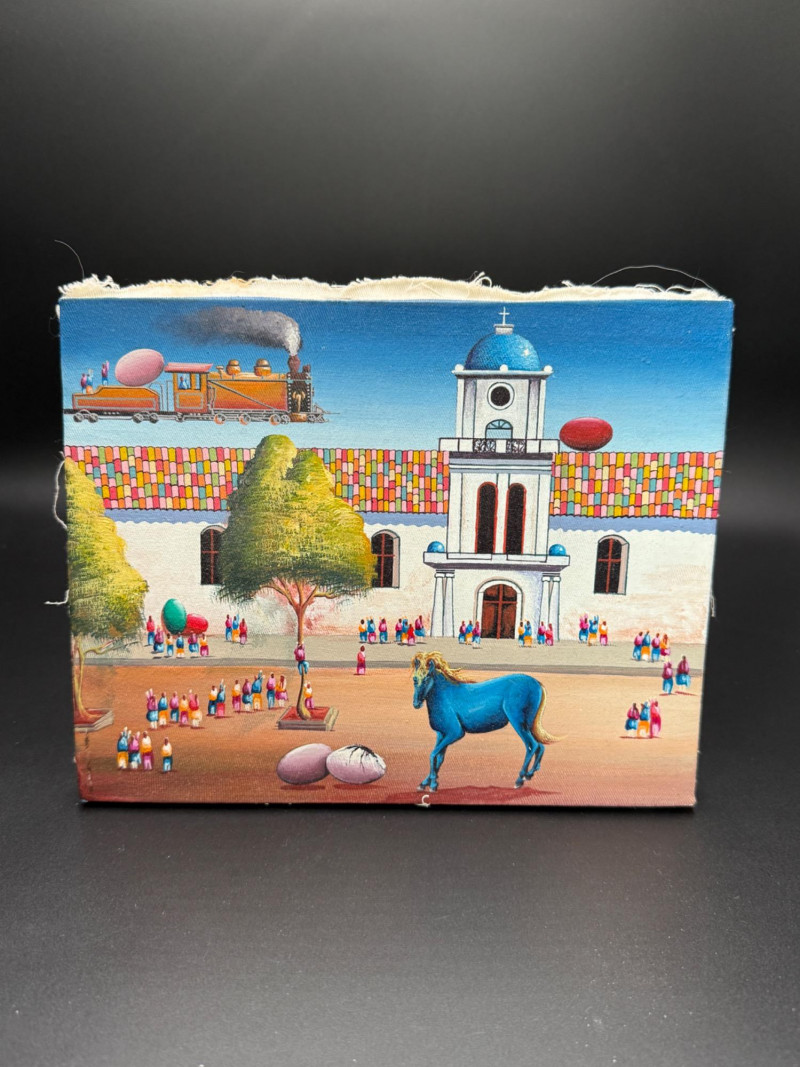 Latin Style Acrylic Painting on Canvas Acrylic on unstretched canvas showing a town scene with a church, blue horse, crowd of figures, and a train above a multicolored wall. Edges are frayed. Measurements: 9.75 x 8 in.