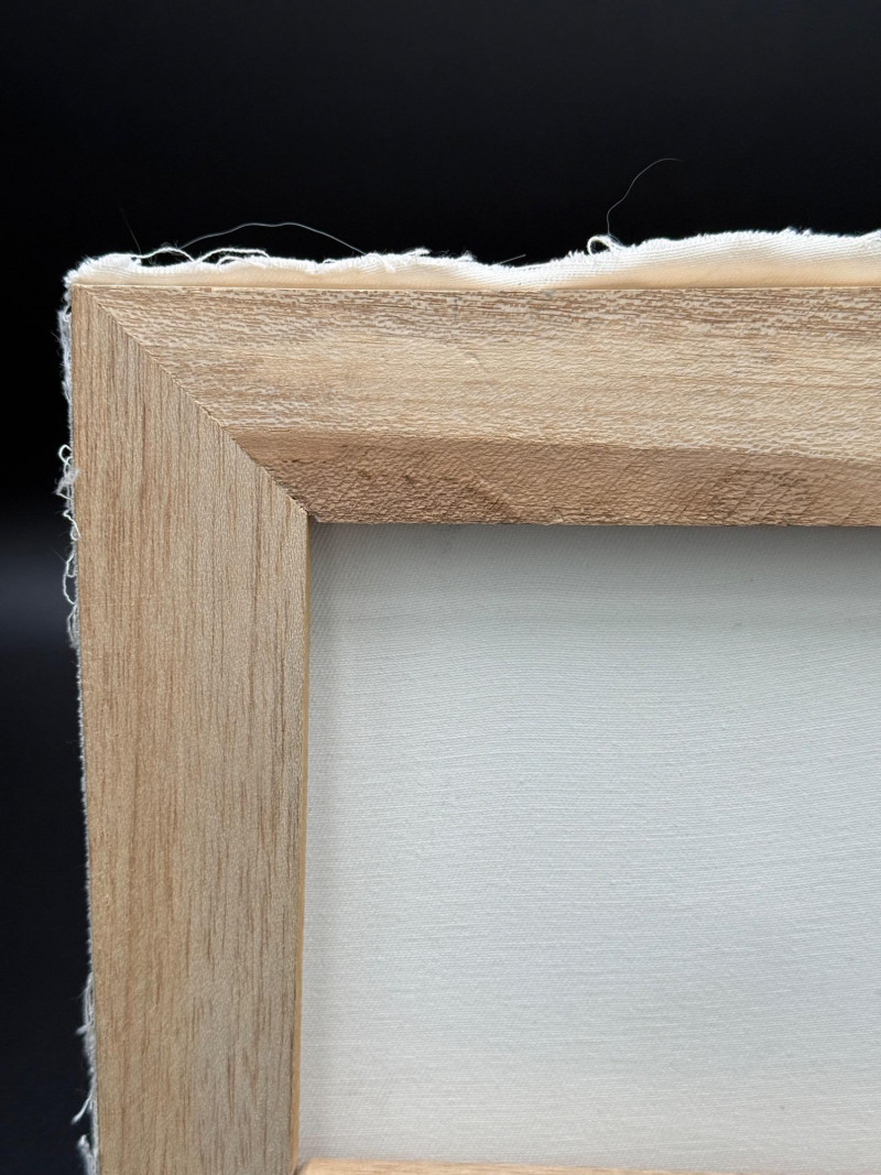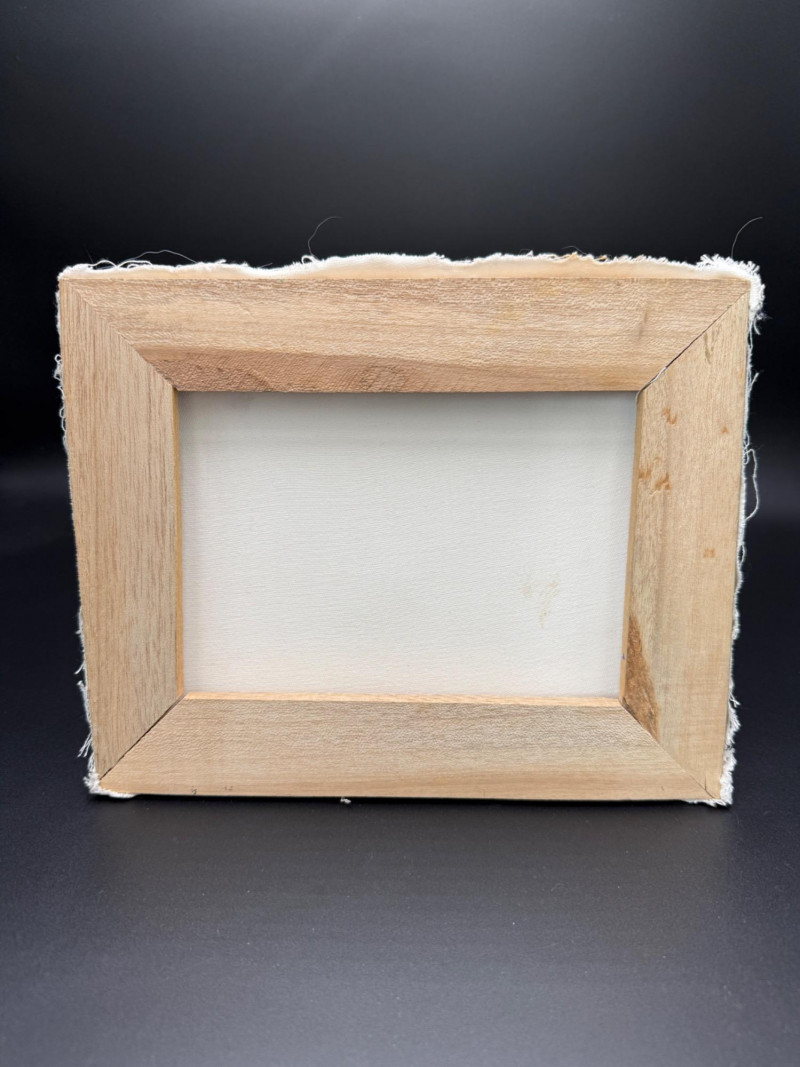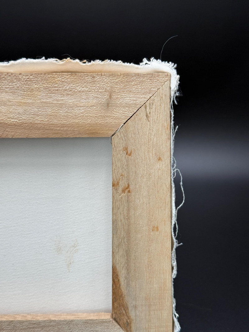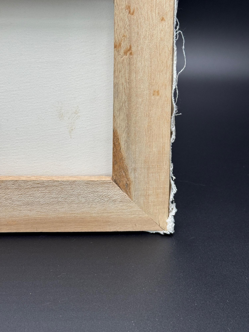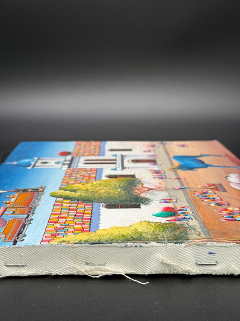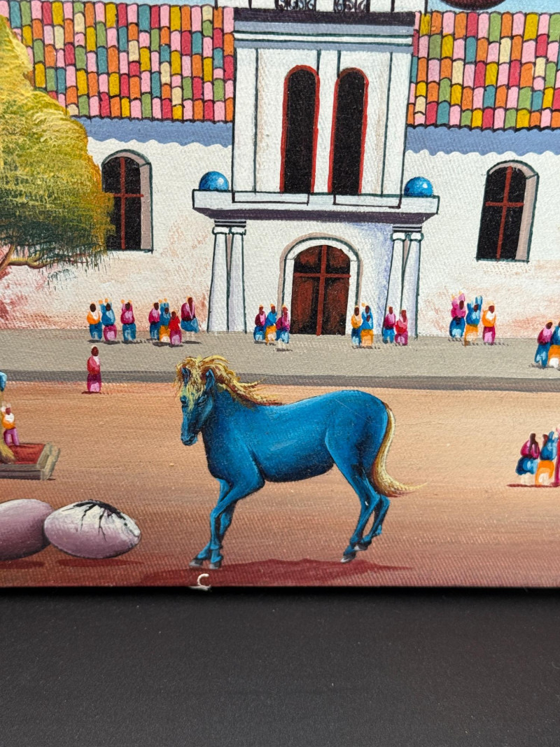 Latin Style Acrylic Painting on Canvas Acrylic on unstretched canvas showing a town scene with a church, blue horse, crowd of figures, and a train above a multicolored wall. Edges are frayed. Measurements: 9.75 x 8 in.