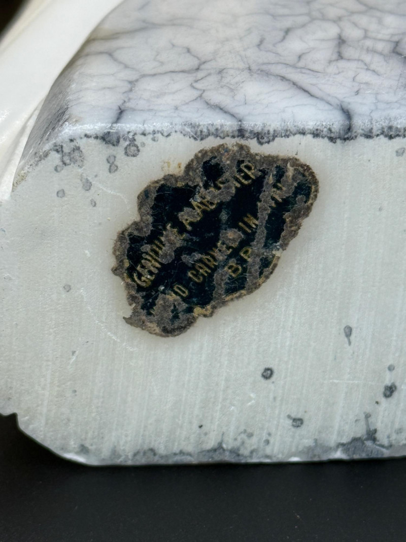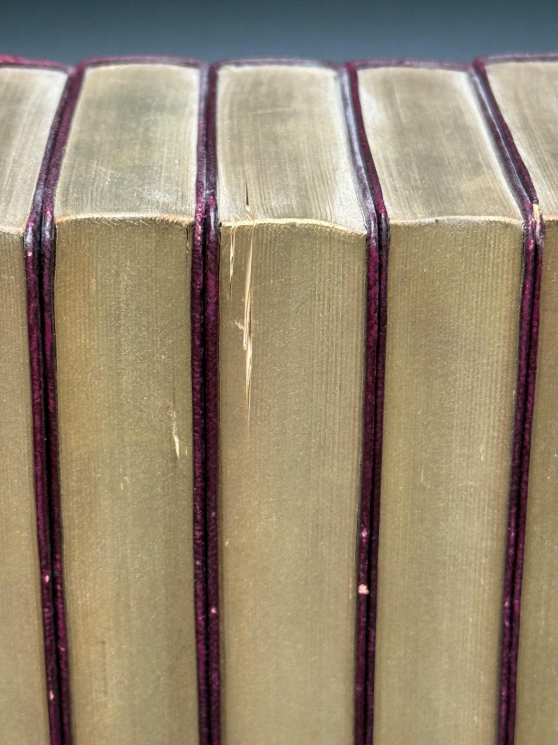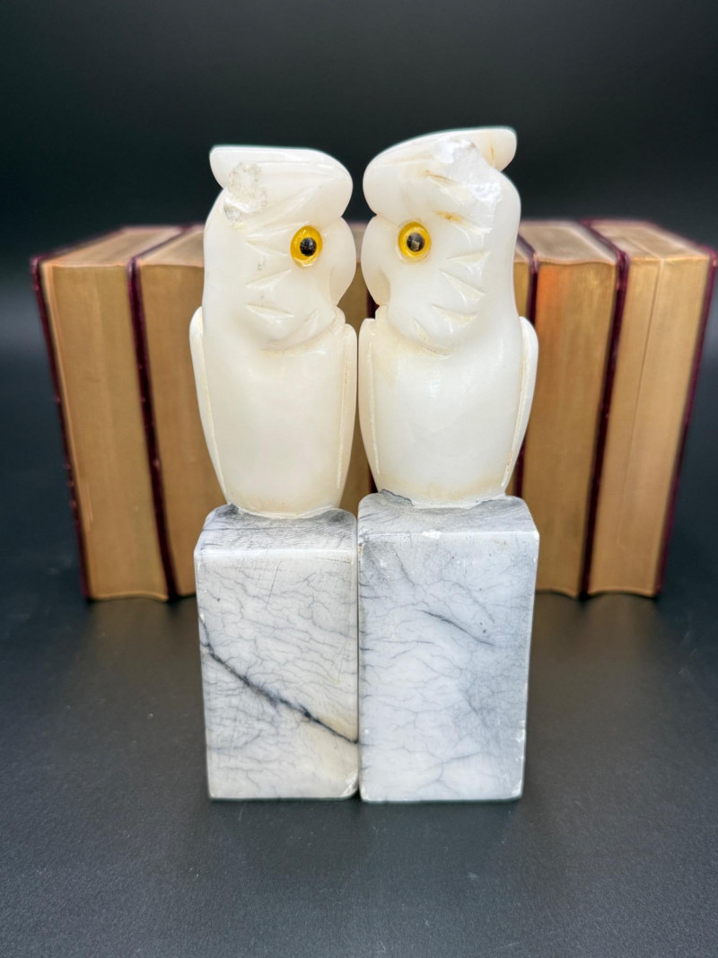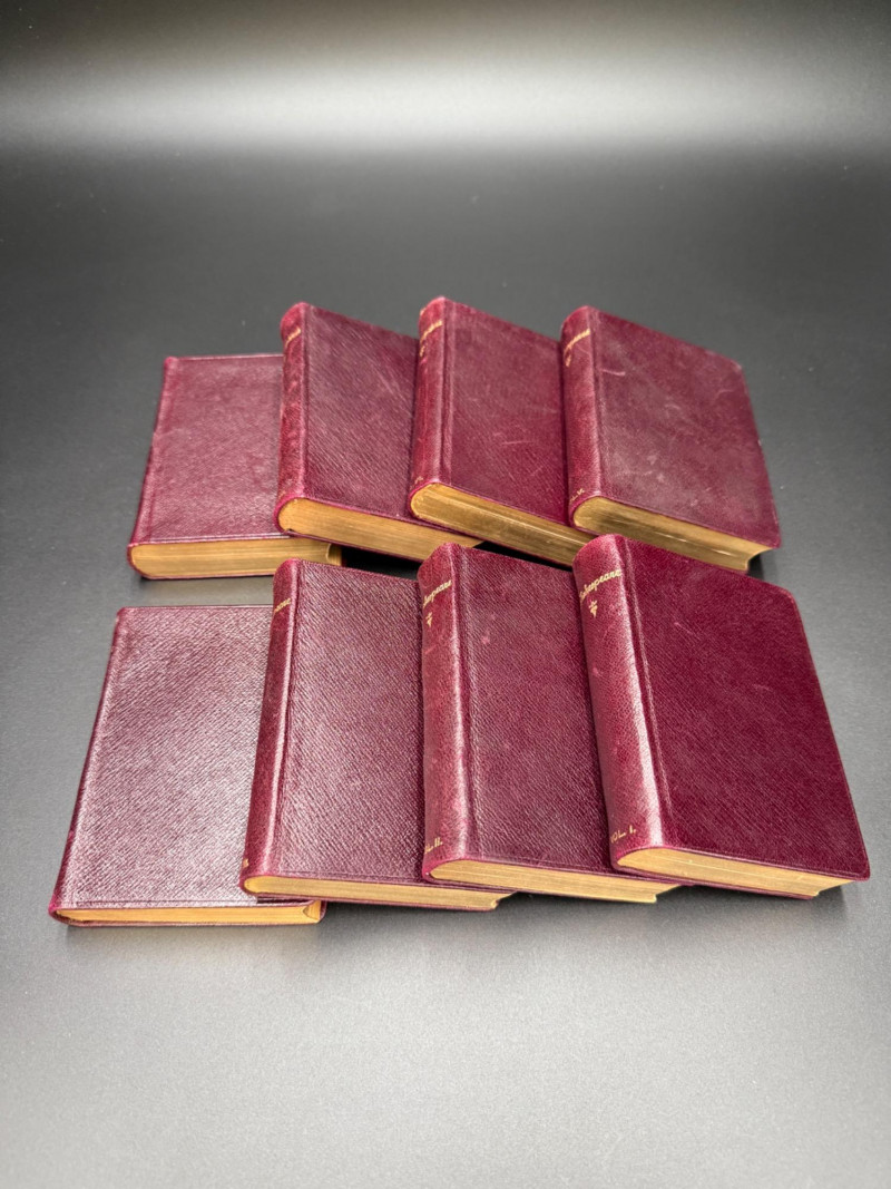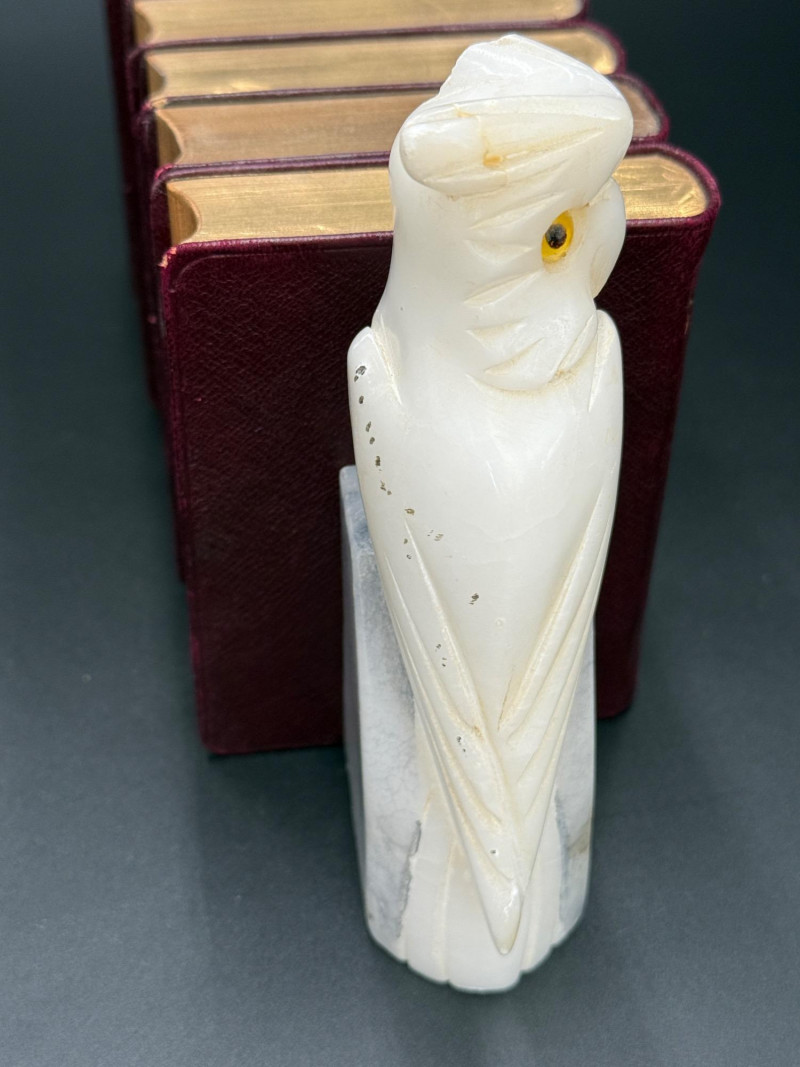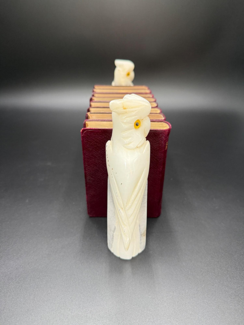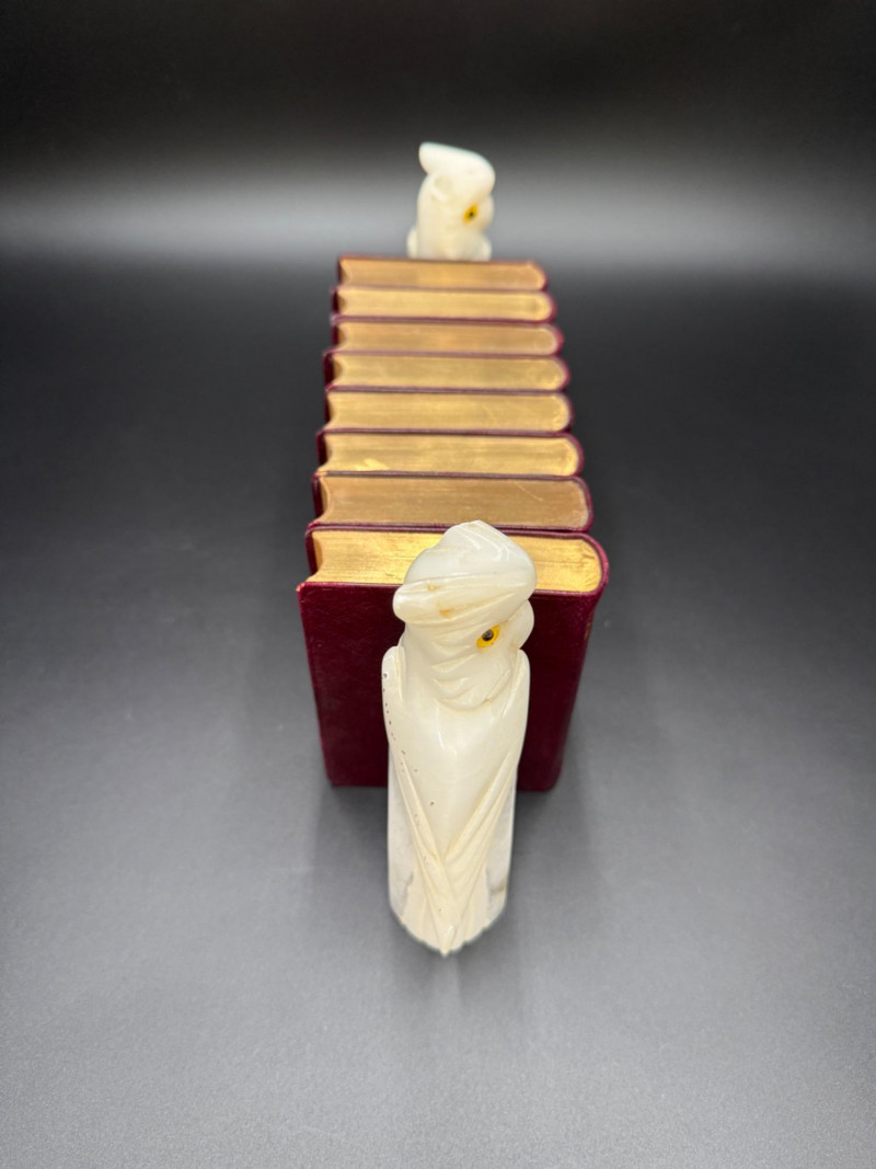 Set of 8 red-bound Shakespeare volumes with gilt edges, held by stone owl bookends. Owls have yellow eyes and marbled bases marked on the bottom.