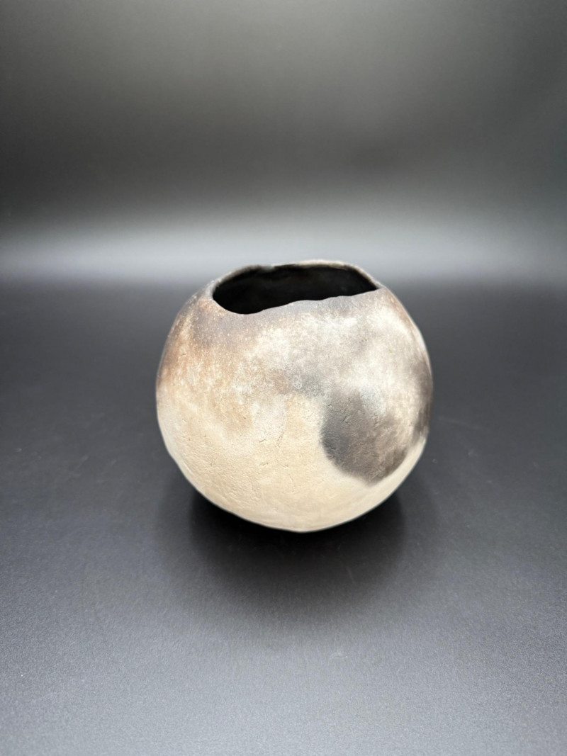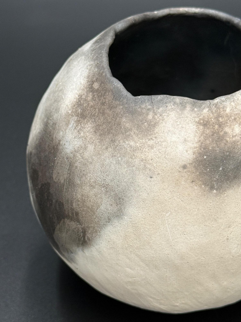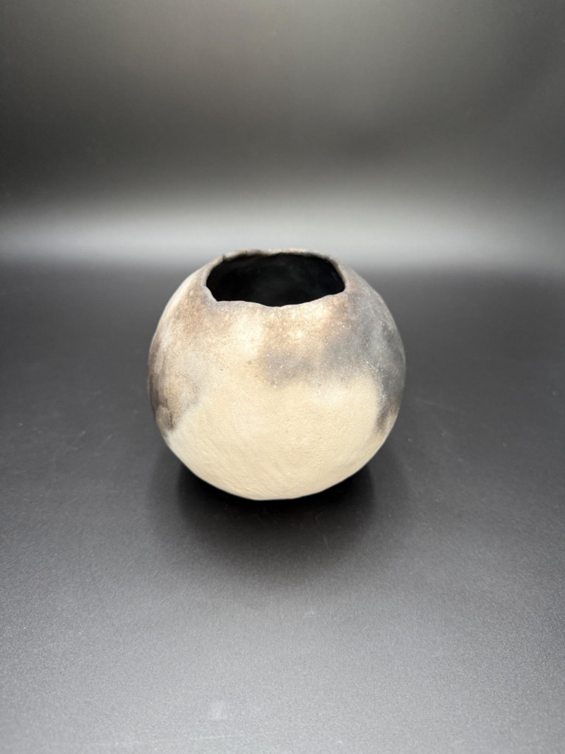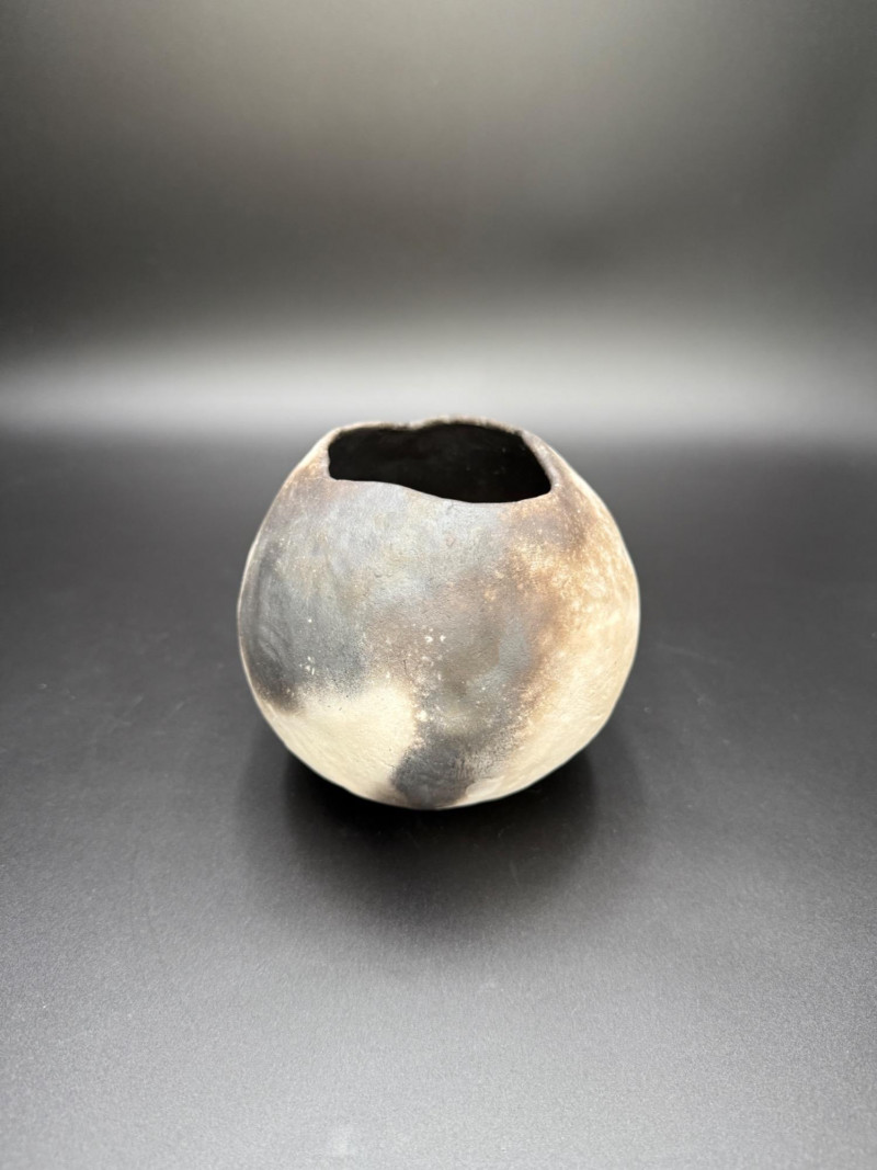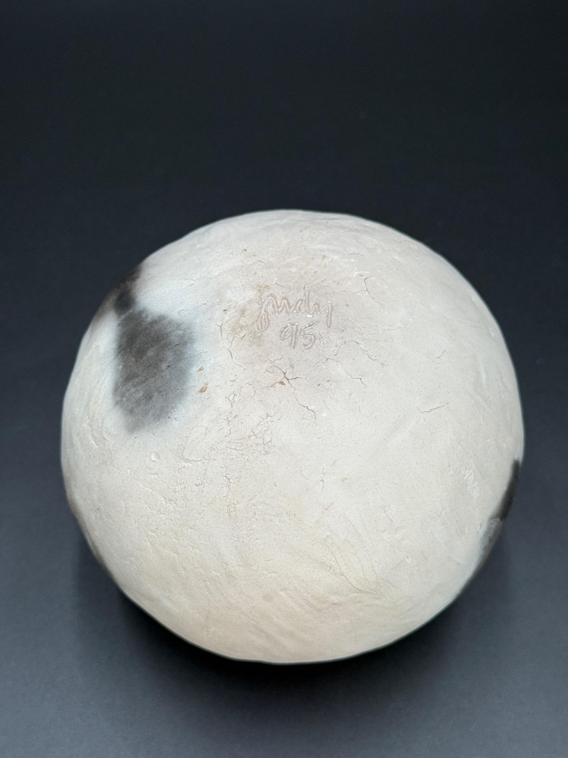 Raku Wood-Fired Pottery Hand-formed spherical vessel with a wide opening and irregular rim. The surface displays a mix of natural tones including white, gray, and dark smoke markings from the Raku firing process. The interior appears unglazed. Signed “Judy 95” at the base. Dimensions: 4.5 x 5 inches.