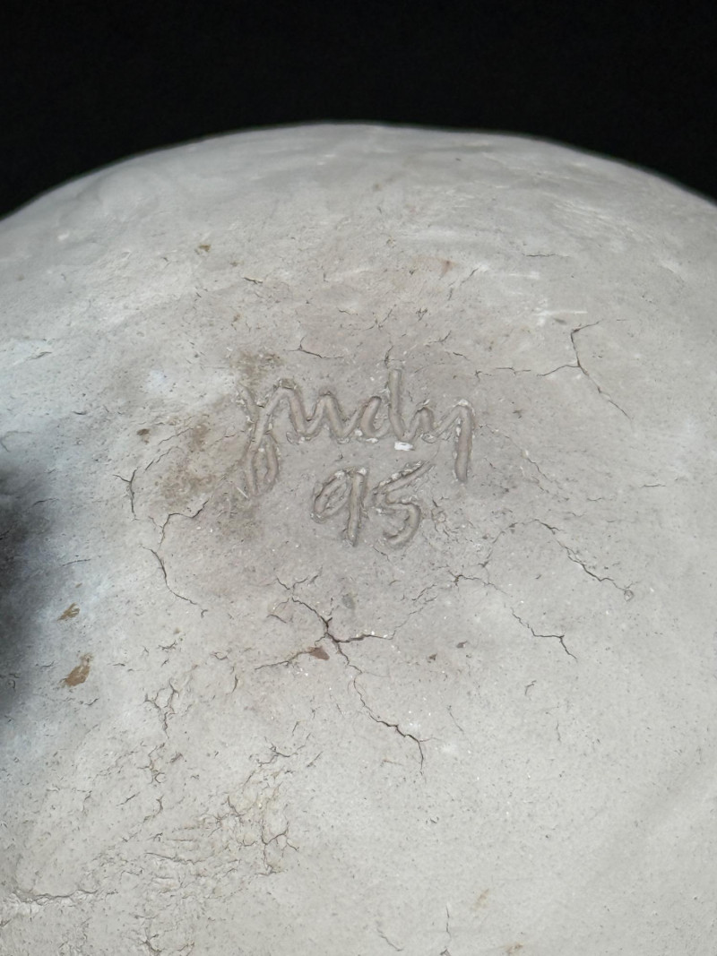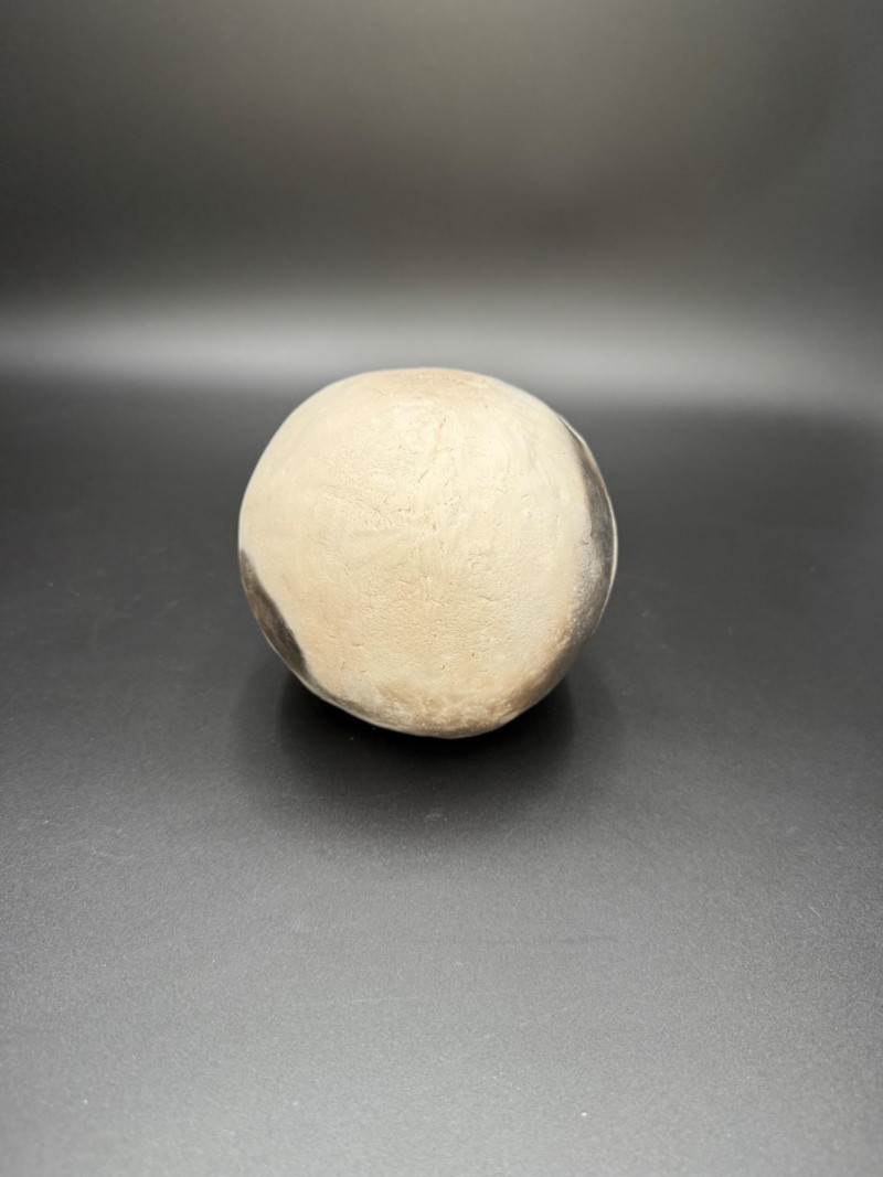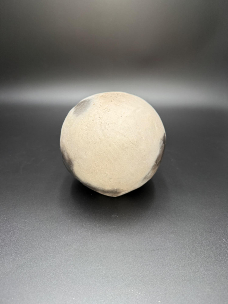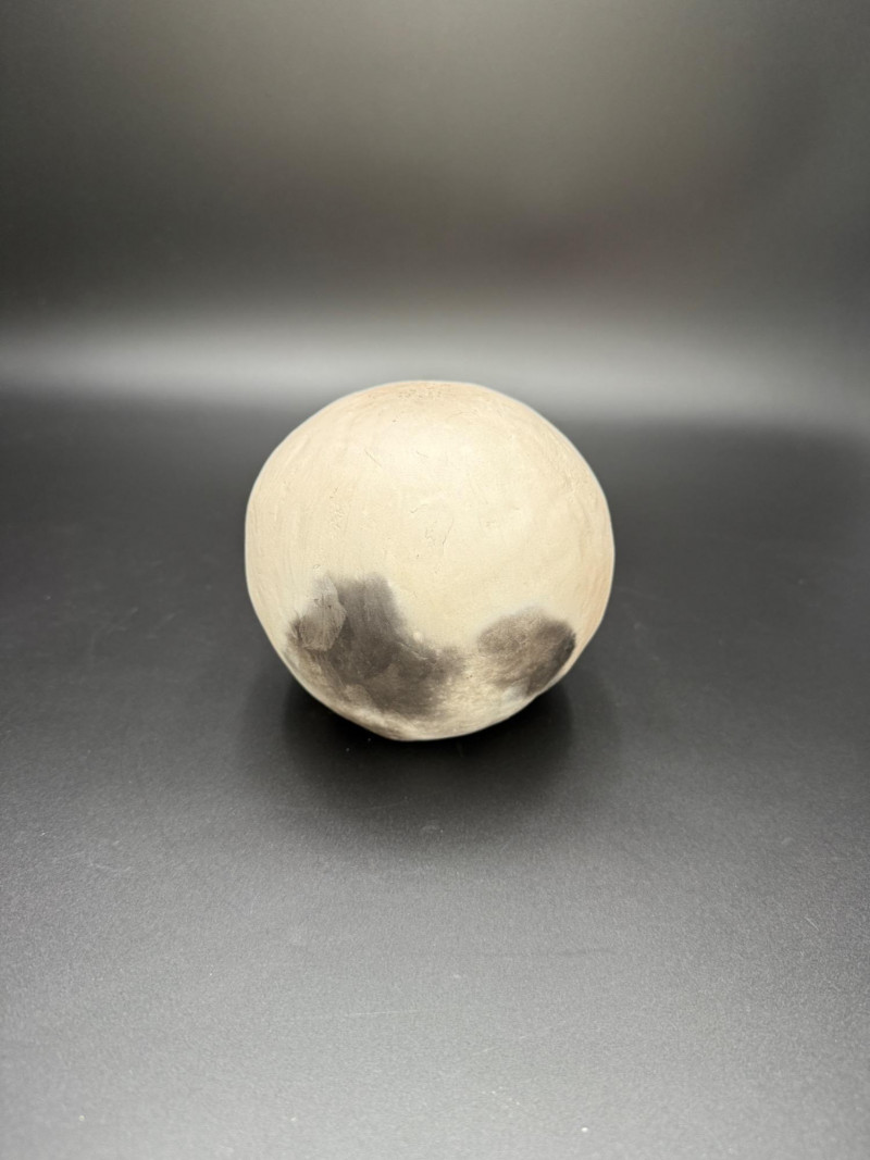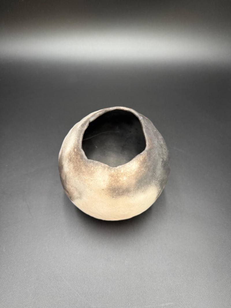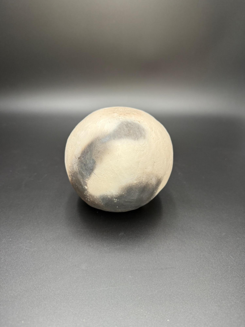 Raku Wood-Fired Pottery Hand-formed spherical vessel with a wide opening and irregular rim. The surface displays a mix of natural tones including white, gray, and dark smoke markings from the Raku firing process. The interior appears unglazed. Signed “Judy 95” at the base. Dimensions: 4.5 x 5 inches.