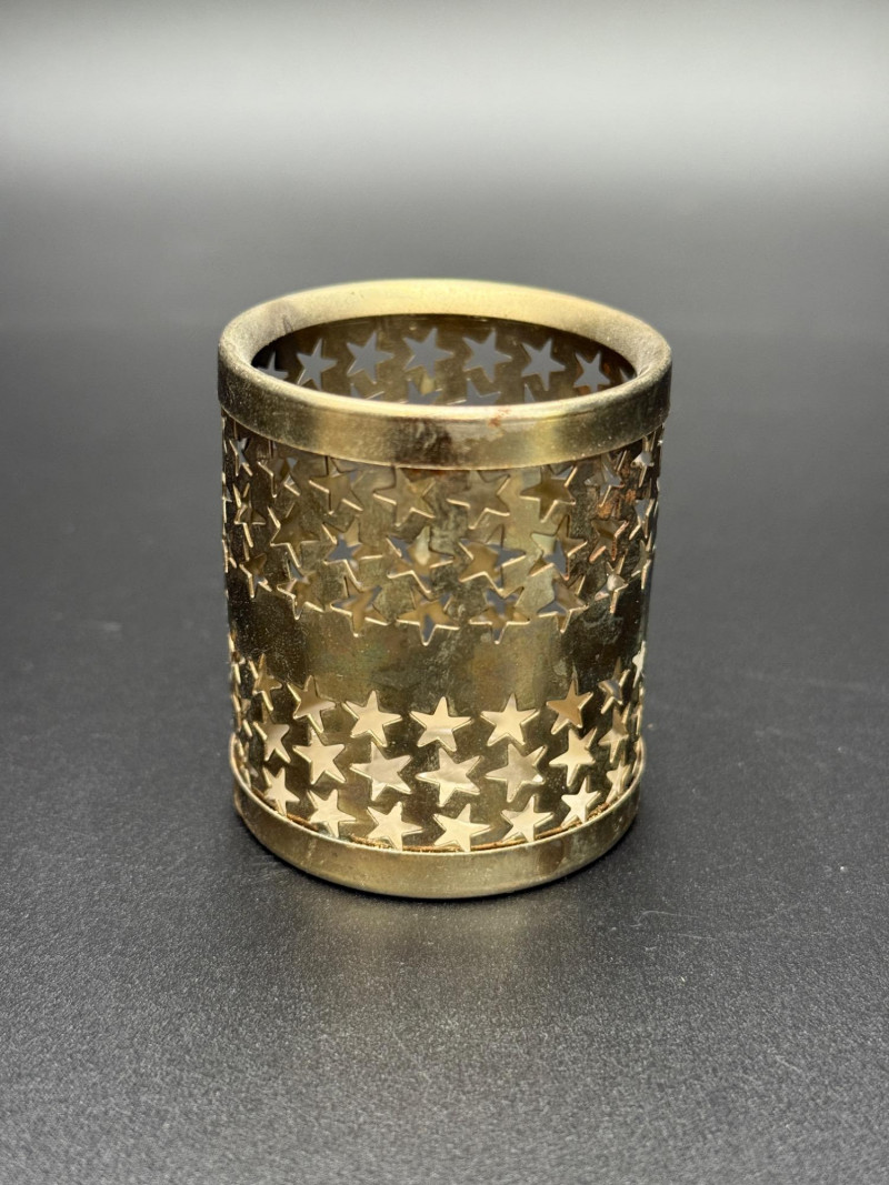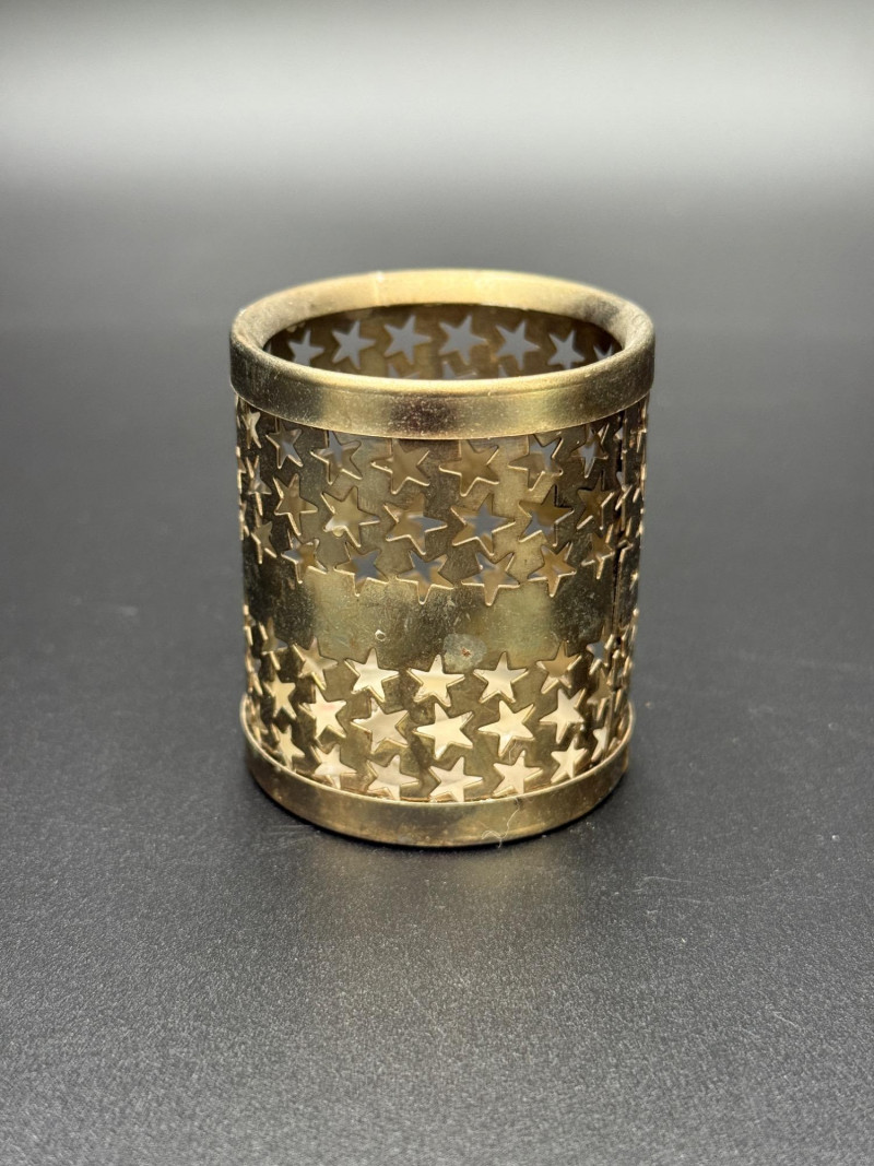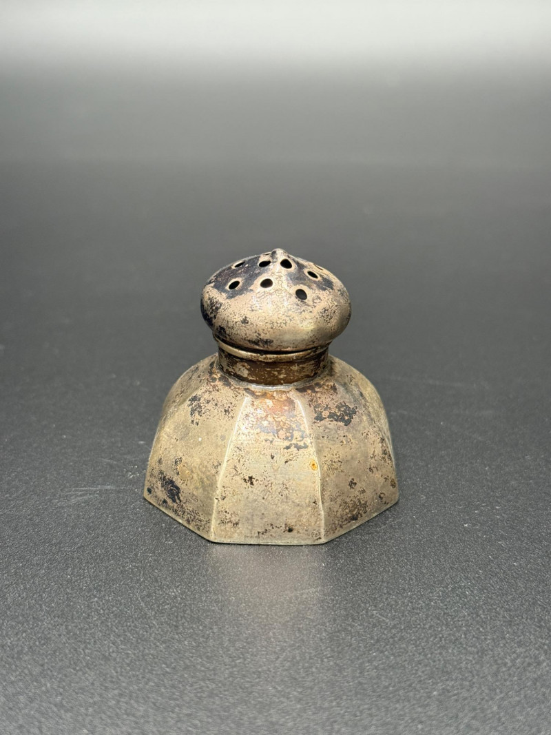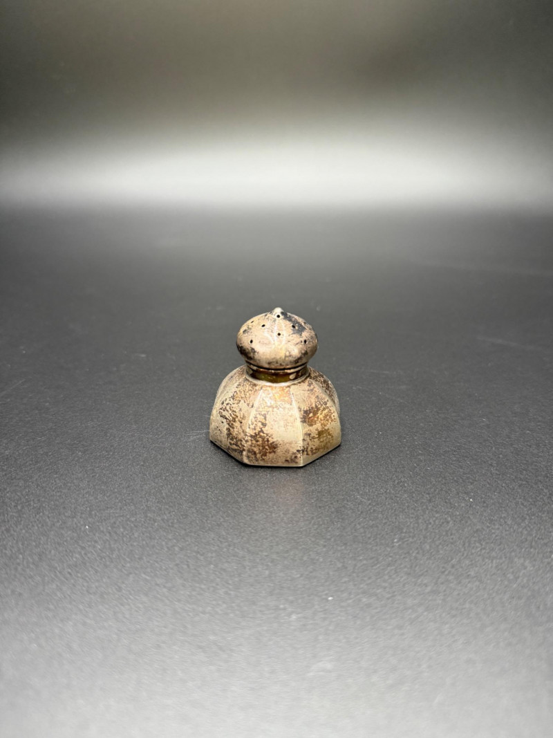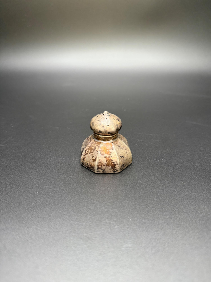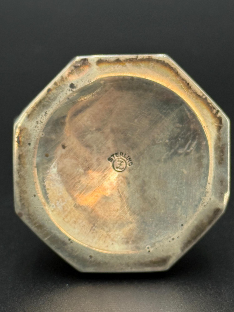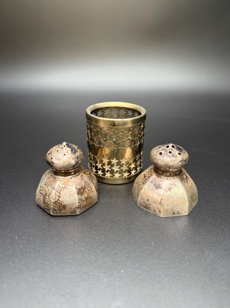 Sterling Salt and Pepper Shakers with Candle Holder Set includes one pair of sterling silver salt and pepper shakers, along with one cylindrical metal candle holder featuring star and square cutouts. Measurements: Salt and pepper shakers: 1.5 in tall Candle holder: 2 in tall Note: The candle holder is not sterling.