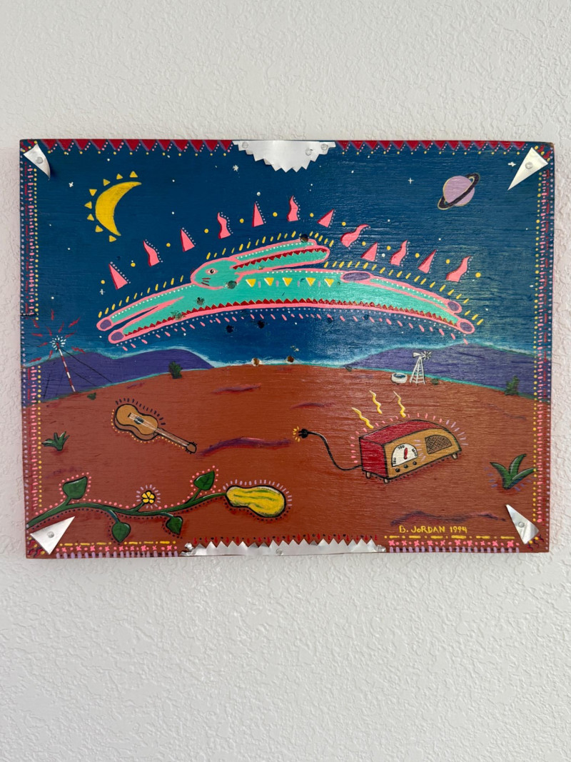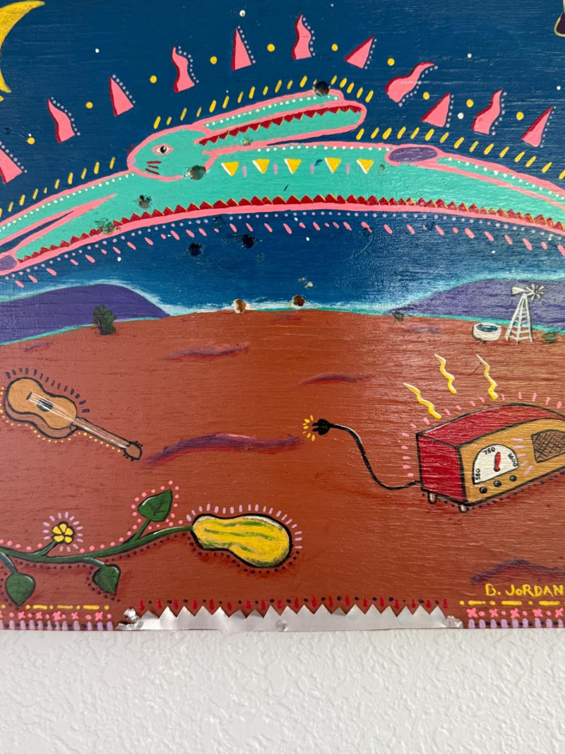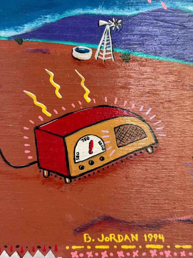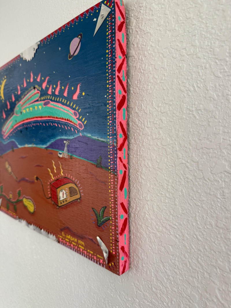 Double-Sided Outsider Folk Art on Wood – Desert Rabbit Scene by B. Jordan (Signed 1994) This striking double-sided outsider folk art painting, signed by artist B. Jordan and dated 1994, captures the playful spirit and surreal imagination characteristic of self-taught Americana artists. Painted on a reclaimed wooden panel, each side tells its own story using bold colors, rustic texture, and a touch of humor. Side A (Primary Display – Signed & Dated 1994): Side B (Reverse – Artist-Marked): Details: Artist: B. Jordan Signed and dated: 1994 Medium: Acrylic on reclaimed wood Format: Double-sided painting Approximate dimensions: 12" x 8" Condition: Good vintage condition; back features intentional artist mark (“X”) A rare and compelling piece of original outsider art, full of narrative charm and southwestern symbolism. A wonderful find for collectors of folk art, Americana, or unique hand-painted works with story and soul.