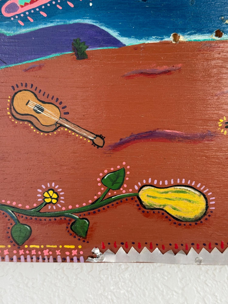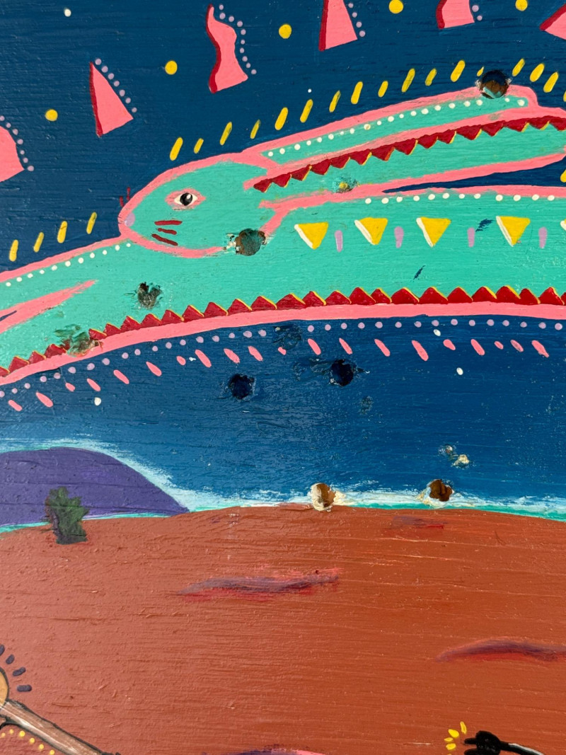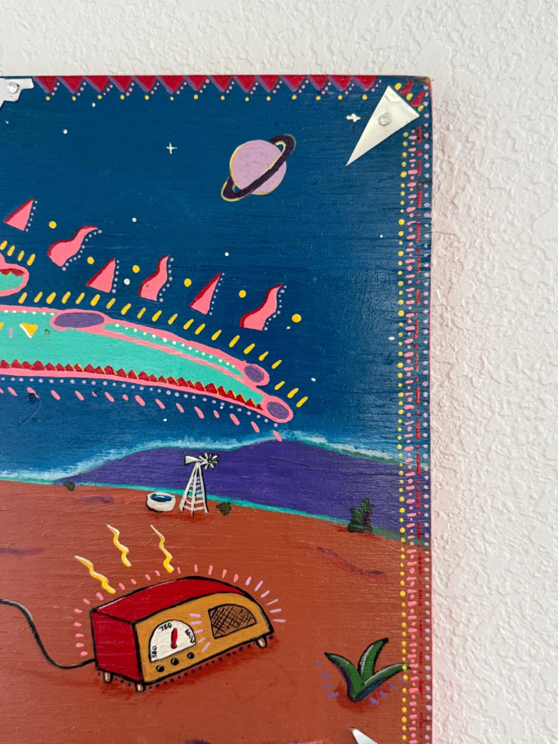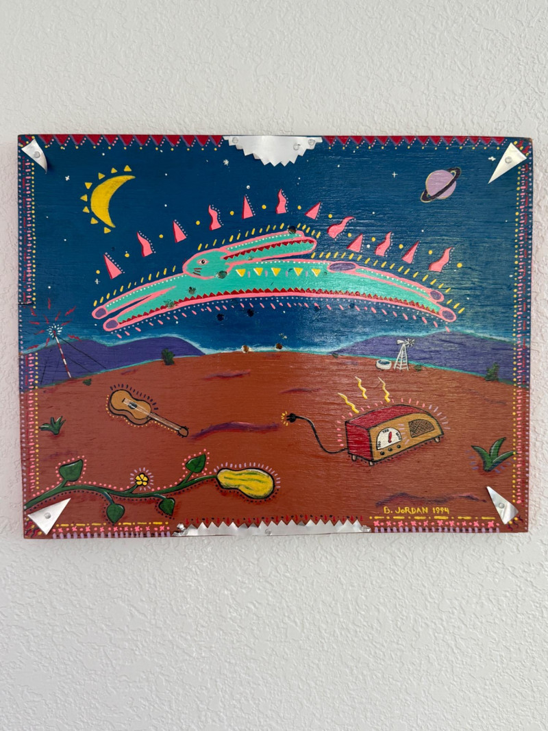 Double-Sided Outsider Folk Art on Wood – Desert Rabbit Scene by B. Jordan (Signed 1994) This striking double-sided outsider folk art painting, signed by artist B. Jordan and dated 1994, captures the playful spirit and surreal imagination characteristic of self-taught Americana artists. Painted on a reclaimed wooden panel, each side tells its own story using bold colors, rustic texture, and a touch of humor. Side A (Primary Display – Signed & Dated 1994): Side B (Reverse – Artist-Marked): Details: Artist: B. Jordan Signed and dated: 1994 Medium: Acrylic on reclaimed wood Format: Double-sided painting Approximate dimensions: 12" x 8" Condition: Good vintage condition; back features intentional artist mark (“X”) A rare and compelling piece of original outsider art, full of narrative charm and southwestern symbolism. A wonderful find for collectors of folk art, Americana, or unique hand-painted works with story and soul.