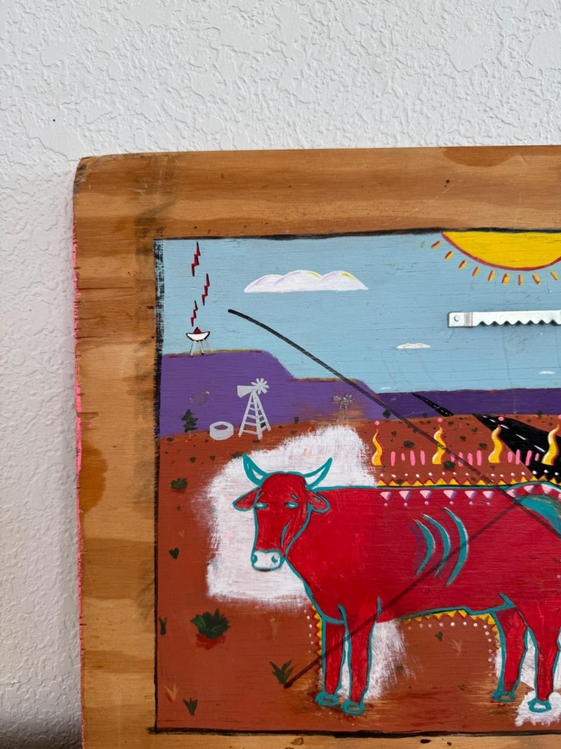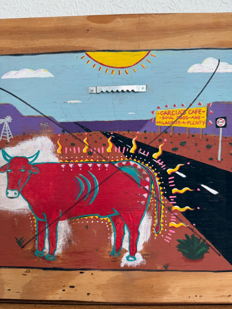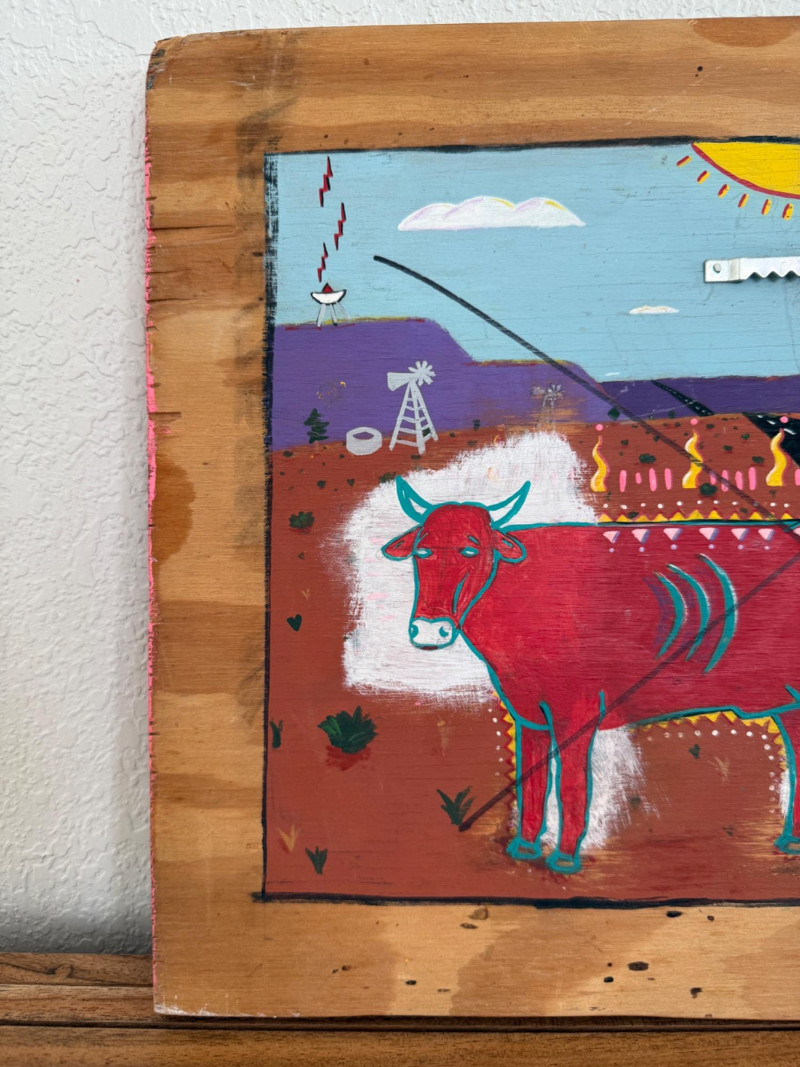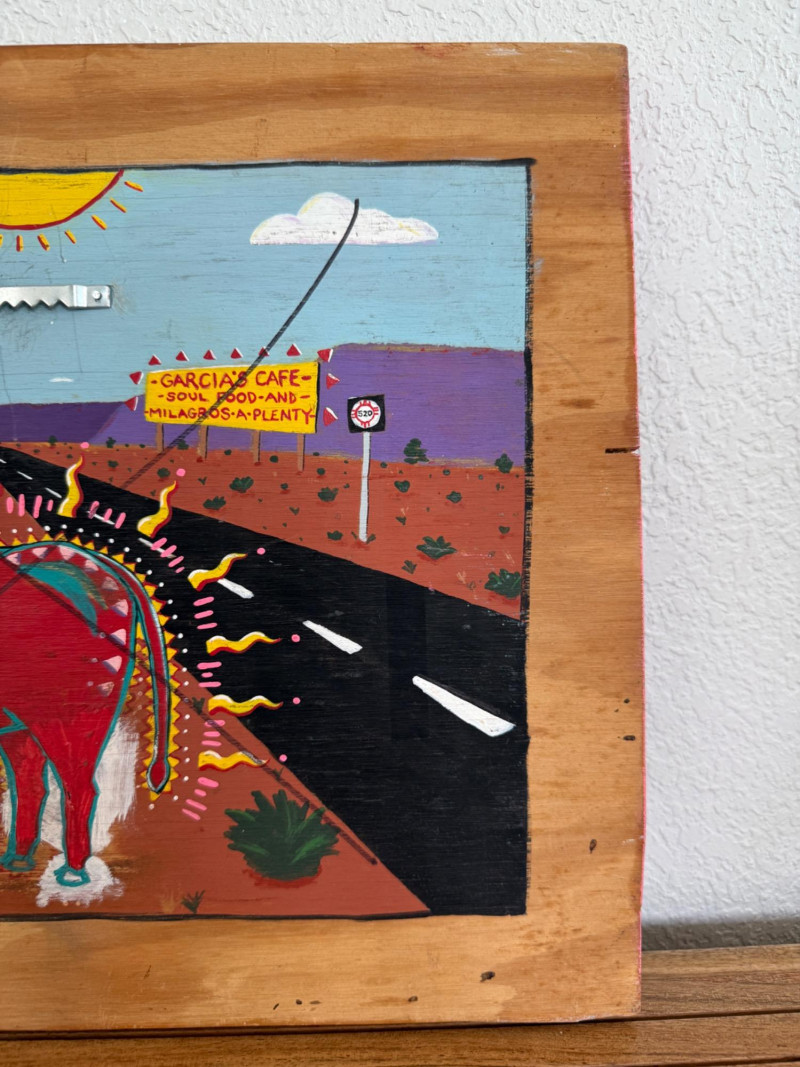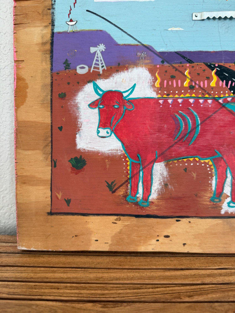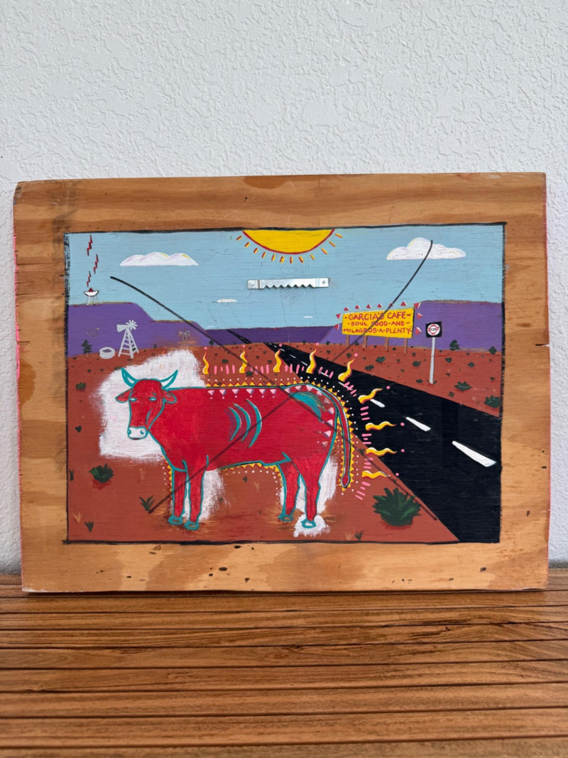 Depicts a roadside desert scene with a red cow, highway, diner sign, and surrounding landscape. A bold black “X” is painted across this side, likely by the artist, signaling it as a concept or composition that was intentionally marked out—adding a layer of personality and process to the piece.