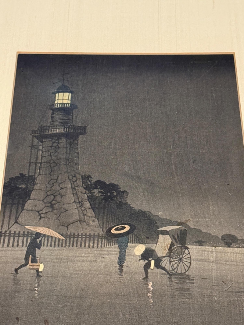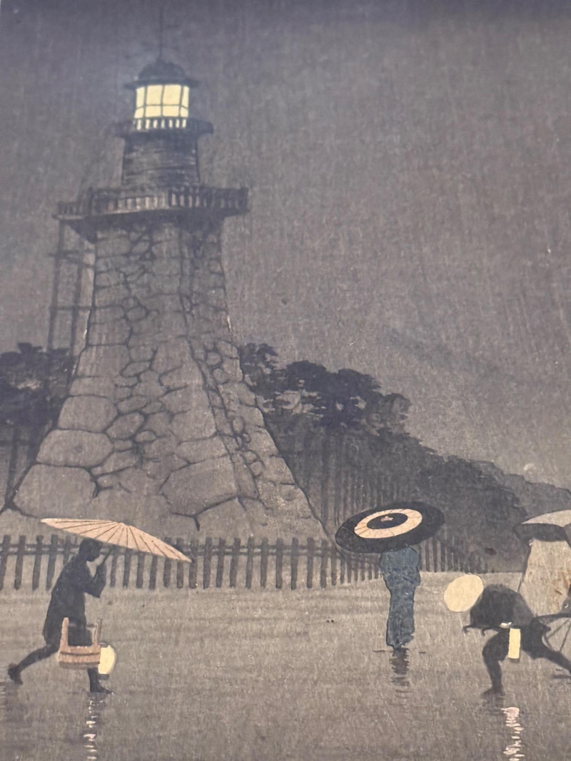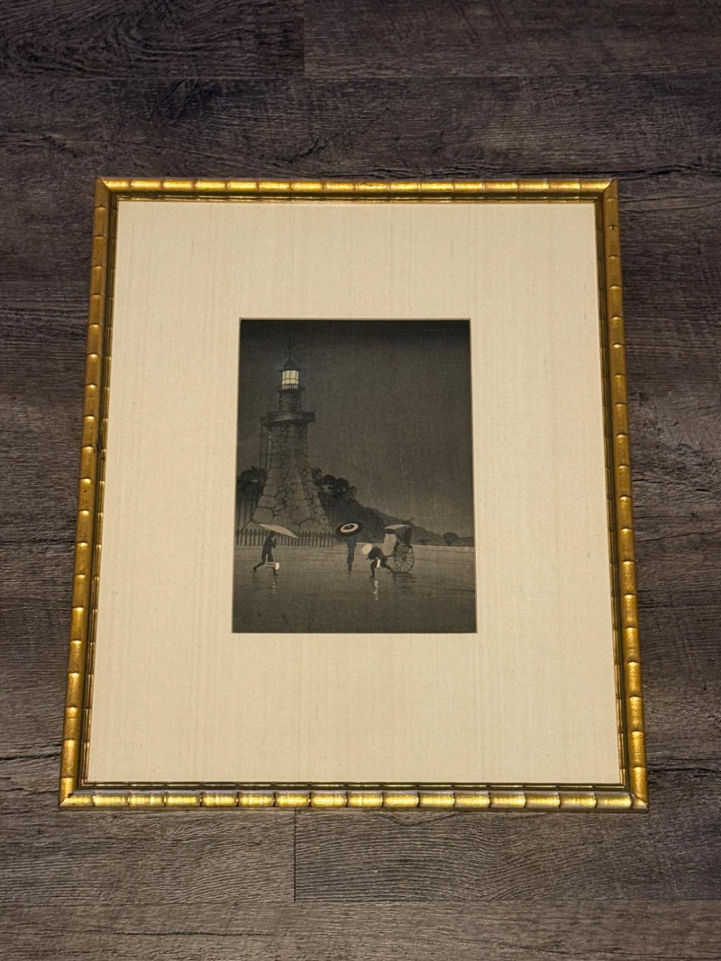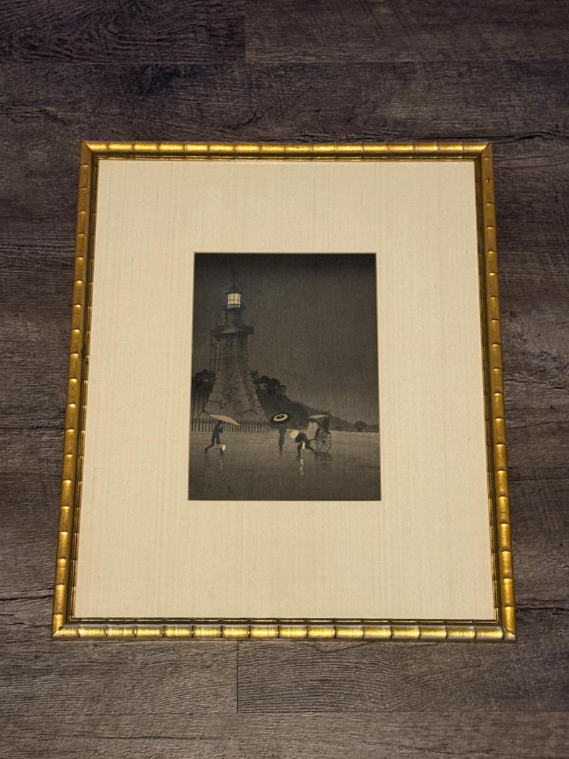 "Lighthouse at Hajikazaki" by Kawase Hasui – Japanese Print This evocative Japanese print, titled "Lighthouse at Hajikazaki", is a stunning work by renowned shin-hanga artist Kawase Hasui (1883–1957). Known for his poetic renderings of landscapes and cityscapes, Hasui masterfully captures the quiet beauty of a rainy evening, as figures with umbrellas pass before a towering stone lighthouse. The muted palette, reflective water, and subtle lighting evoke a serene, introspective mood. Details: Artist: Kawase Hasui Title: Lighthouse at Hajikazaki Medium: framed print Style: Shin-hanga (modern Japanese print movement) Era: Early to mid 20th century Subject: Lighthouse, rain, umbrellas, figures in motion 19" x 16" Hasui’s works are celebrated for their tranquil compositions and fine craftsmanship, and this piece is no exception. A perfect addition for collectors of Japanese art, lovers of coastal imagery, or those seeking a refined statement piece with historical and cultural significance