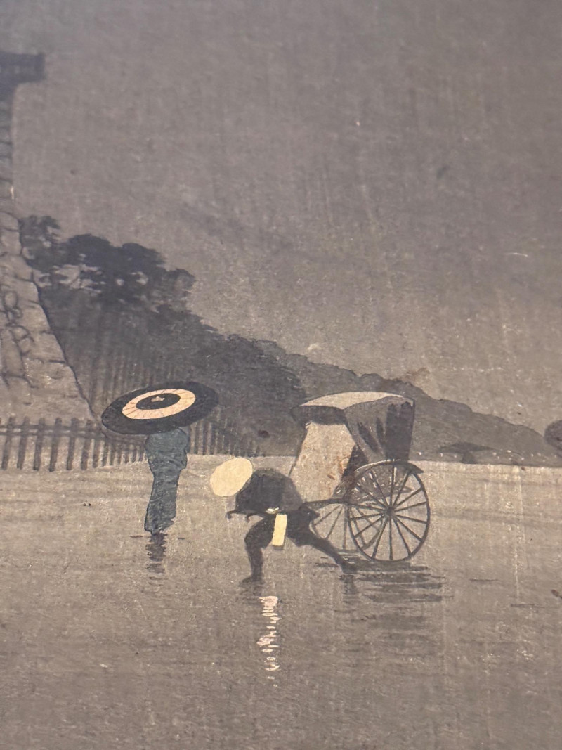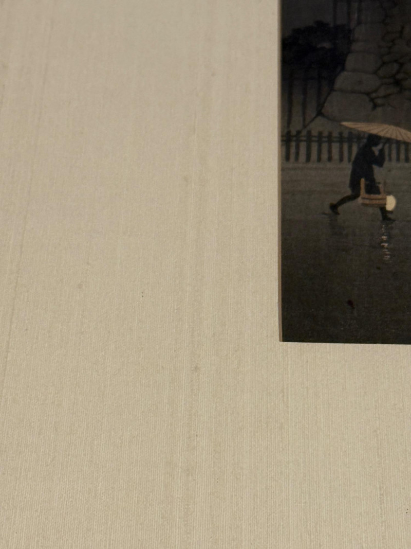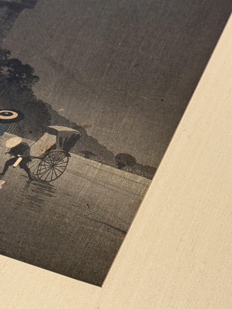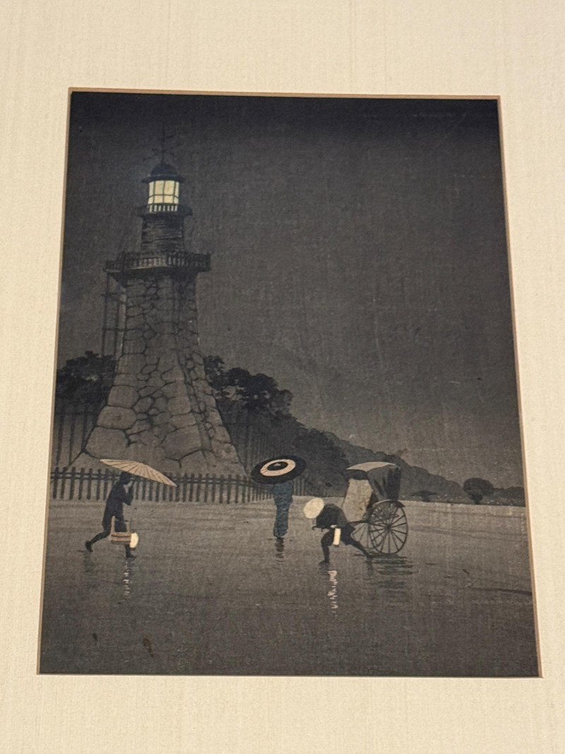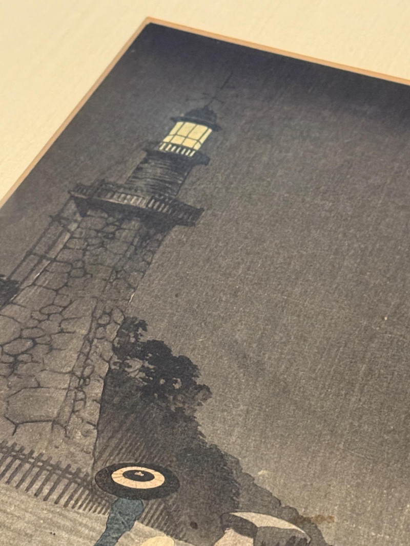 "Lighthouse at Hajikazaki" by Kawase Hasui – Japanese Print This evocative Japanese print, titled "Lighthouse at Hajikazaki", is a stunning work by renowned shin-hanga artist Kawase Hasui (1883–1957). Known for his poetic renderings of landscapes and cityscapes, Hasui masterfully captures the quiet beauty of a rainy evening, as figures with umbrellas pass before a towering stone lighthouse. The muted palette, reflective water, and subtle lighting evoke a serene, introspective mood. Details: Artist: Kawase Hasui Title: Lighthouse at Hajikazaki Medium: framed print Style: Shin-hanga (modern Japanese print movement) Era: Early to mid 20th century Subject: Lighthouse, rain, umbrellas, figures in motion 19" x 16" Hasui’s works are celebrated for their tranquil compositions and fine craftsmanship, and this piece is no exception. A perfect addition for collectors of Japanese art, lovers of coastal imagery, or those seeking a refined statement piece with historical and cultural significance