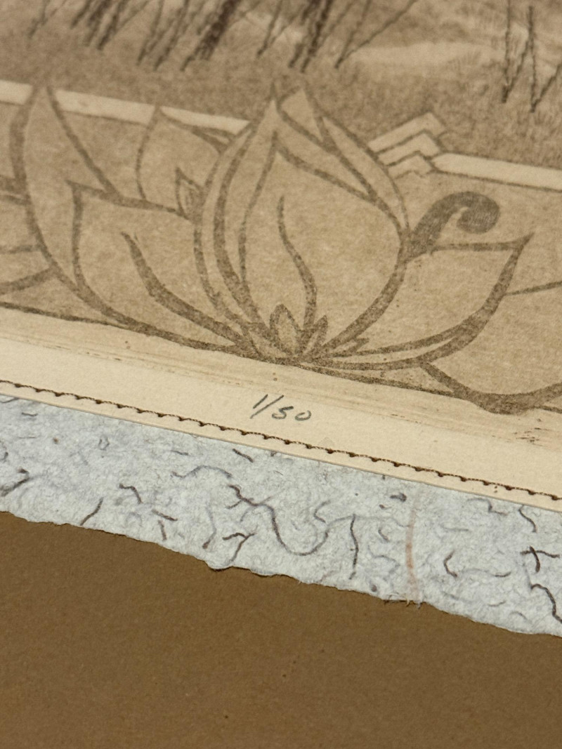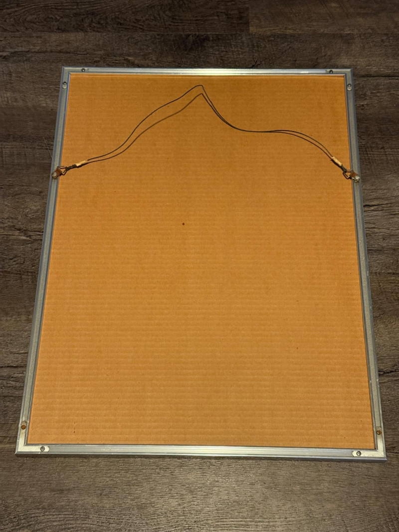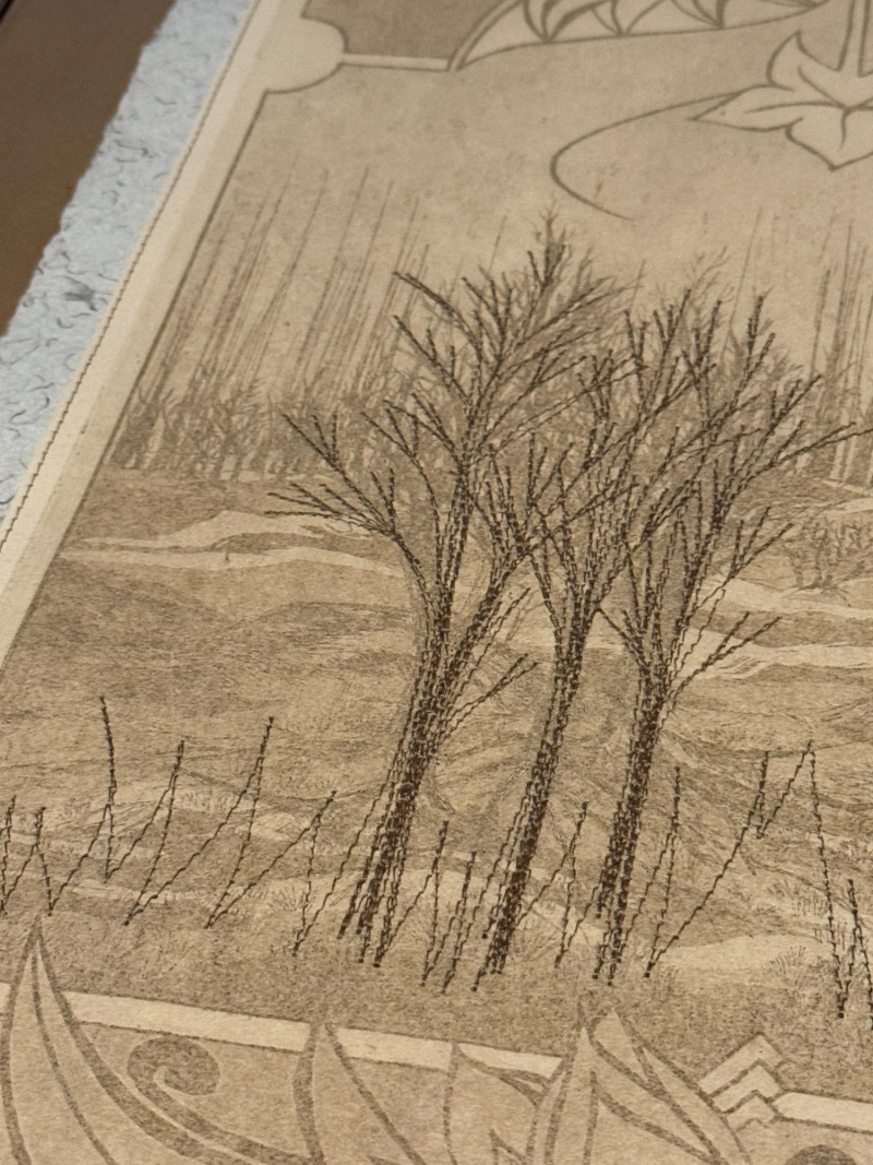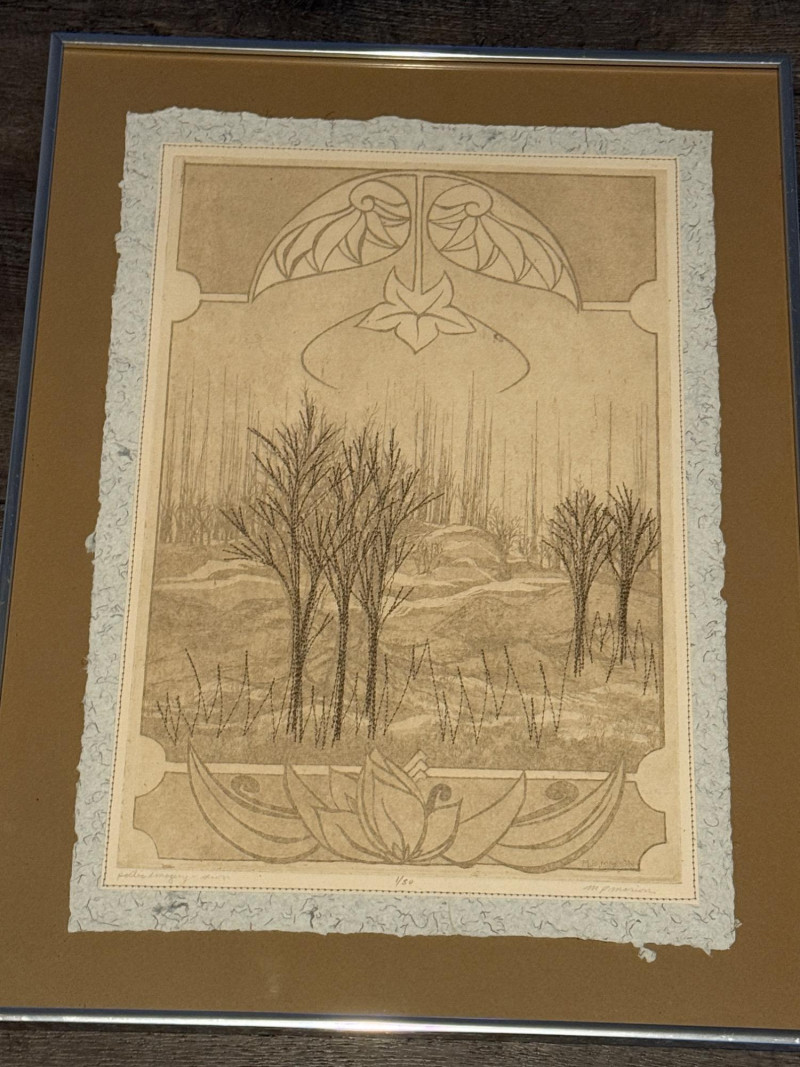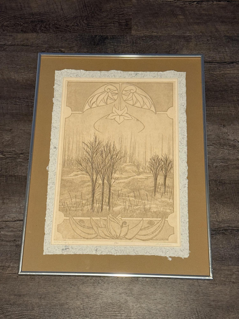 "Poetic Imagery – Sewn" by M.P. Marion This extraordinary etching by M.P. Marion, titled “Poetic Imagery – Sewn,” offers a contemplative view of a Wisconsin winter landscape, rendered with precision and poetic restraint. Stylized barren trees rise from gentle hills in fine, stitched-like linework—an intentional technique that evokes the feeling of both thread and ink, blending textile sensibility with natural observation. Framed within geometric Art Nouveau-style borders, the composition merges organic forms with architectural structure, drawing the viewer into a quiet narrative of place and pattern. The print is beautifully executed on handmade blue jean denim paper, adding rare material depth and textural richness. Hand-signed by the artist, M.P. Marion Limited edition: Numbered 1/50 – the very first in the series Professionally matted and framed for preservation and display This piece is a true collector's gem—melding regional artistry, unique material, and limited availability into one refined and soulful work. A special addition to any fine print, textile-inspired, or Midwestern art collection.