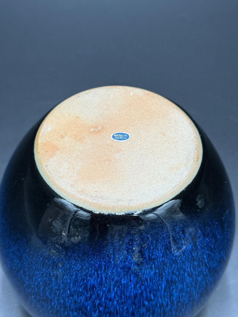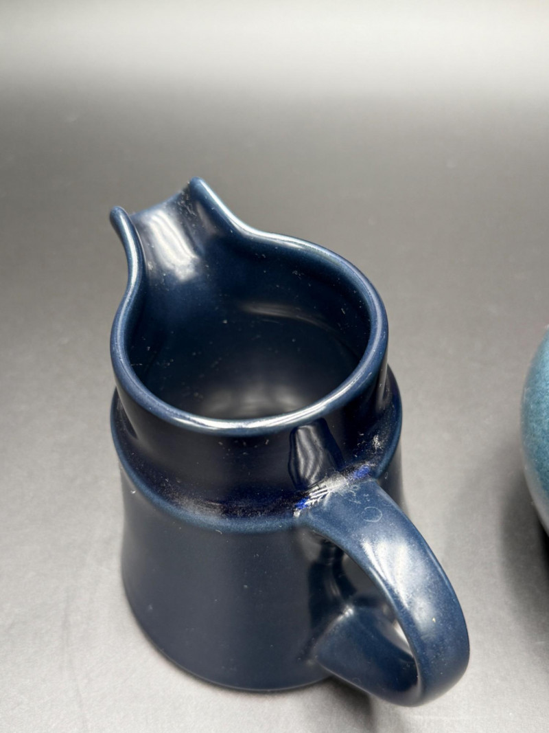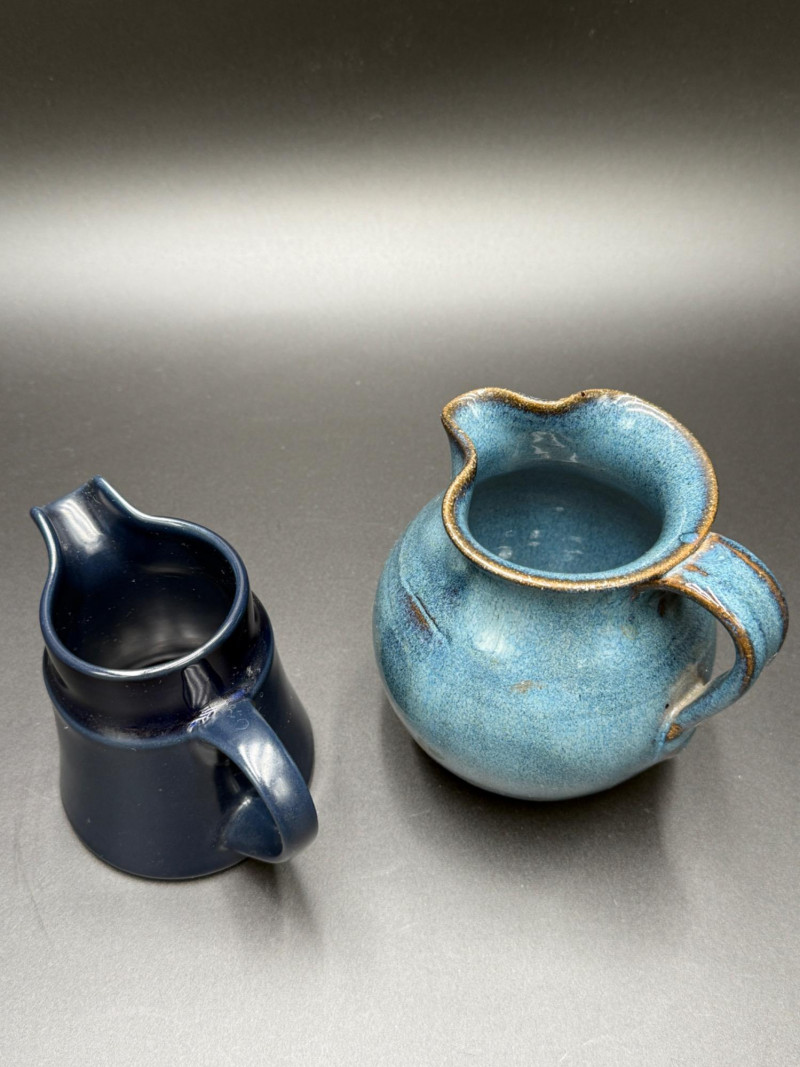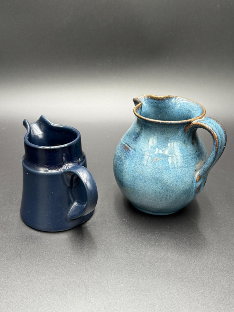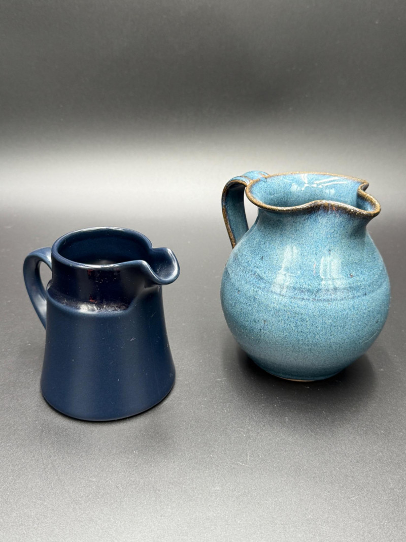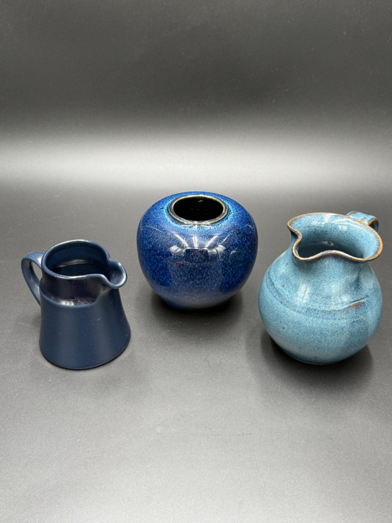 Trio of Studio Art Pottery – Blue Glazed Vases & Pitchers Three blue ceramic pieces including a round vase with narrow opening marked "Made in Japan," a small dark blue pitcher marked "Primastone," and a light blue pitcher with a curved body and unglazed base. Each piece has a blue-toned glaze with variations in finish and shape. Measurements: Round Vase: Approx. 4.5 × 5 inches Dark Blue Pitcher: Approx. 4.25 × 2.5 inches Light Blue Pitcher: Approx. 5.25 × 3.5 inches