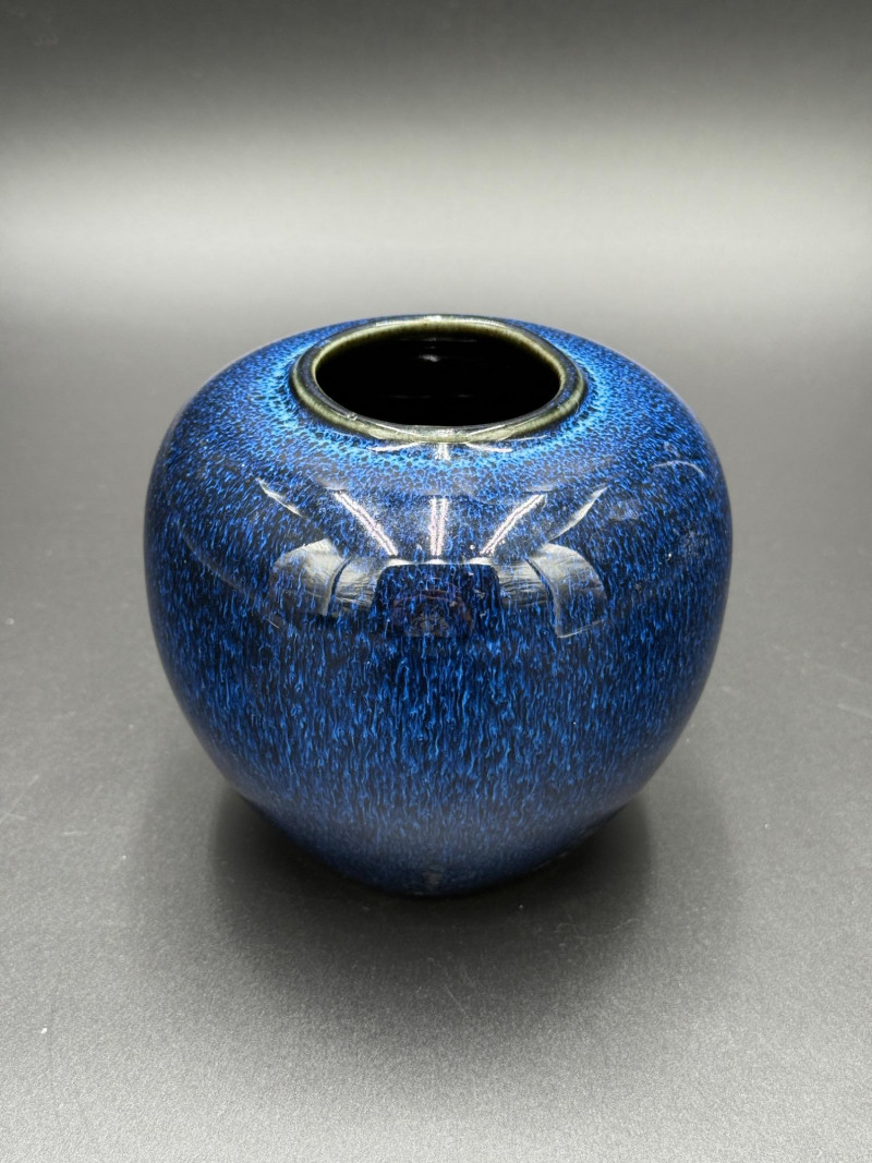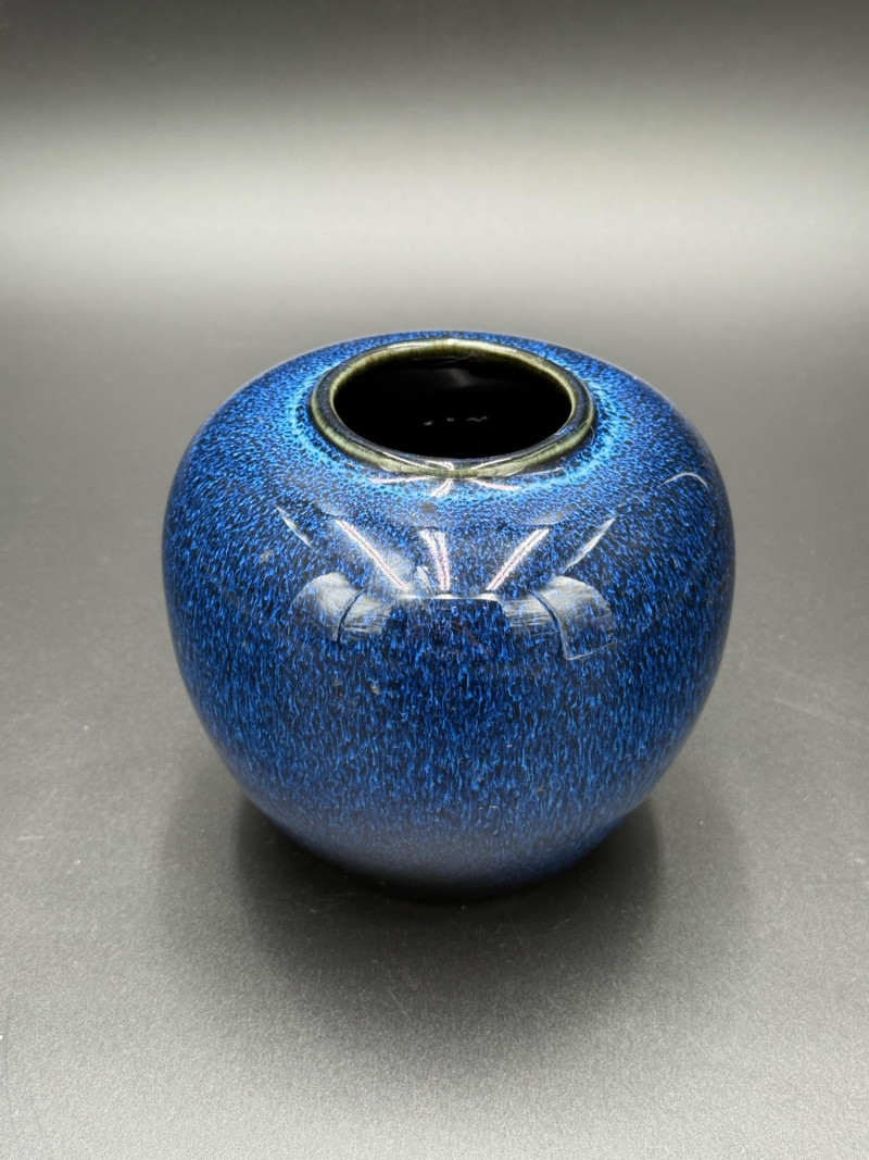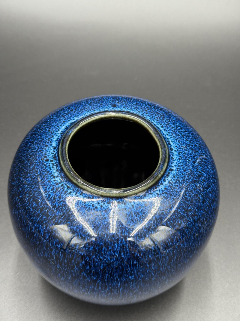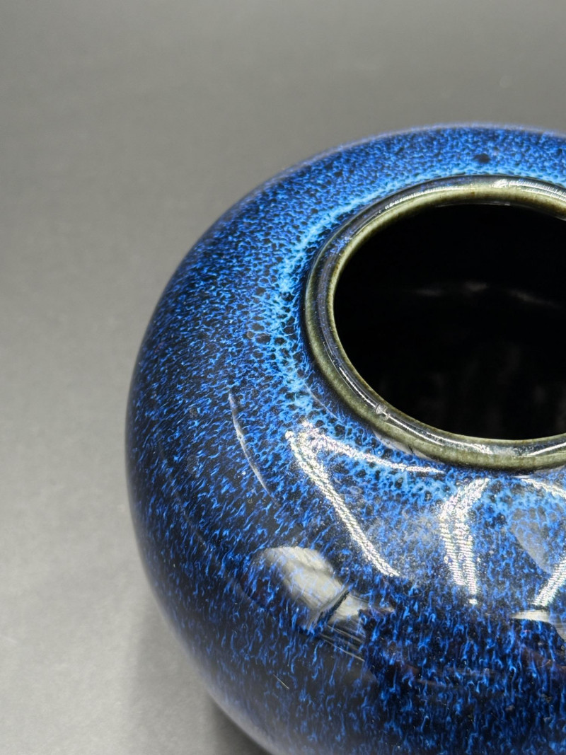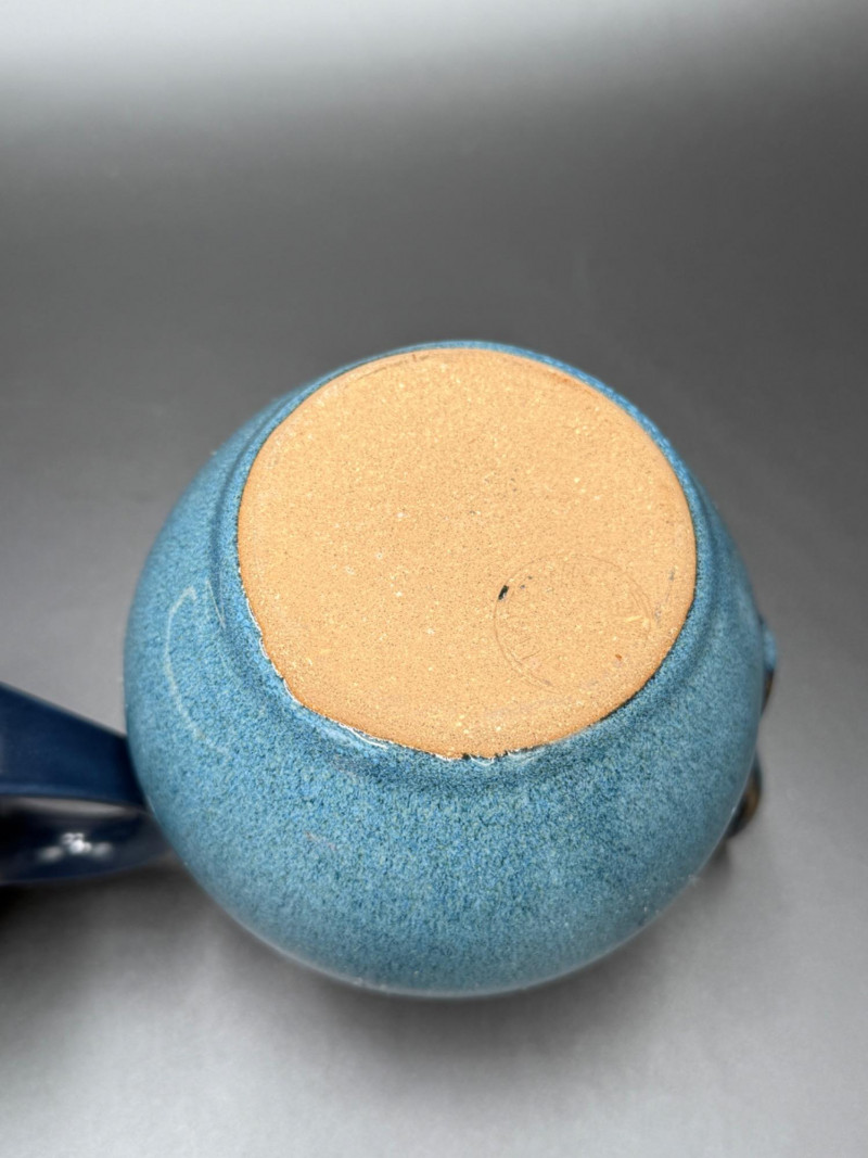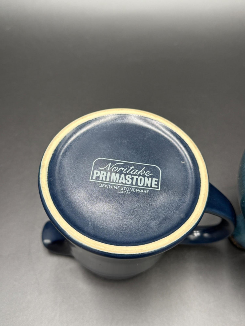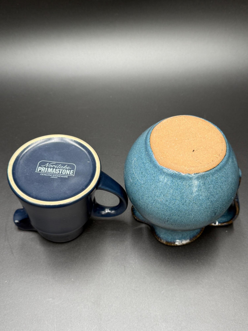 Trio of Studio Art Pottery – Blue Glazed Vases & Pitchers Three blue ceramic pieces including a round vase with narrow opening marked "Made in Japan," a small dark blue pitcher marked "Primastone," and a light blue pitcher with a curved body and unglazed base. Each piece has a blue-toned glaze with variations in finish and shape. Measurements: Round Vase: Approx. 4.5 × 5 inches Dark Blue Pitcher: Approx. 4.25 × 2.5 inches Light Blue Pitcher: Approx. 5.25 × 3.5 inches