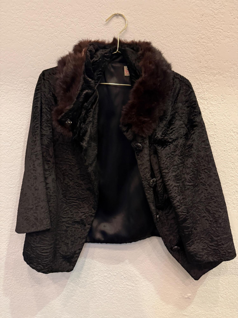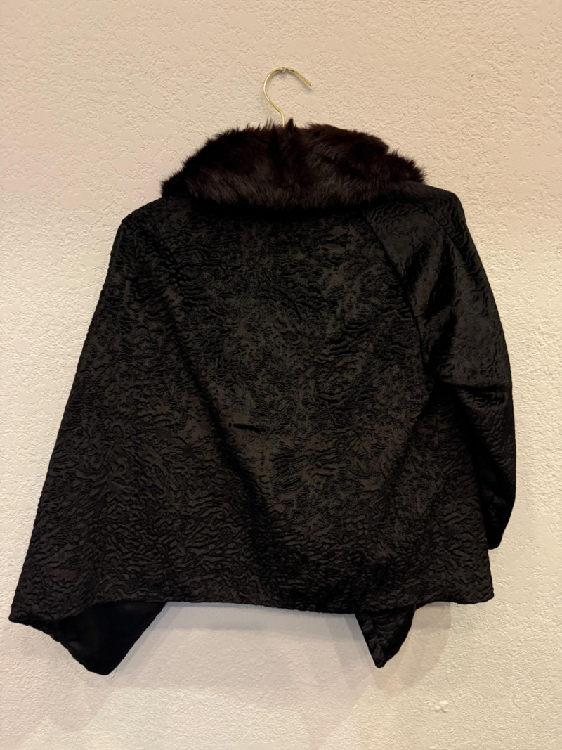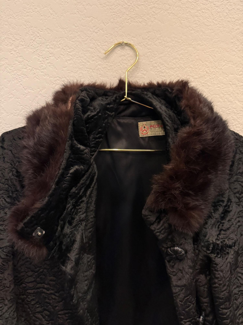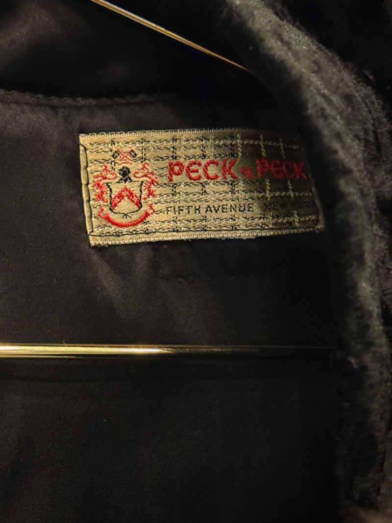 Dark patterned jacket with brown fur collar, button front, and lined interior. Labeled “Peck & Peck Fifth Avenue.”