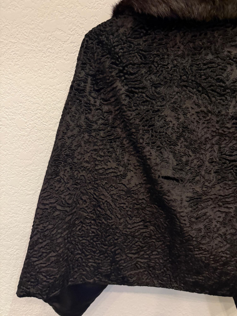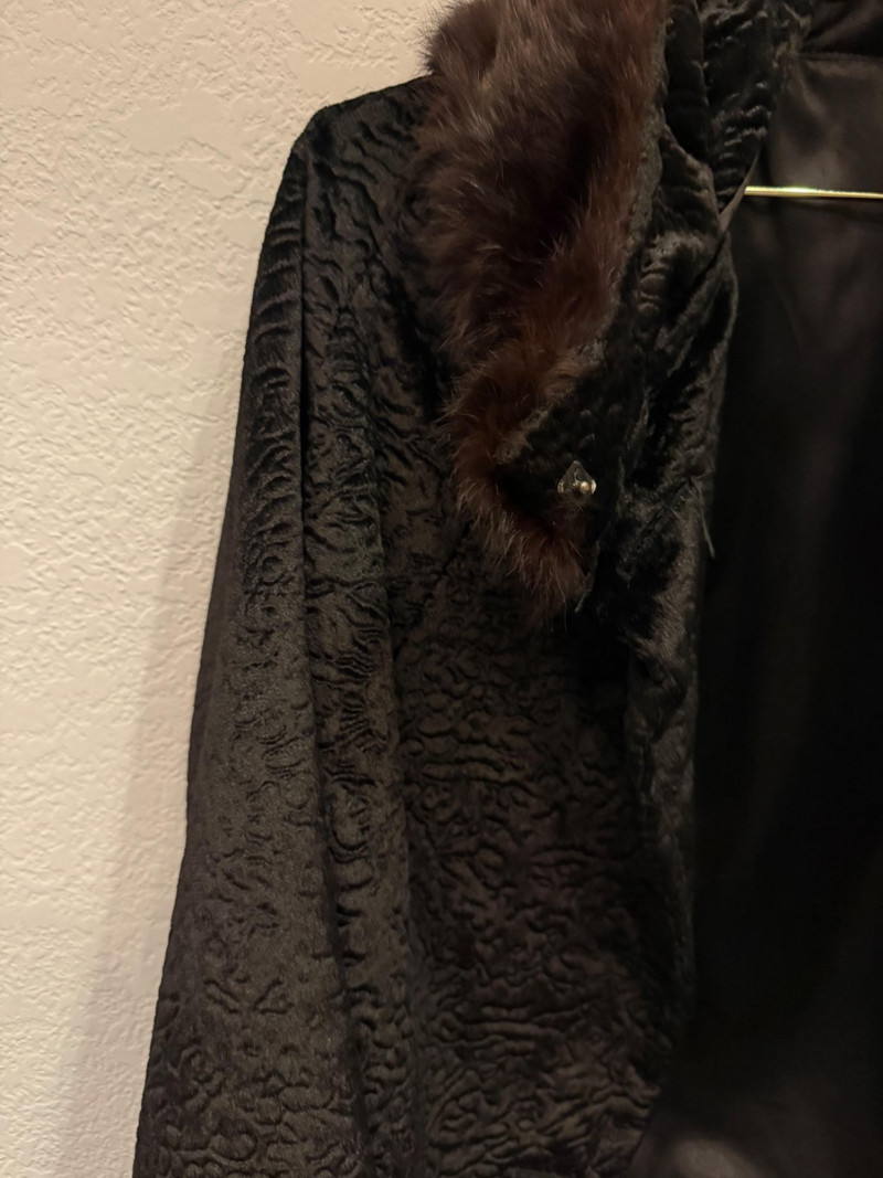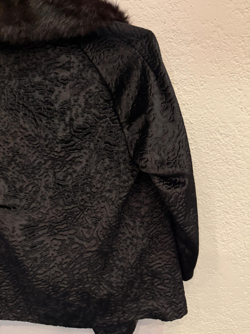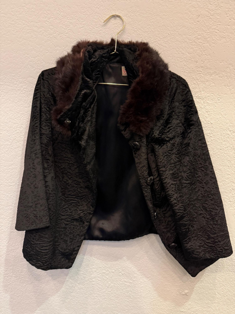 Dark patterned jacket with brown fur collar, button front, and lined interior. Labeled “Peck & Peck Fifth Avenue.”