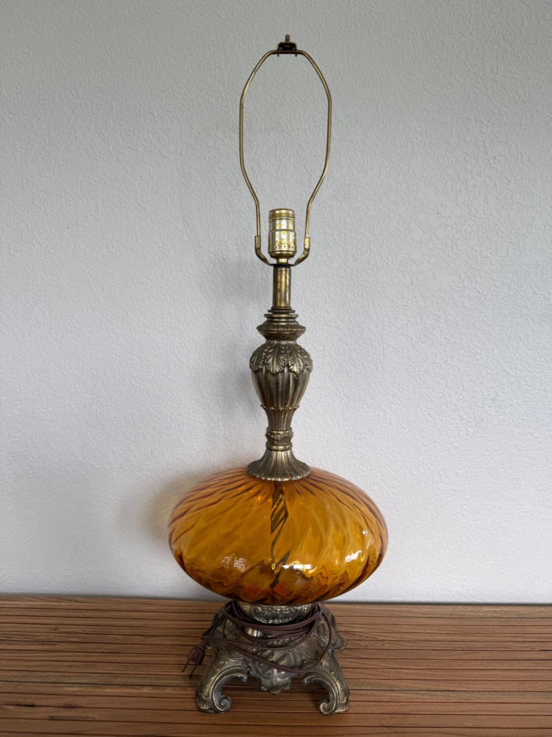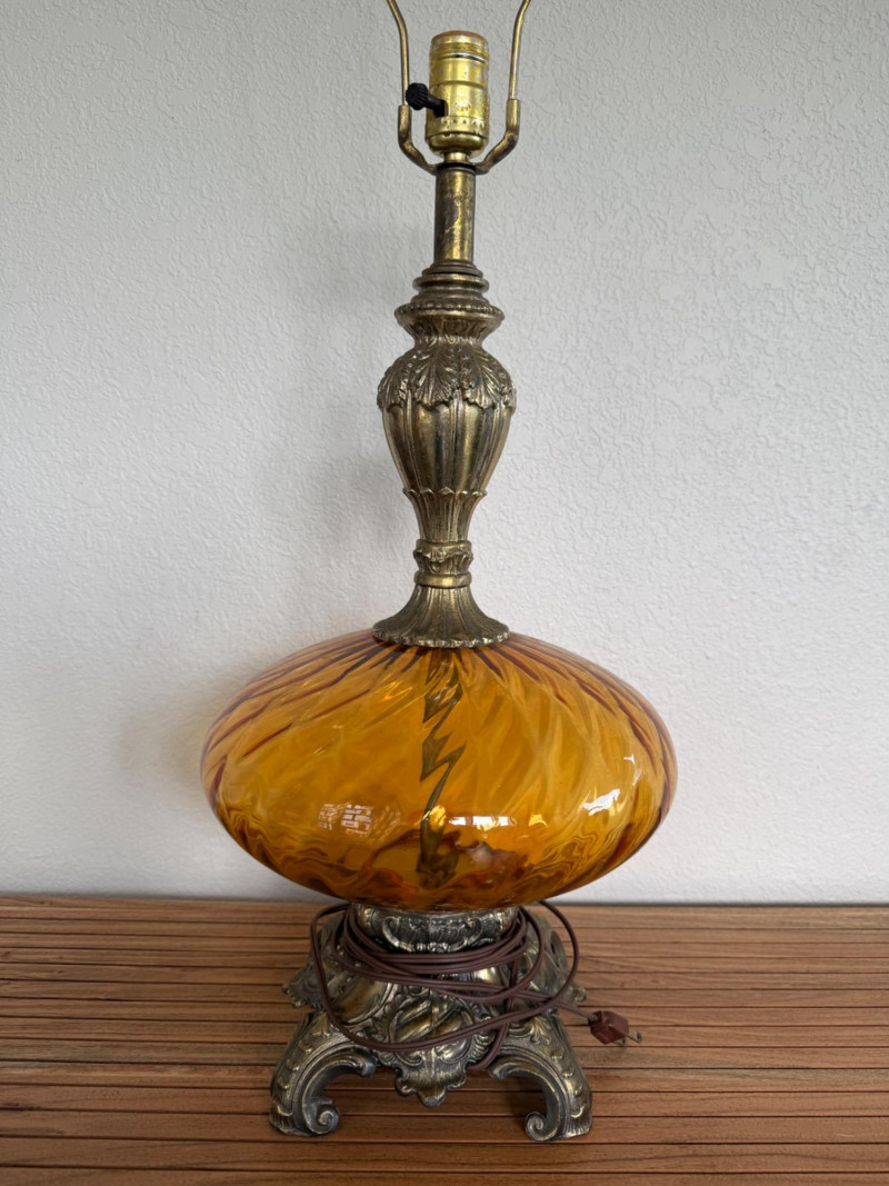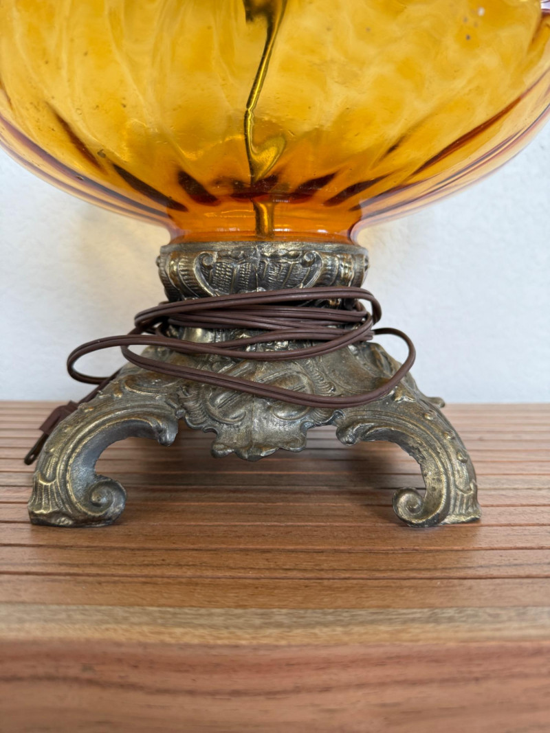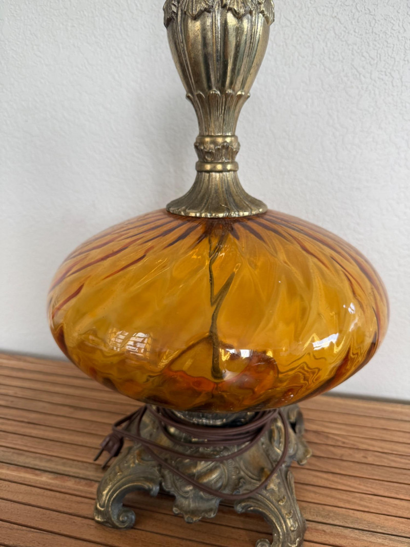 Vintage Amber Glass Lamp with Ornate Base – Working Condition A stunning example of mid-century lighting design, this vintage amber glass table lamp features a wide, rounded swirl glass body in a rich golden hue. The base and neck showcase intricate cast metal detailing with elegant scrollwork and a timeworn patina that adds to its antique charm. The glass glows warmly when lit, creating a cozy retro ambiance that brings a touch of 1960s–70s glamour to any room. The lamp stands on four ornate feet and is topped with a brass harp ready for your preferred shade (not included). Lamp is in working condition. Approximate Measurements: Height (to top of harp): 32" Width (at widest point): 11"