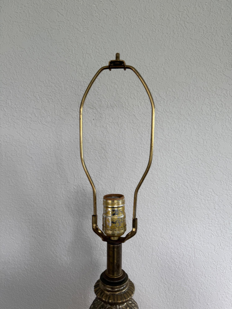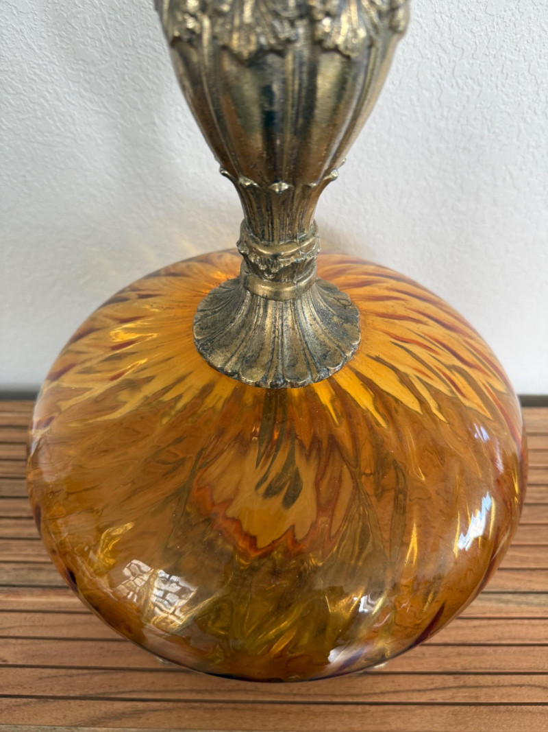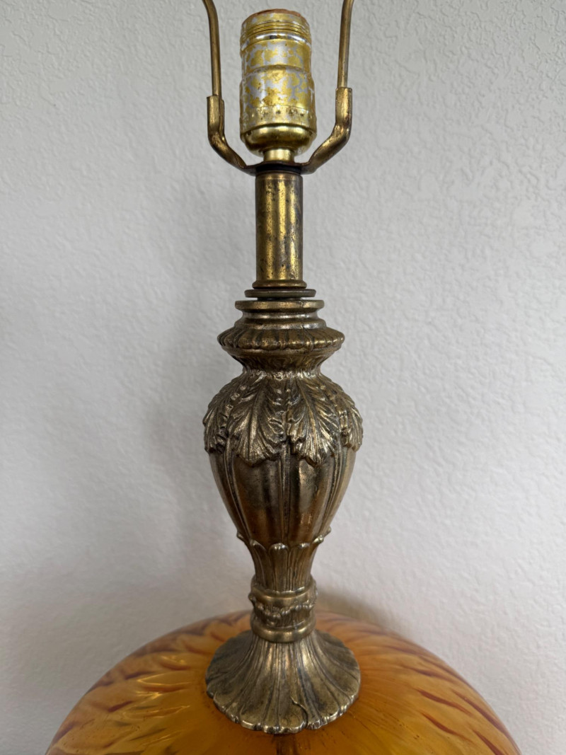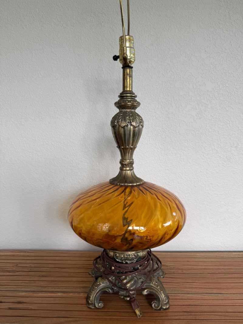 Vintage Amber Glass Lamp with Ornate Base – Working Condition A stunning example of mid-century lighting design, this vintage amber glass table lamp features a wide, rounded swirl glass body in a rich golden hue. The base and neck showcase intricate cast metal detailing with elegant scrollwork and a timeworn patina that adds to its antique charm. The glass glows warmly when lit, creating a cozy retro ambiance that brings a touch of 1960s–70s glamour to any room. The lamp stands on four ornate feet and is topped with a brass harp ready for your preferred shade (not included). Lamp is in working condition. Approximate Measurements: Height (to top of harp): 32" Width (at widest point): 11"