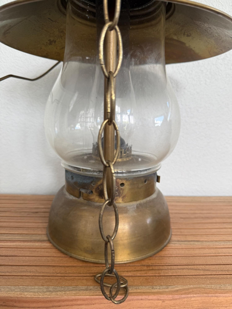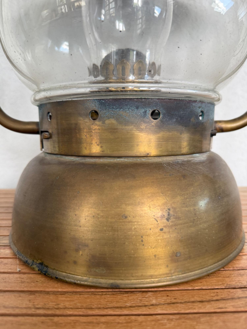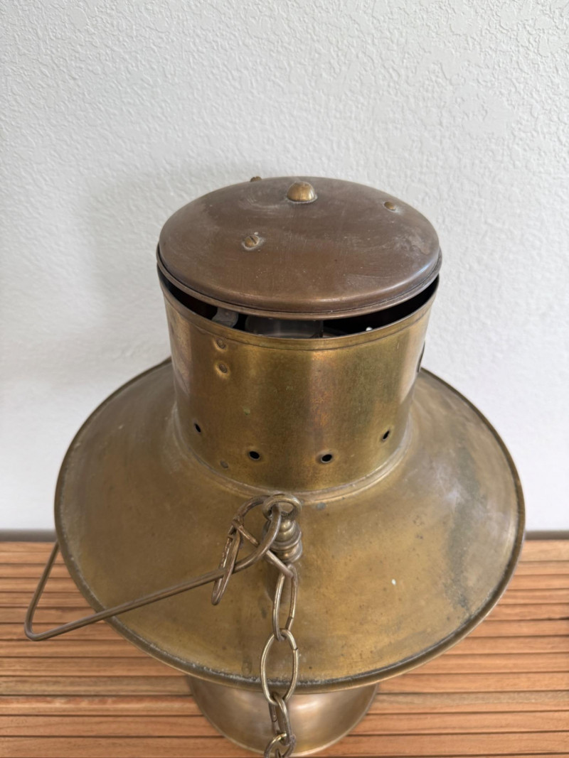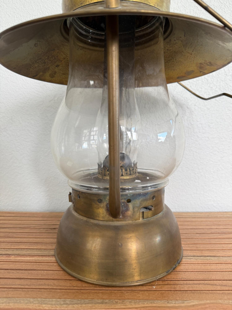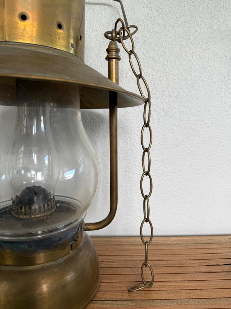 Brass Kerosene Lantern Metal lantern with glass globe, wide brass shade, and carrying handle. Includes chain and hook. Burner and wick visible inside. Measurements: 20 x 13.5 cm