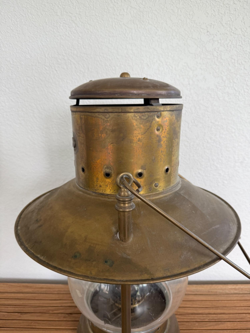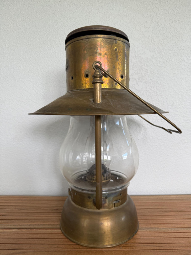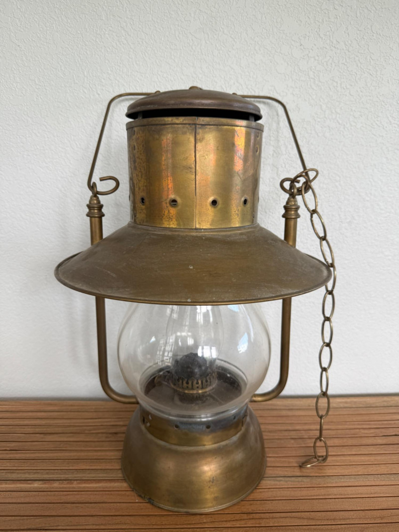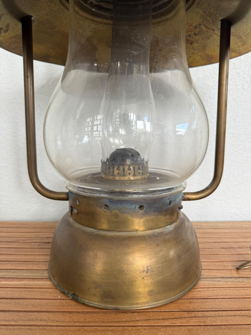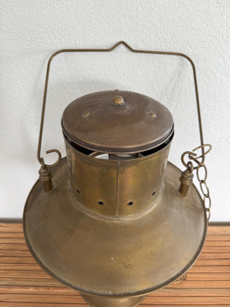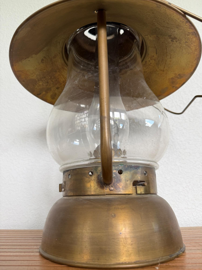 Brass Kerosene Lantern Metal lantern with glass globe, wide brass shade, and carrying handle. Includes chain and hook. Burner and wick visible inside. Measurements: 20 x 13.5 cm