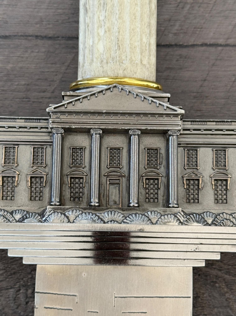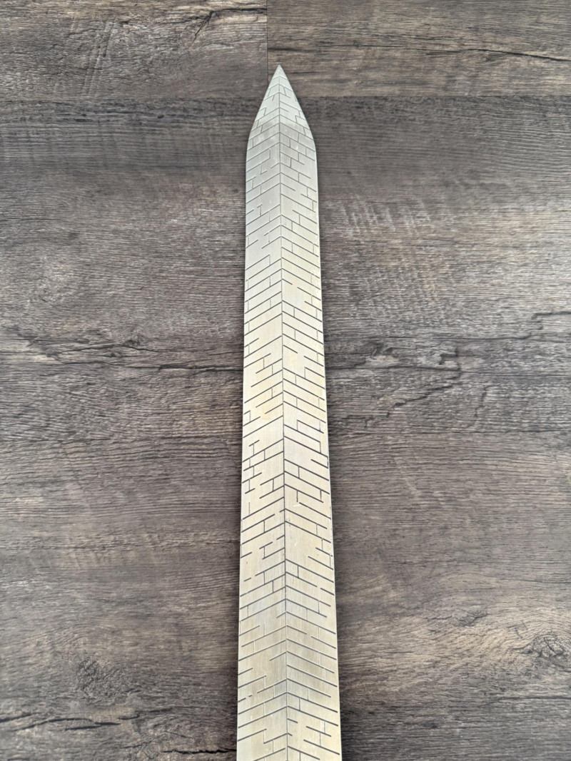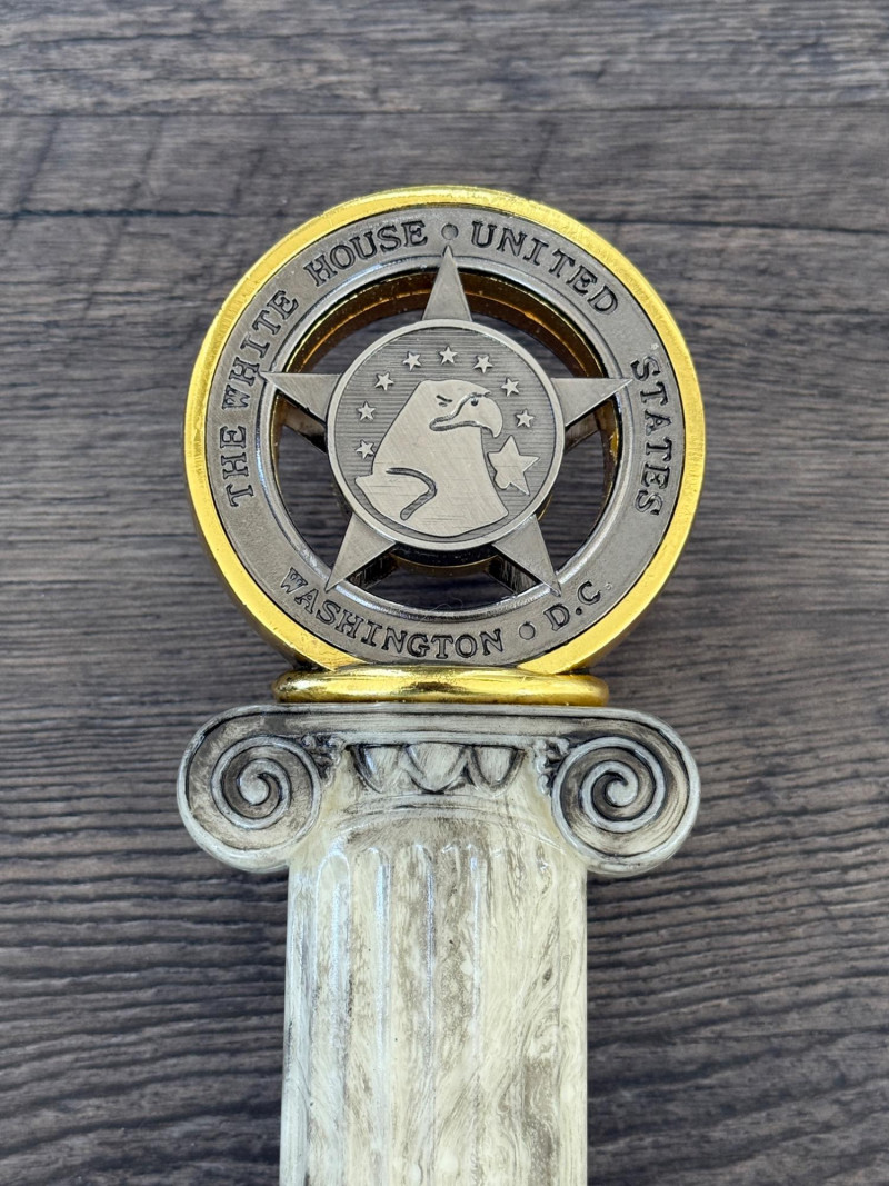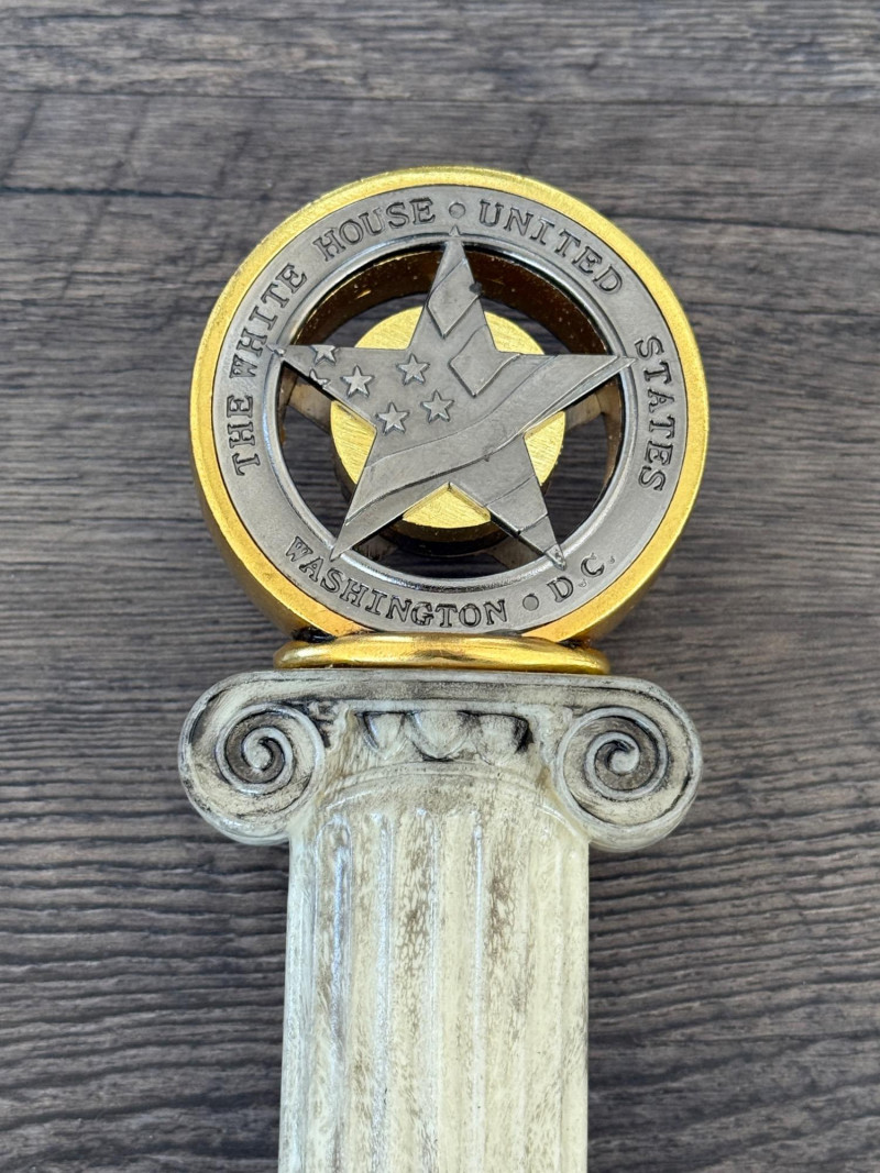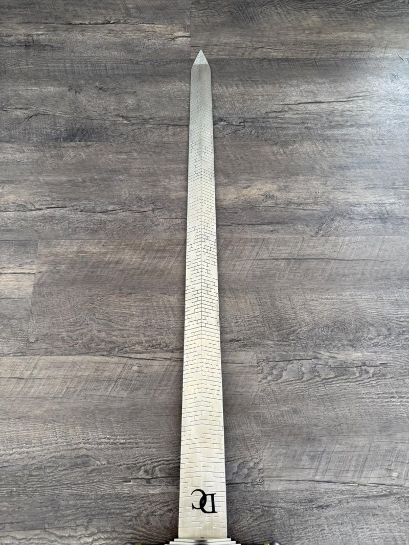 Washington D.C. White House Sword – 52" Tall Frost Cutlery Russ Farrell “White House” sword. The crossguard features a sculpted representation of the White House building. The pommel displays a round medallion marked “The White House • United States • Washington D.C.” with an embossed five-pointed star and eagle design. The grip is column-shaped, mimicking neoclassical architecture. The blade is etched with “DC” near the base and tapers to a pointed tip with engraved brick-like detail resembling the Washington Monument. Dimensions:
