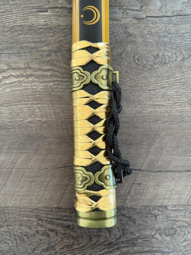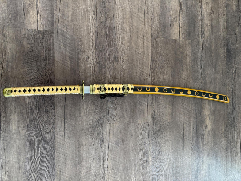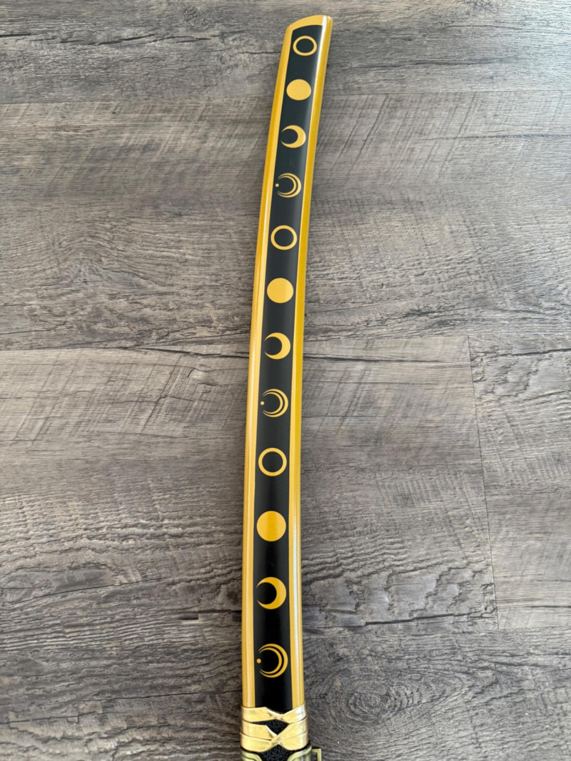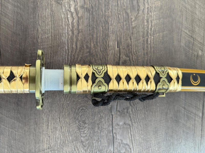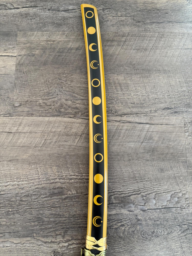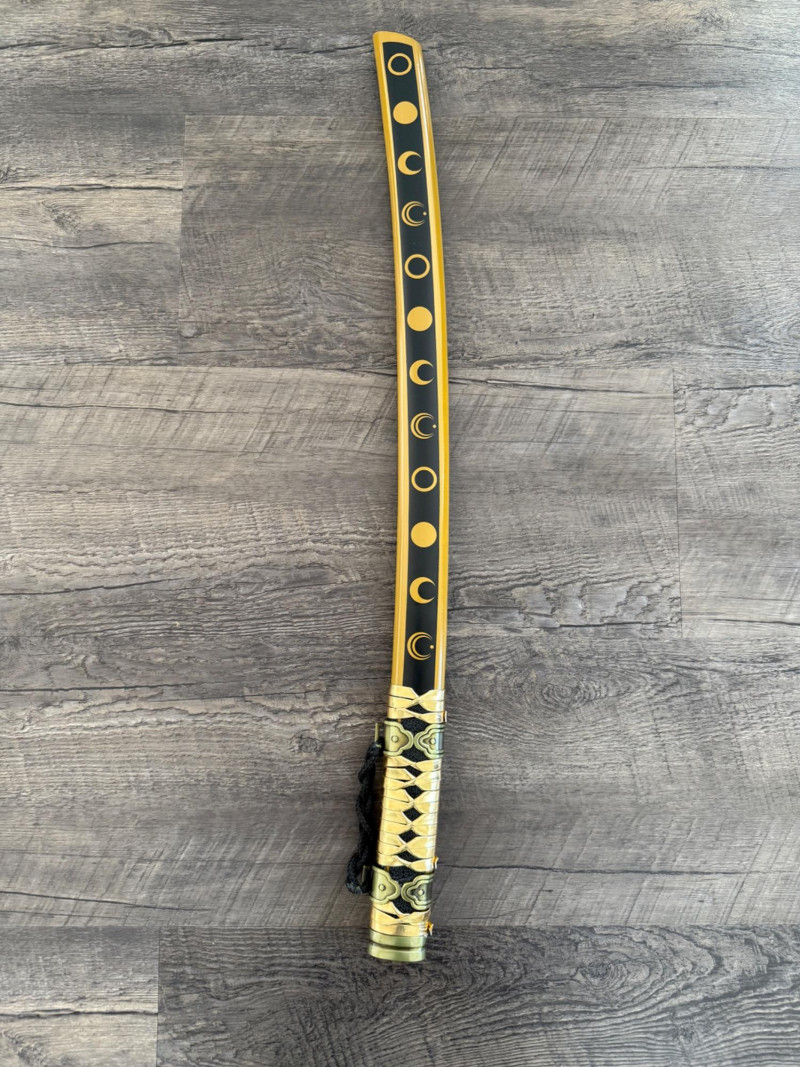 Black and Gold Katana with Crescent Design Katana with a black scabbard featuring gold crescent moons. The handle is wrapped in gold pleather with black diamond openings and molded fittings. Includes a black cord on the scabbard and a curved blade with a wave-style hamon. Materials used include gold pleather, polyurethane, and vegan leather. Measurements: