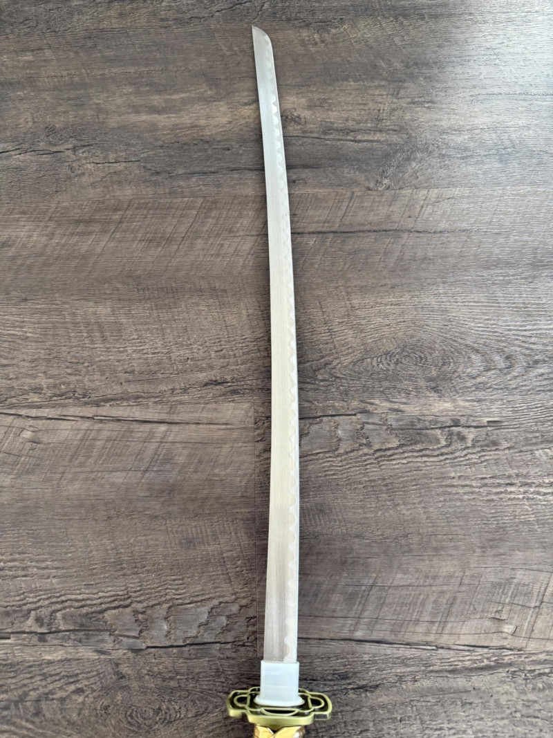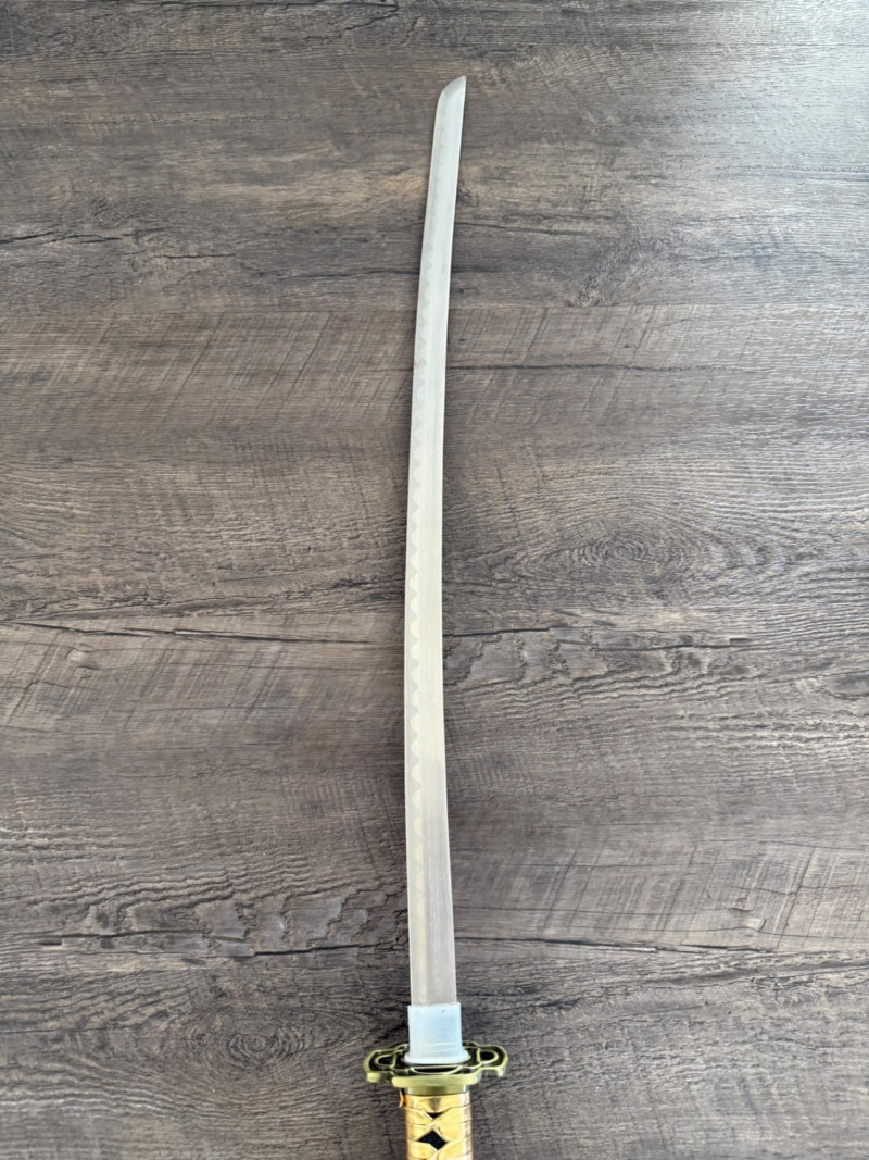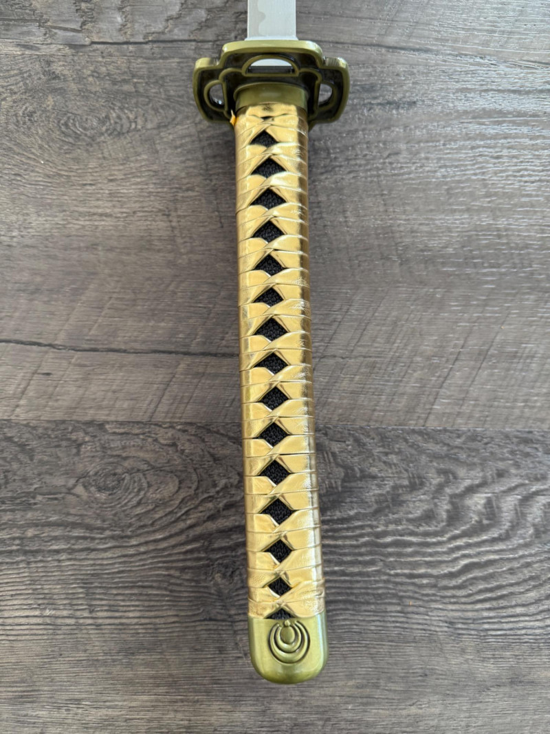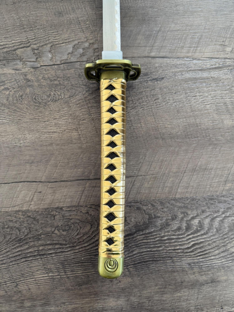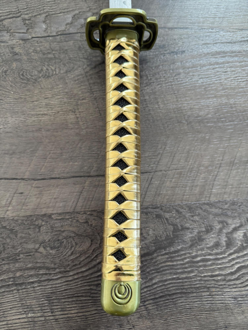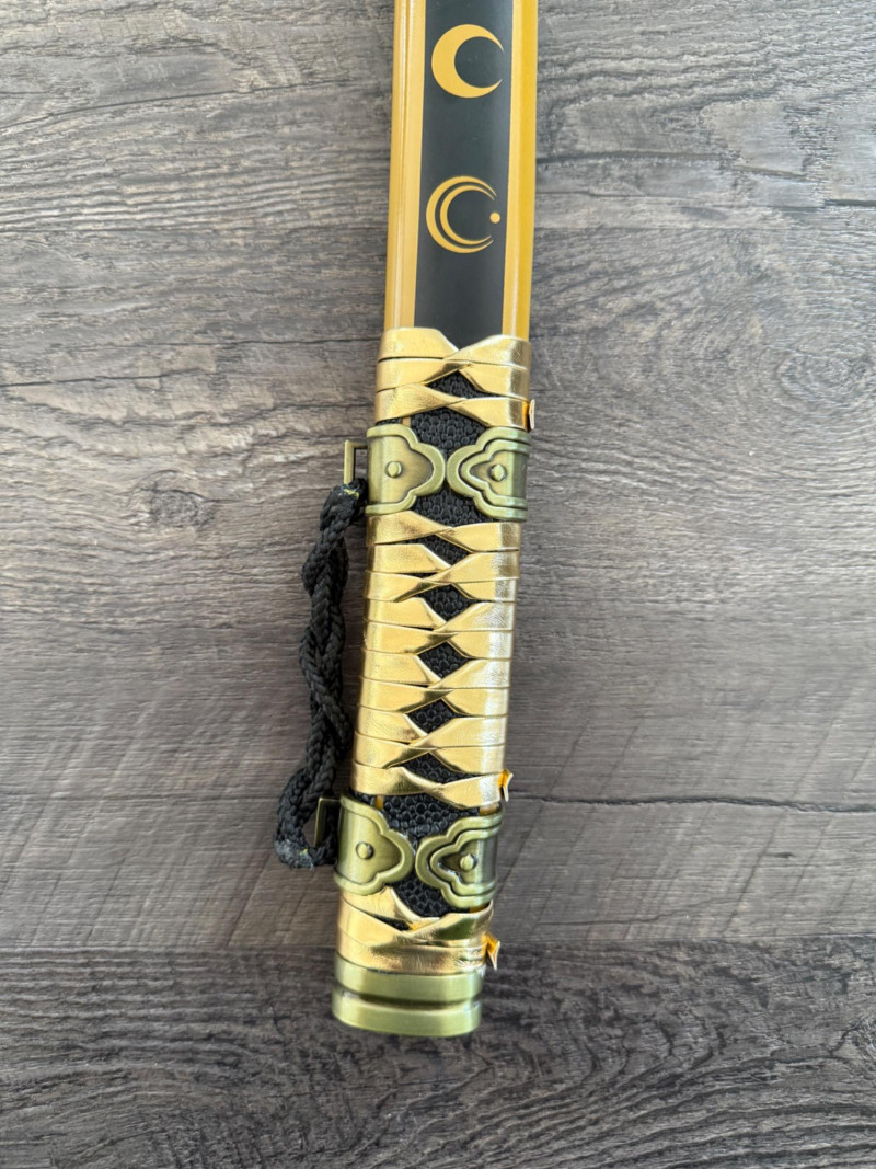 Black and Gold Katana with Crescent Design Katana with a black scabbard featuring gold crescent moons. The handle is wrapped in gold pleather with black diamond openings and molded fittings. Includes a black cord on the scabbard and a curved blade with a wave-style hamon. Materials used include gold pleather, polyurethane, and vegan leather. Measurements: