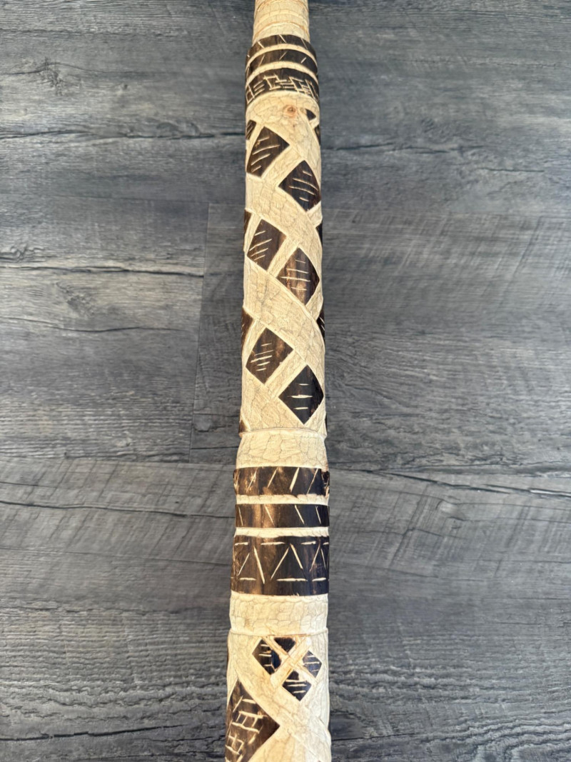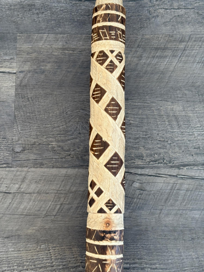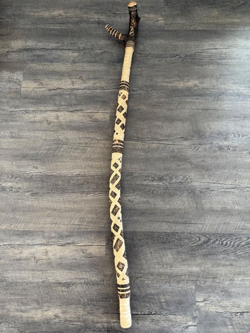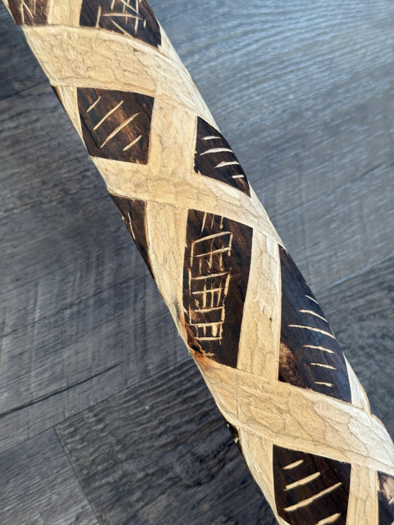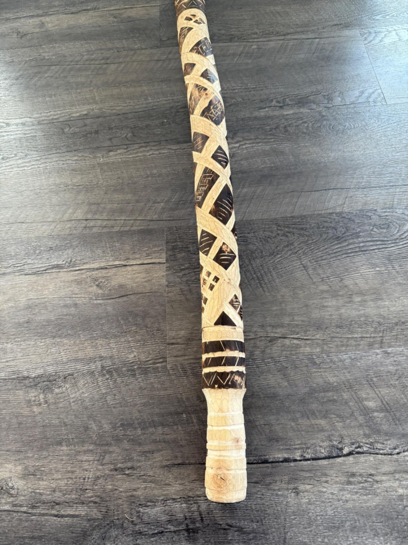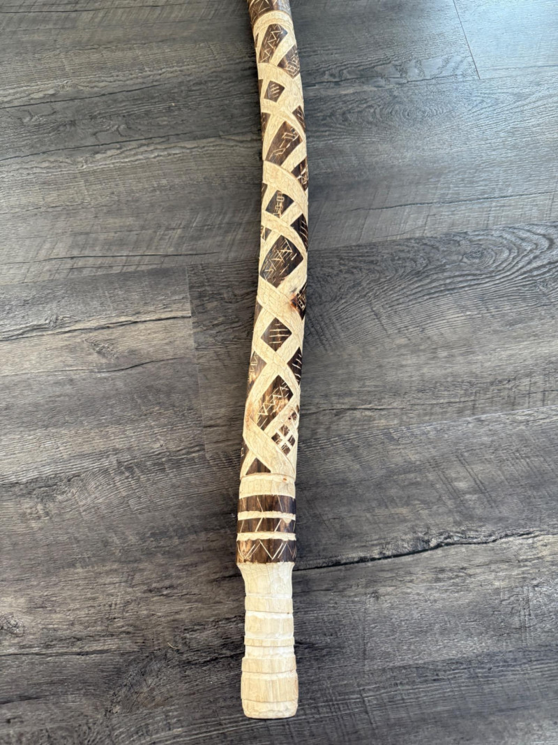 60” Hand-Carved Tribal Walking Stick – Decorative Cultural Artifact This striking 60-inch wooden walking stick features intricate hand-carved geometric patterns spiraling down its length, showcasing remarkable craftsmanship. The alternating dark and light-toned detailing appears to be either etched or burned into the surface, giving it rich texture and contrast. The stick is further accented with wrapped bands, likely made of natural fiber or leather, and a coiled section at the top that adds to its visual and tactile appeal. Items like this are often inspired by or originate from African, Oceanic, or Indigenous tribal traditions, where carved walking sticks and staffs serve not only as mobility aids but also as ceremonial or status symbols. The geometric motifs may represent ancestral lineage, regional identity, or symbolic storytelling elements.