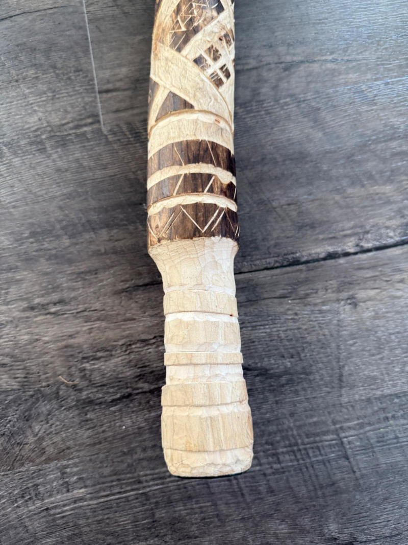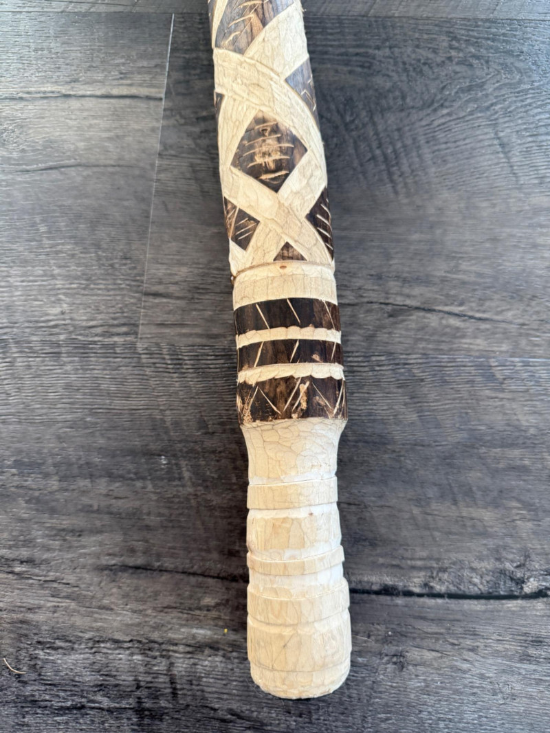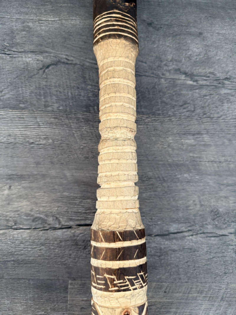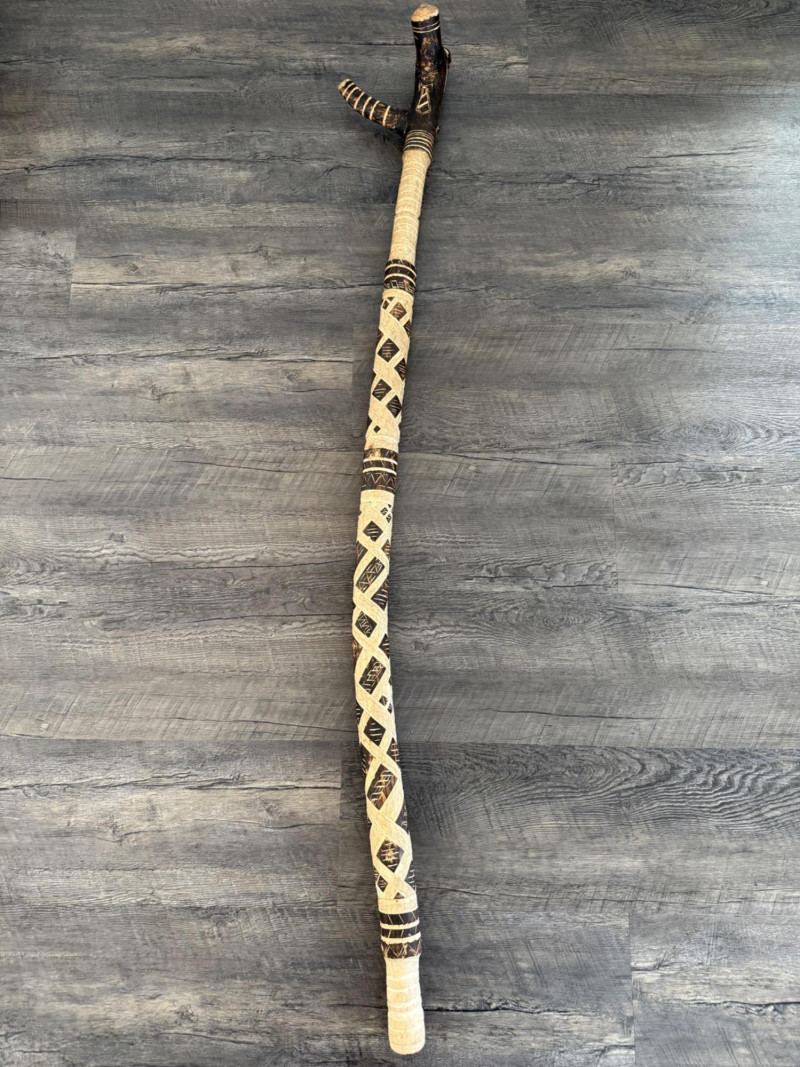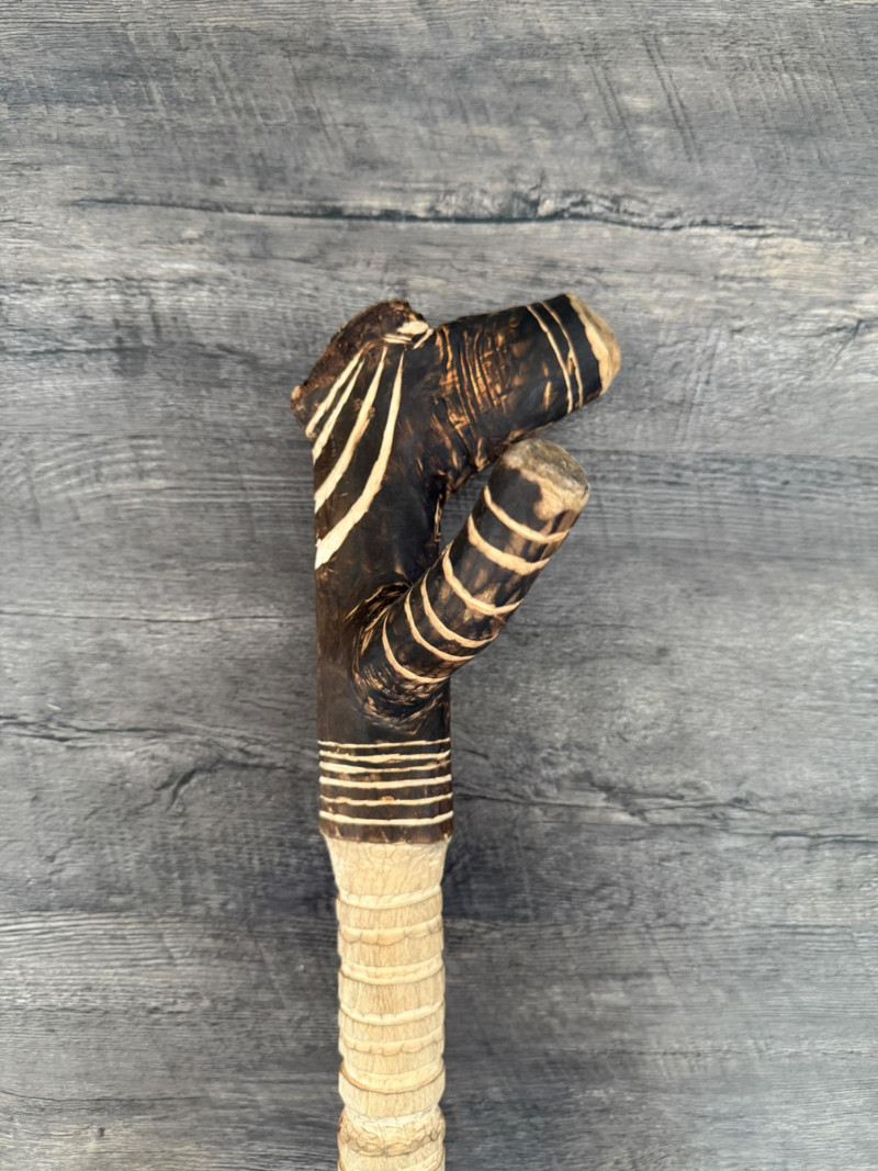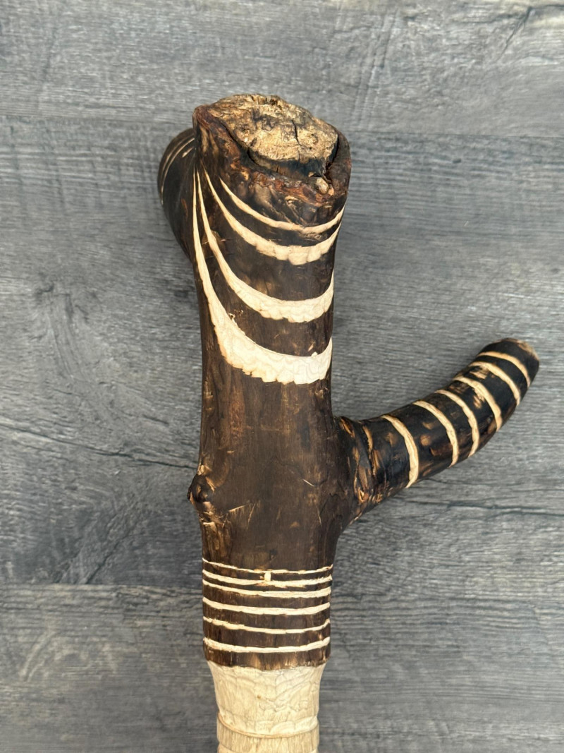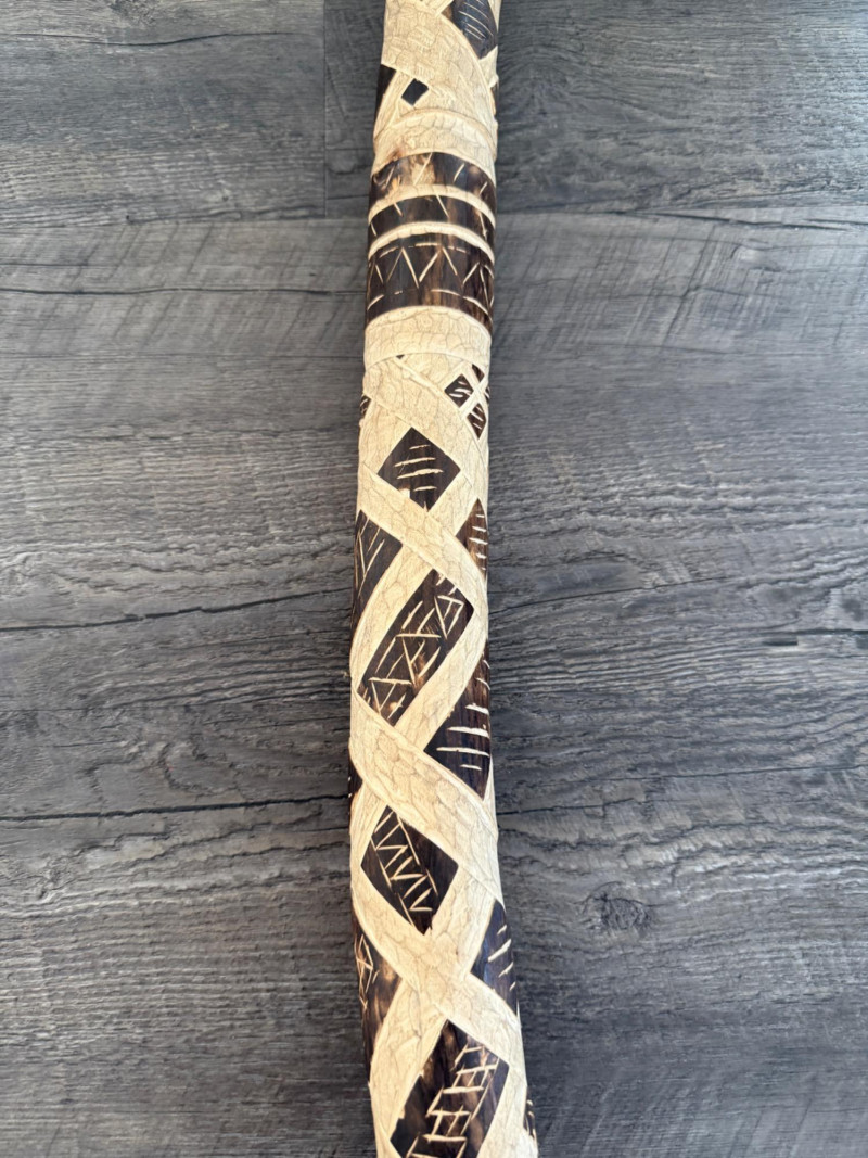 60” Hand-Carved Tribal Walking Stick – Decorative Cultural Artifact This striking 60-inch wooden walking stick features intricate hand-carved geometric patterns spiraling down its length, showcasing remarkable craftsmanship. The alternating dark and light-toned detailing appears to be either etched or burned into the surface, giving it rich texture and contrast. The stick is further accented with wrapped bands, likely made of natural fiber or leather, and a coiled section at the top that adds to its visual and tactile appeal. Items like this are often inspired by or originate from African, Oceanic, or Indigenous tribal traditions, where carved walking sticks and staffs serve not only as mobility aids but also as ceremonial or status symbols. The geometric motifs may represent ancestral lineage, regional identity, or symbolic storytelling elements.