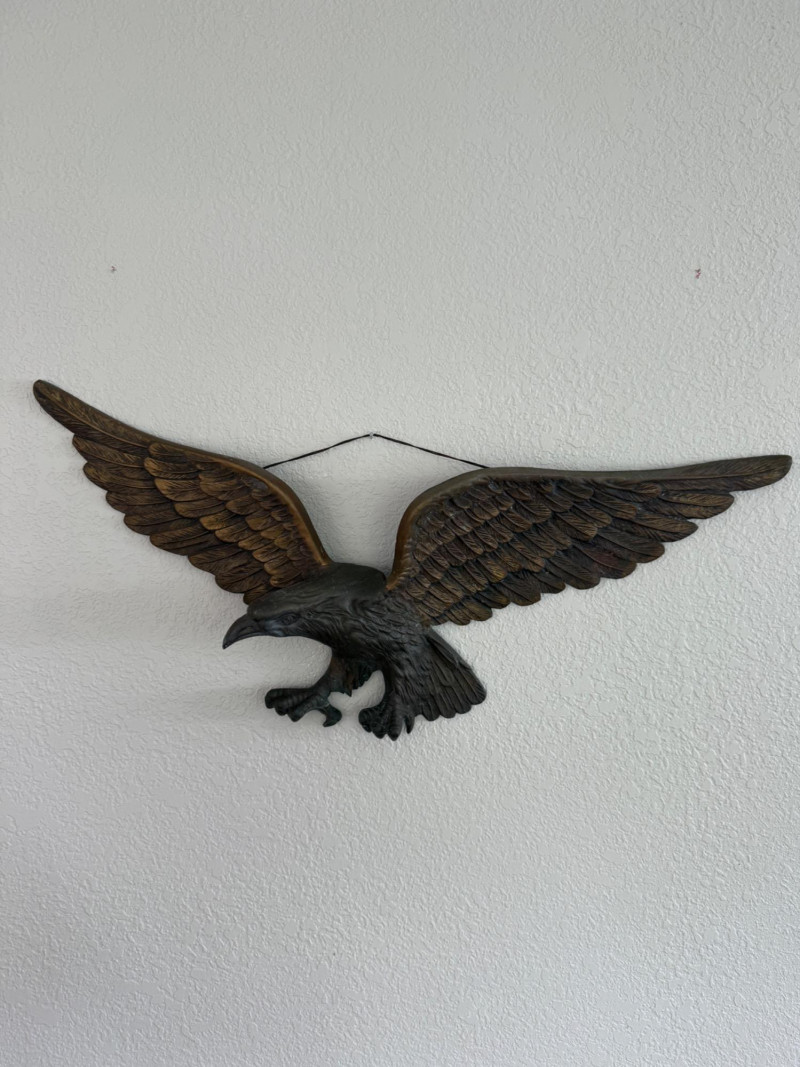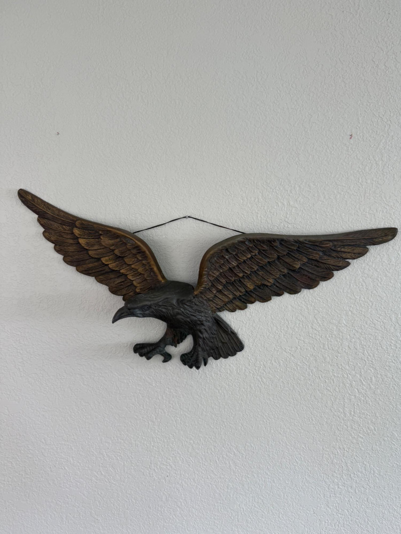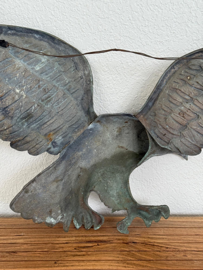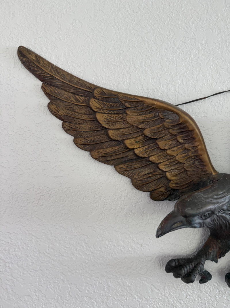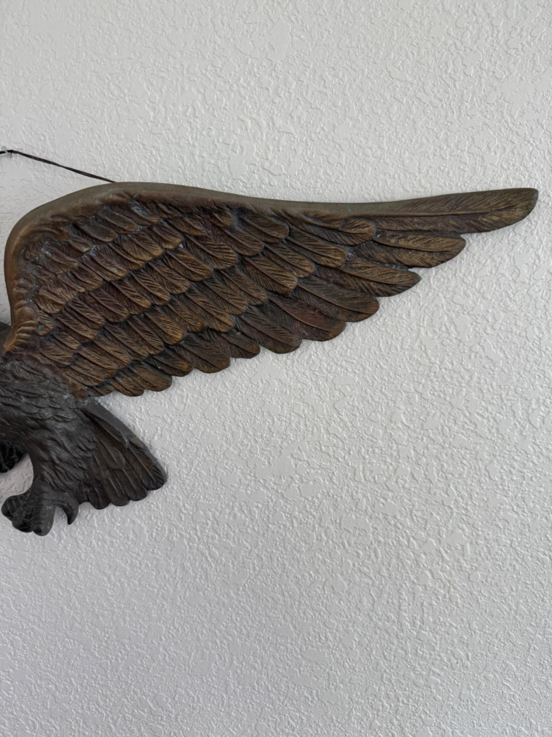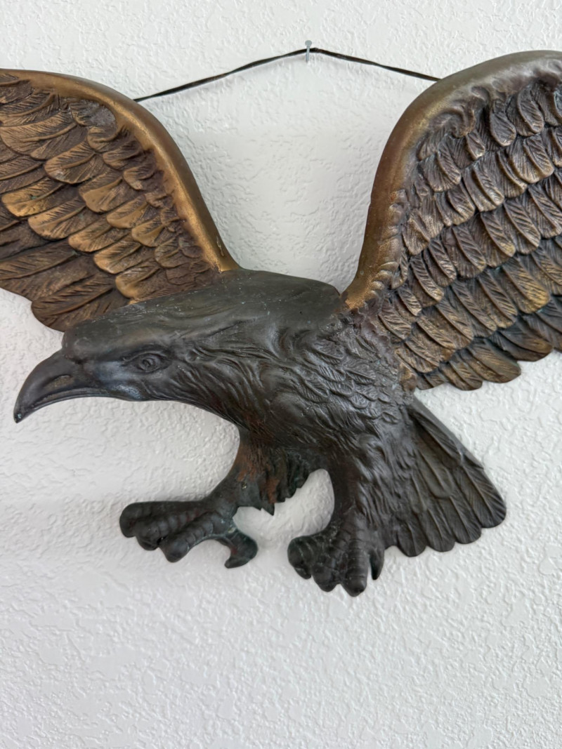 Vintage Cast Metal Eagle Wall Plaque – 24" Patriotic Décor Cast metal eagle wall decor with spread wings and detailed feather pattern. Features molded body and talons. Includes a wire loop on the back for hanging.