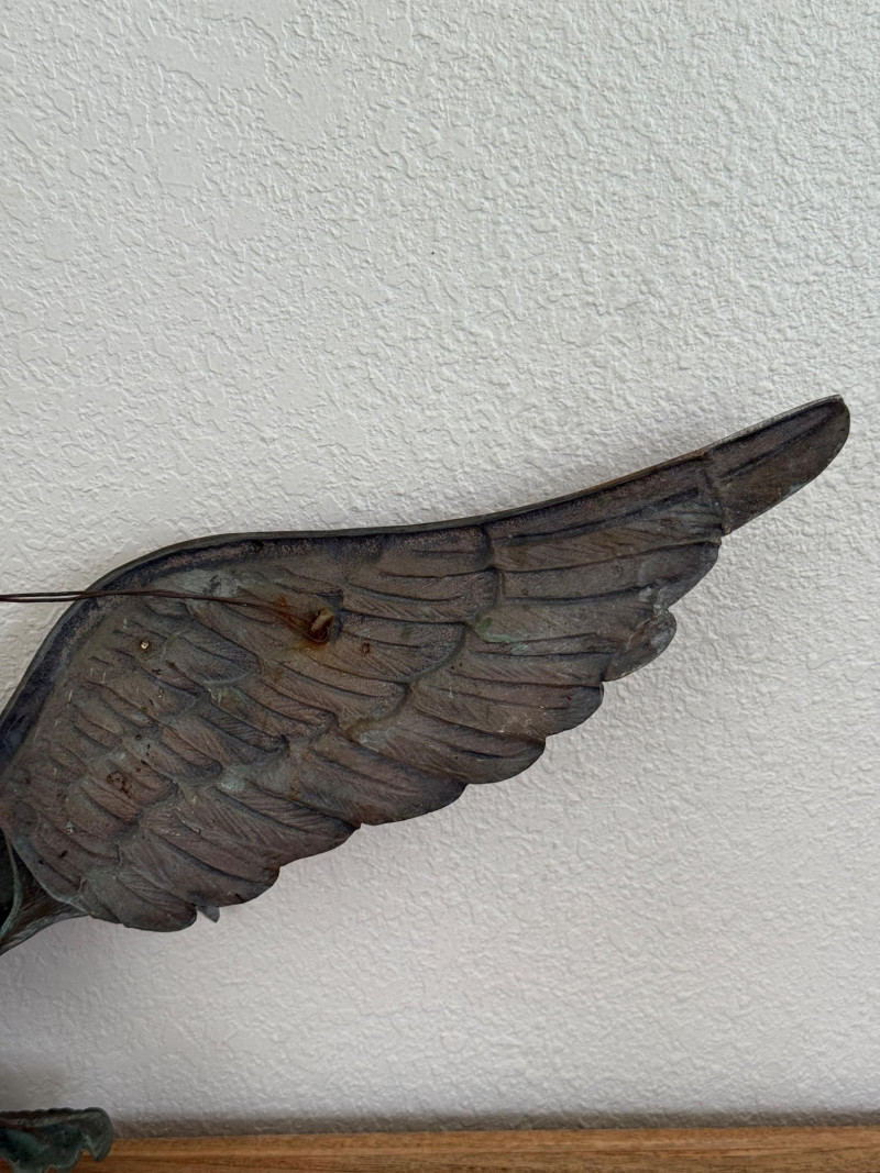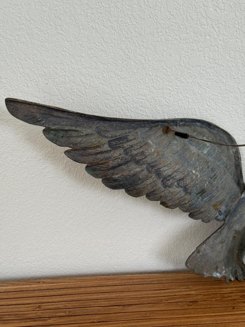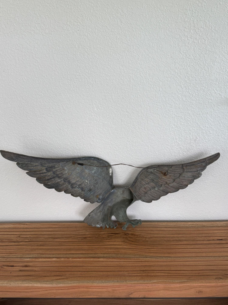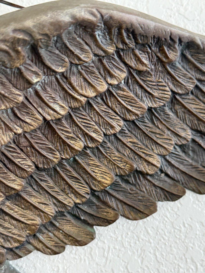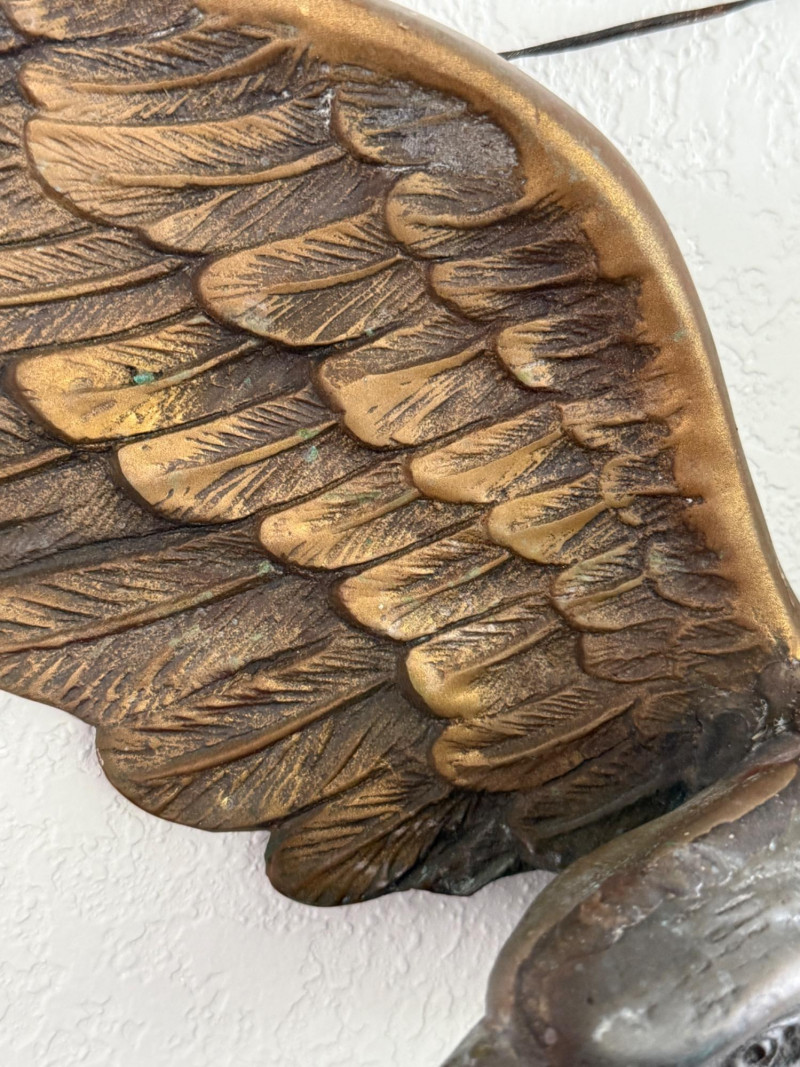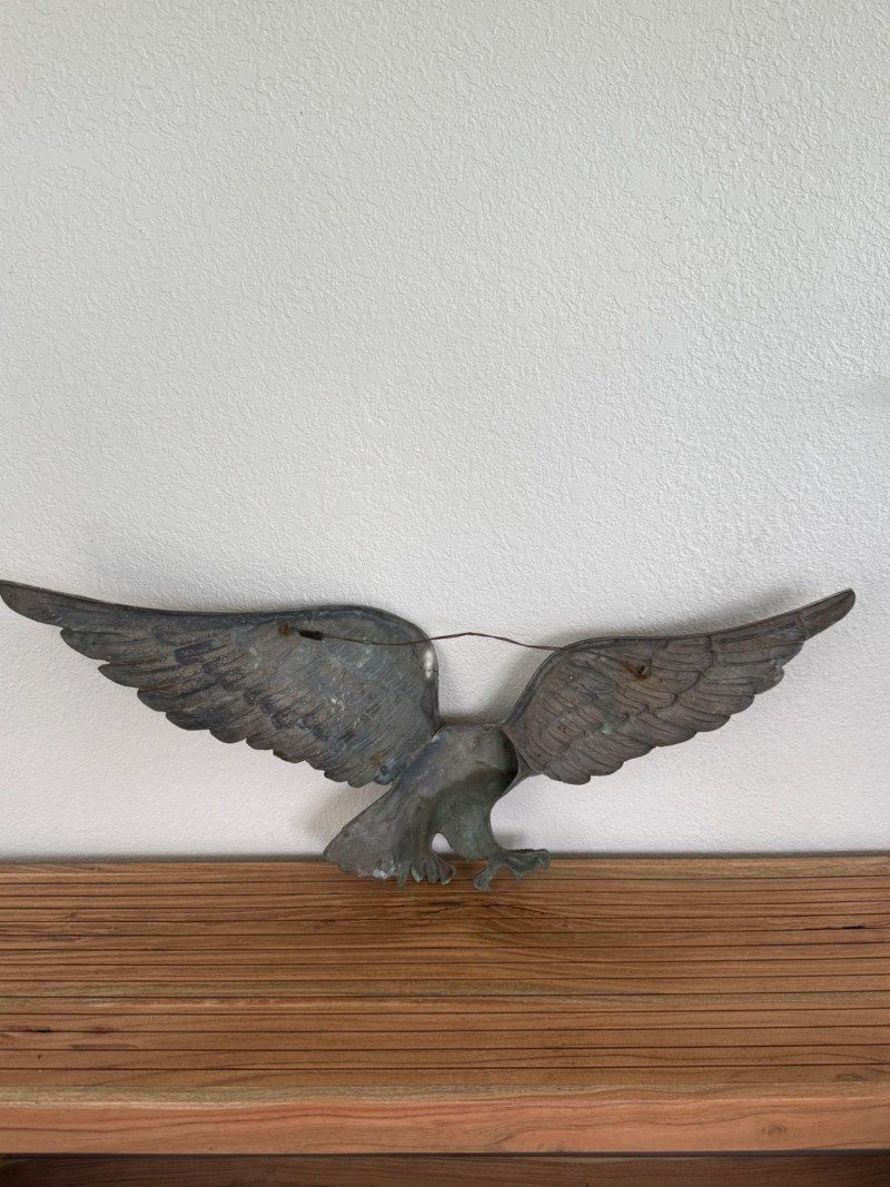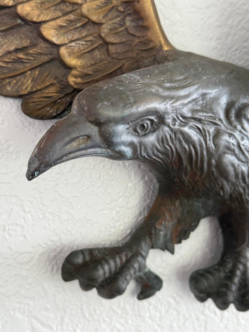 Vintage Cast Metal Eagle Wall Plaque – 24" Patriotic Décor Cast metal eagle wall decor with spread wings and detailed feather pattern. Features molded body and talons. Includes a wire loop on the back for hanging.