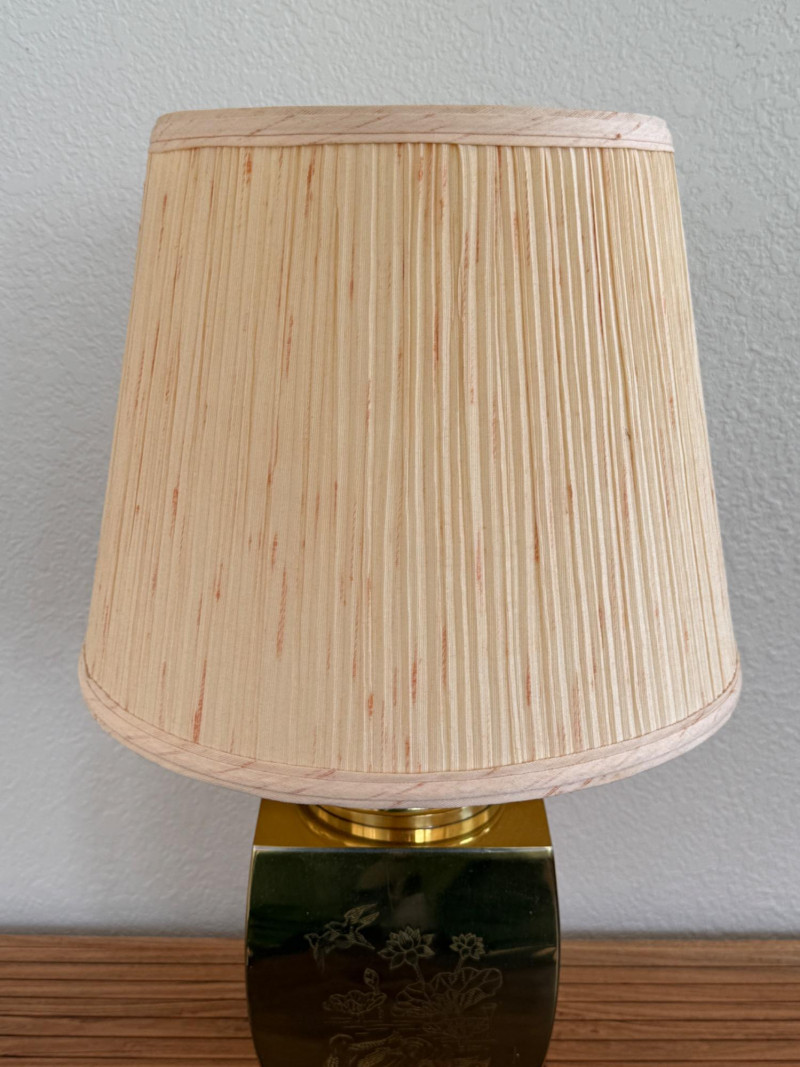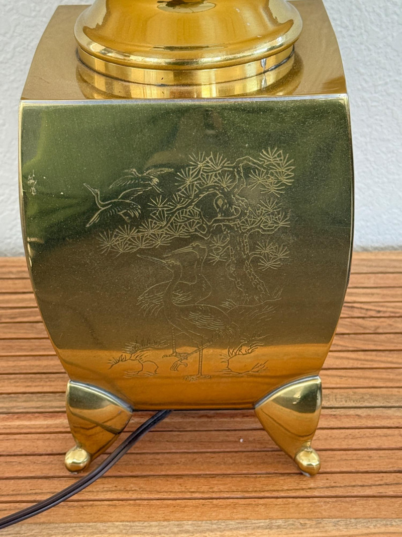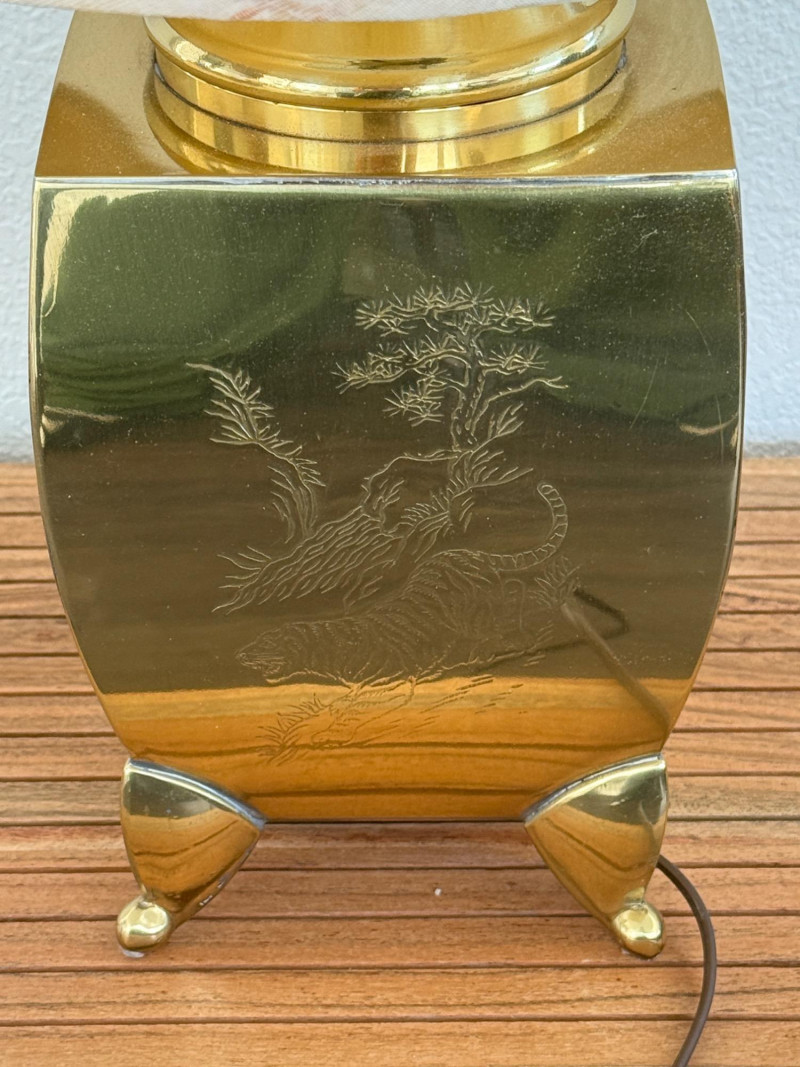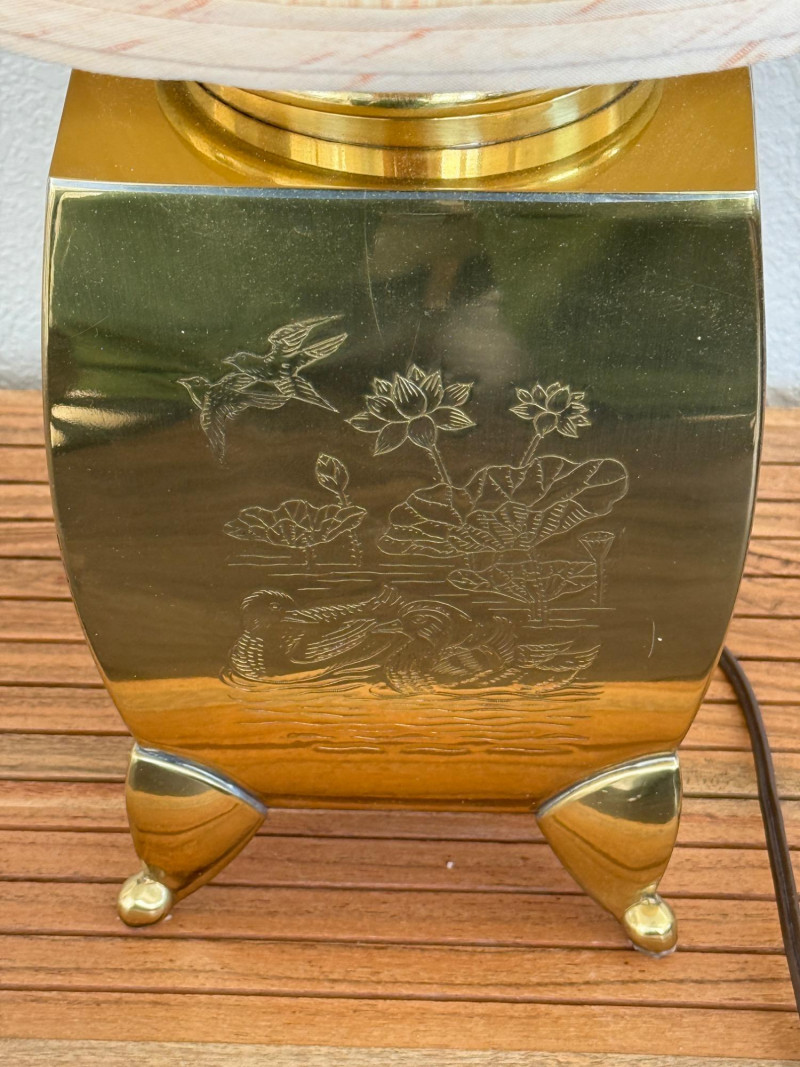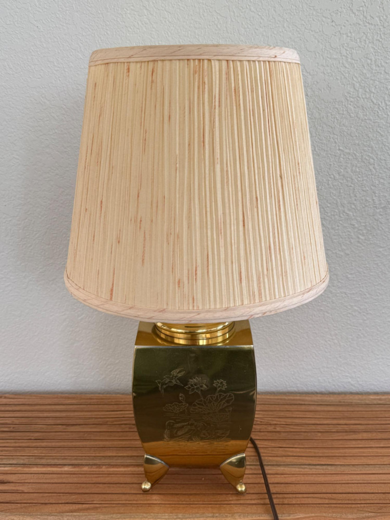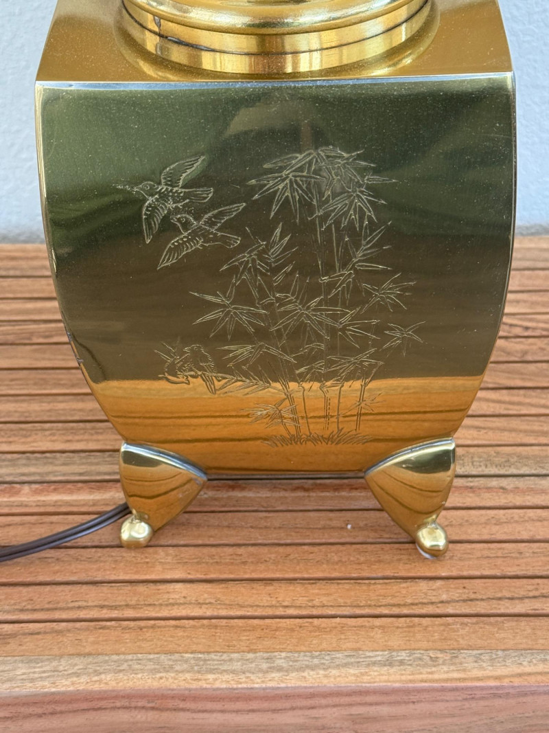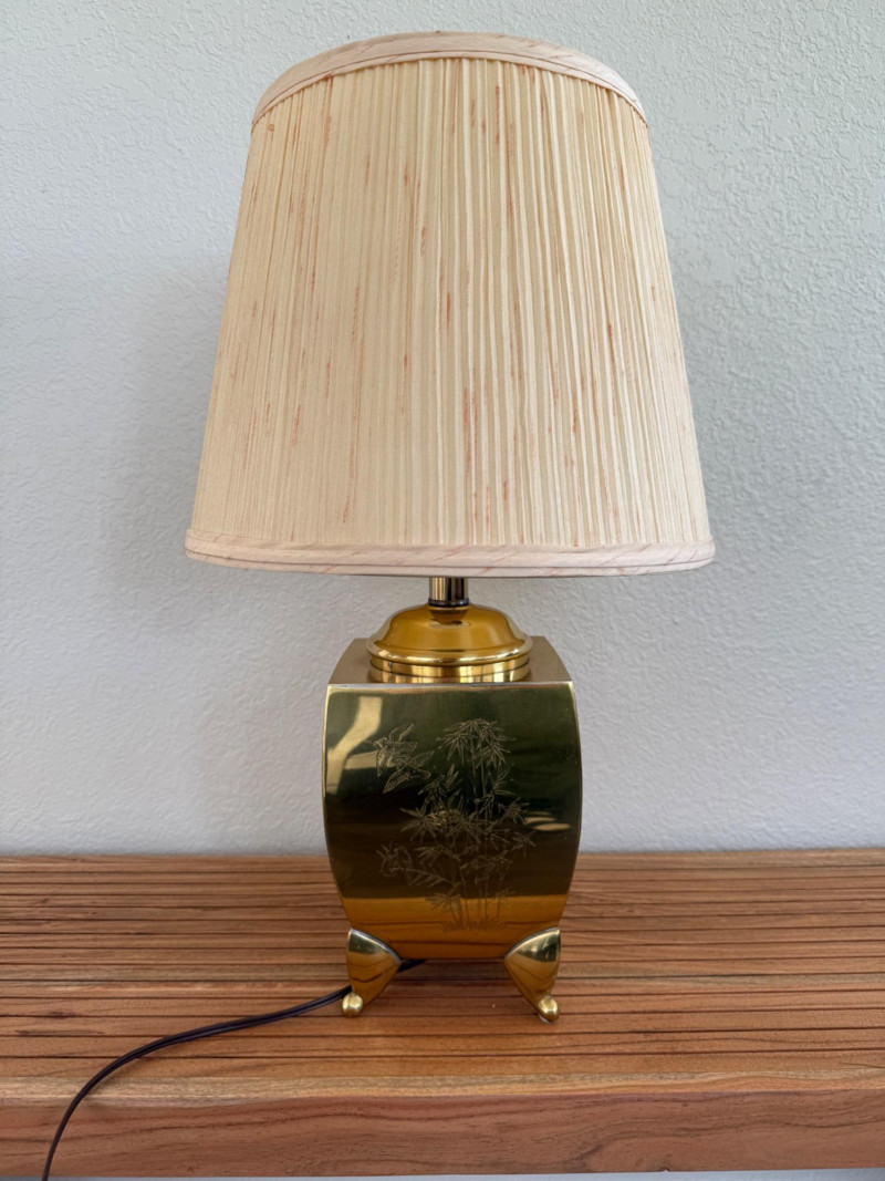 Engraved Brass Table Lamp with Bamboo Shade Table lamp with a rectangular brass body standing on four triangular feet. Each side of the base is etched with different botanical scenes including bamboo, lotus flowers, and pine trees. The lamp includes a vertically ribbed bamboo-style shade. It has a standard two-prong plug and internal socket with harp support. Measurements: 13" W x 22" H