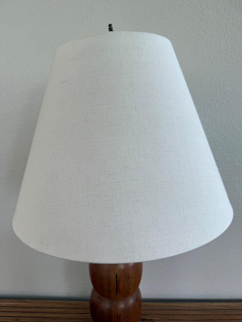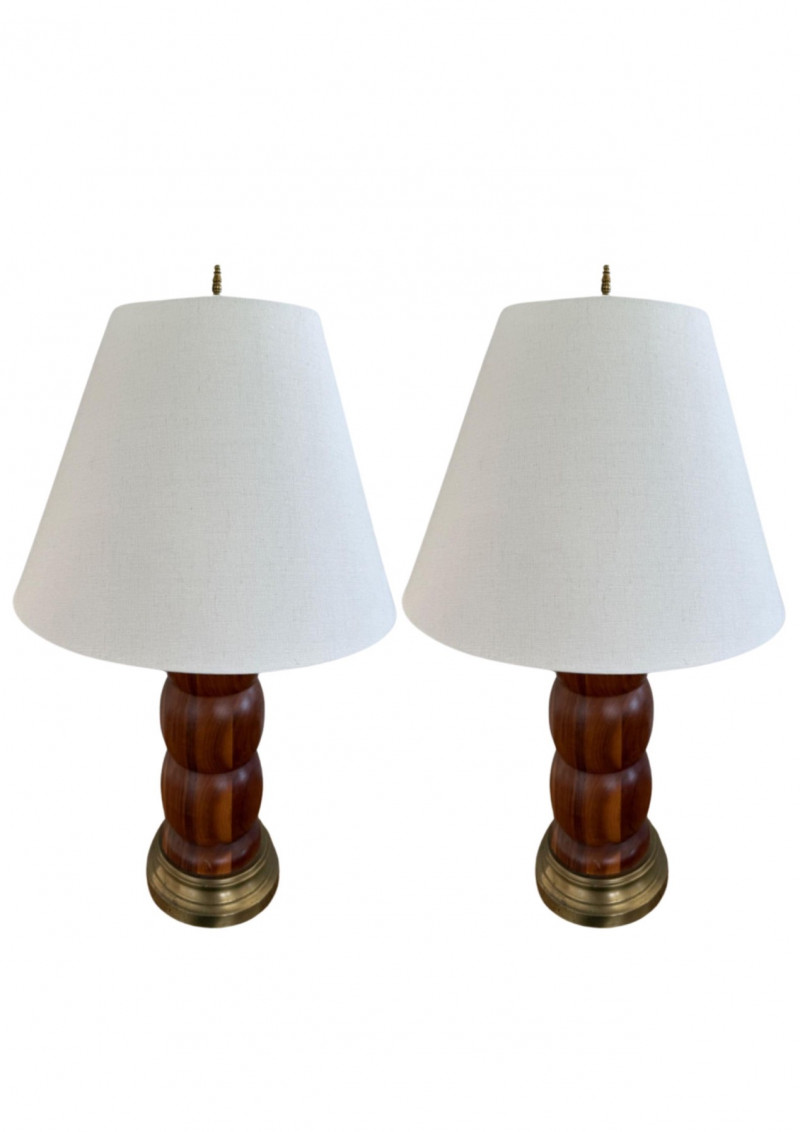 Pair of Stacked Wood Table Lamps with White Shades Matching set of two table lamps featuring turned wooden bases composed of four stacked rounded segments. Each base sits on a circular brass-finished metal base. Both lamps are fitted with white conical fabric shades and topped with finials. Wired with two-prong plugs. Measurements (each lamp):