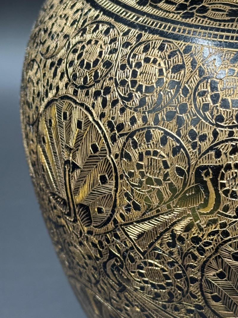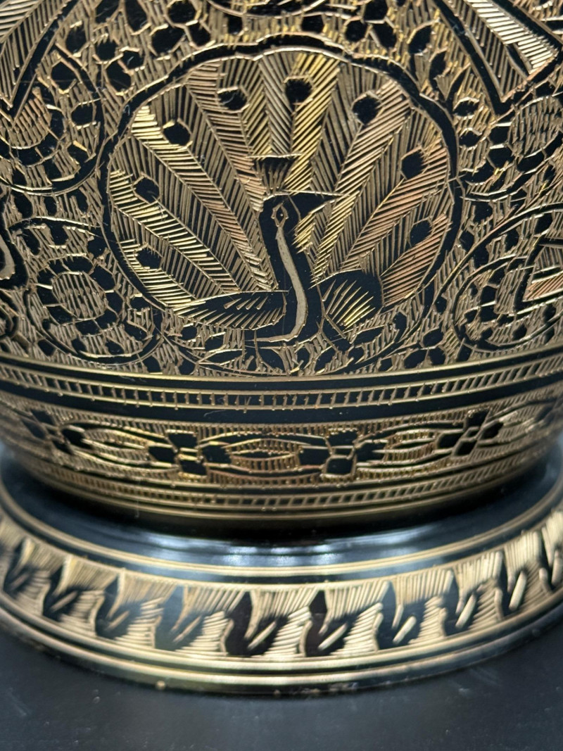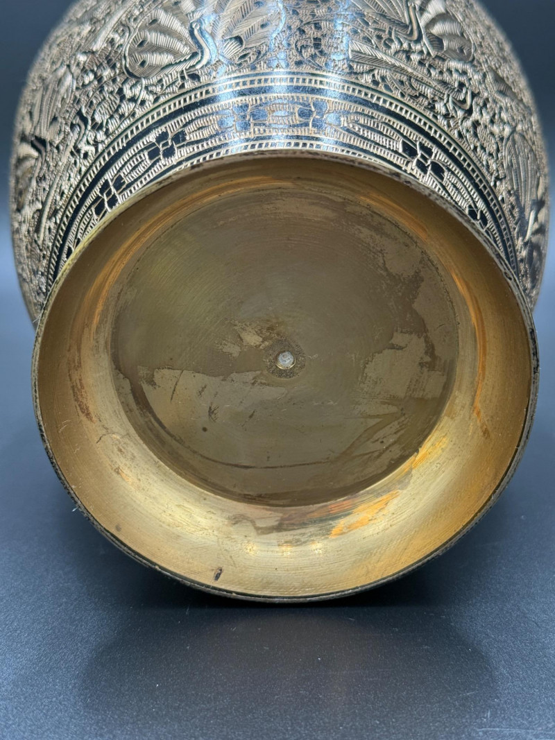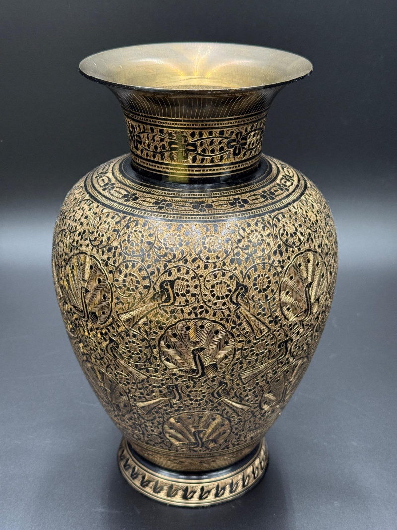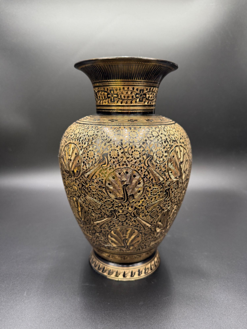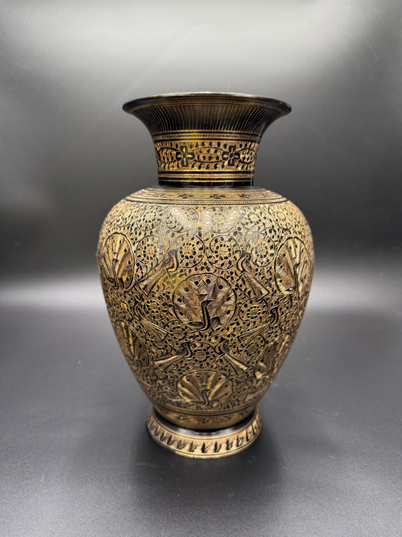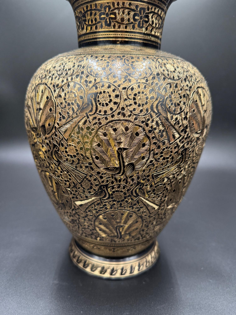 Lot # 83 - Etched Brass Vase with Peacock and Floral Motifs – 11” Tall