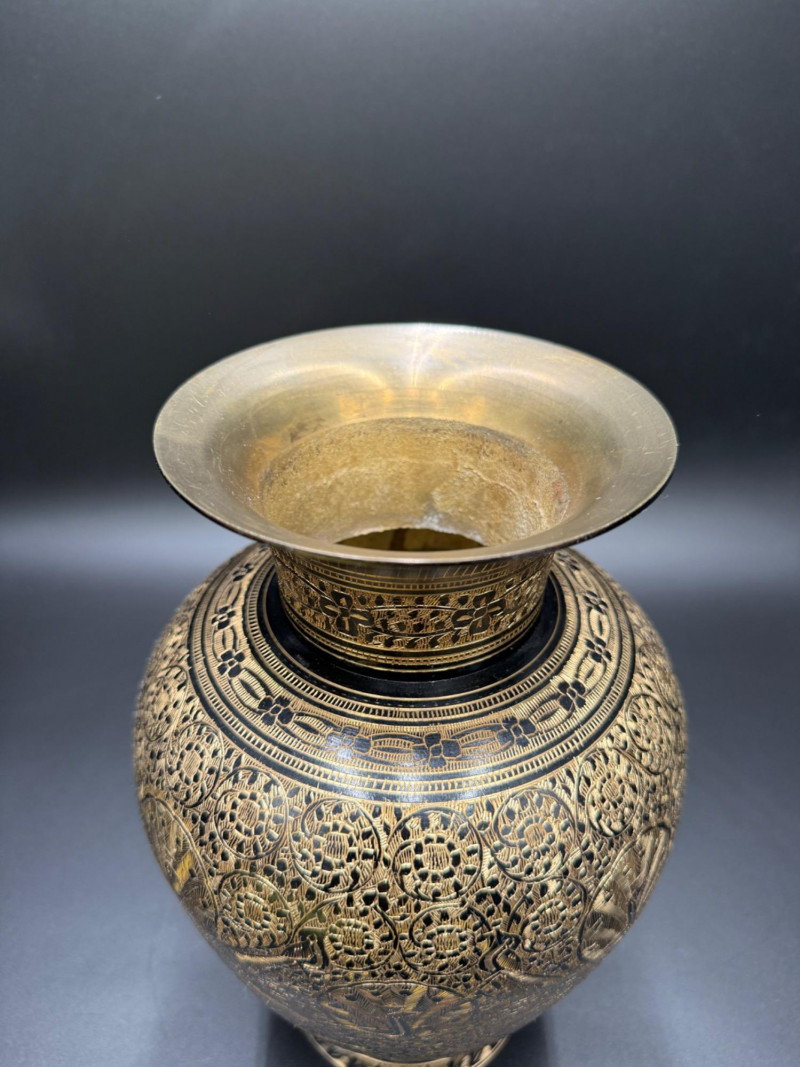 Etched Brass Vase with Peacock and Floral Motifs – 11” Tall This beautifully crafted etched brass vase features intricate hand-engraved detailing with repeating floral patterns and majestic peacocks prominently displayed around the body. Standing 11 inches tall with a 7-inch diameter, the vase showcases traditional South Asian artistry, with precision-cut designs that reflect cultural symbolism and skilled metalwork techniques. The warm brass tone and rich engraved textures give this piece a timeless and elegant look, ideal as a statement décor item. Measurements: