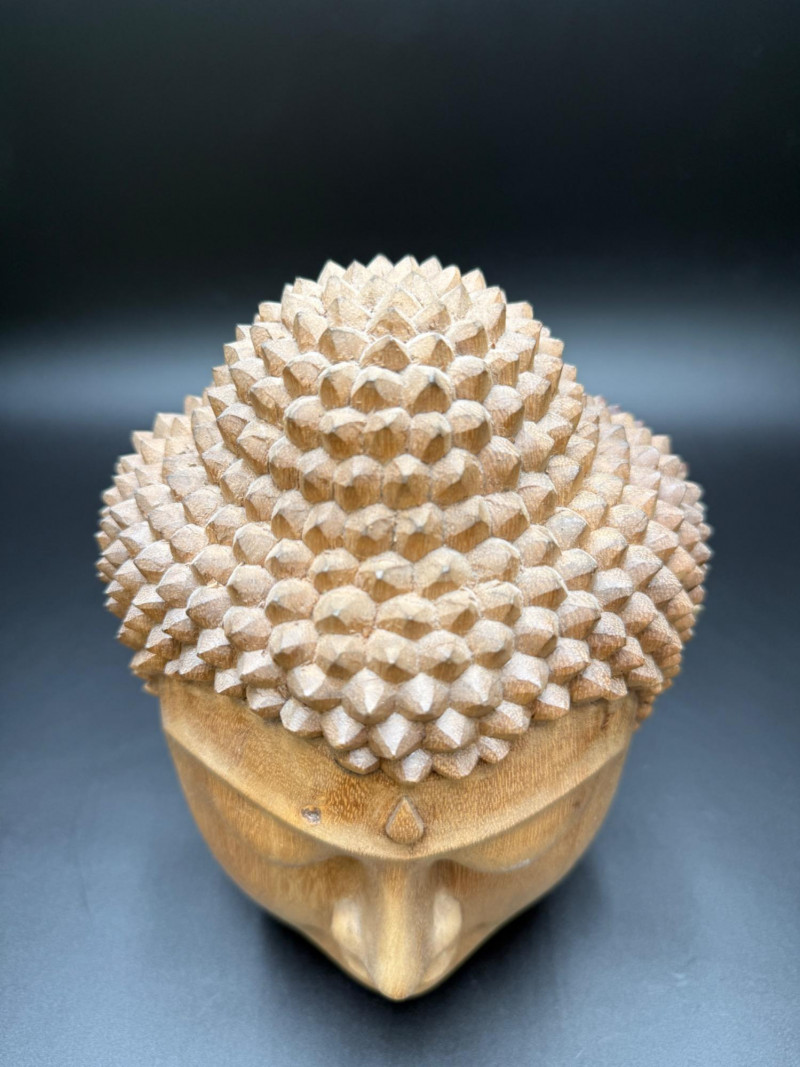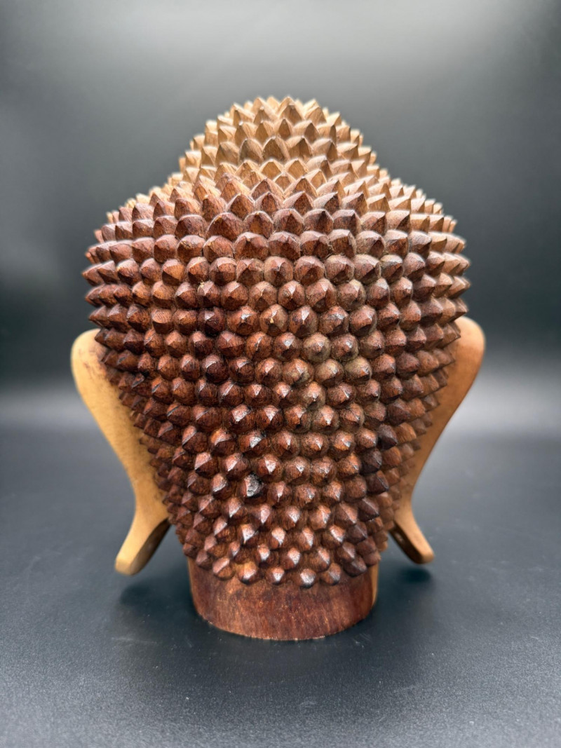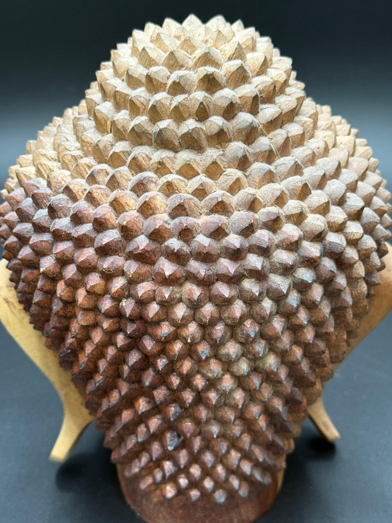 Carved Wooden Buddha Head Carved wooden Buddha head featuring closed eyes, elongated earlobes, and stylized textured hair. A teardrop-shaped mark is present on the forehead above the brow ridge. The head shows a visible surface chip above the left eyebrow. The hair is composed of raised rounded nodes in a symmetrical pattern. Dimensions: 8.5 x 6 x 8 in.