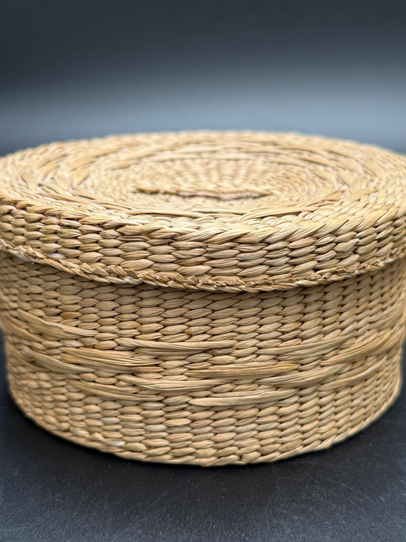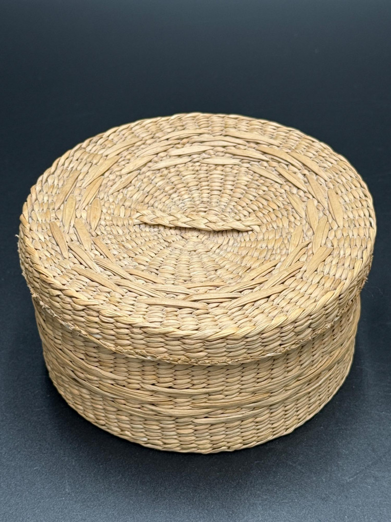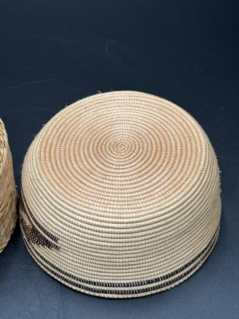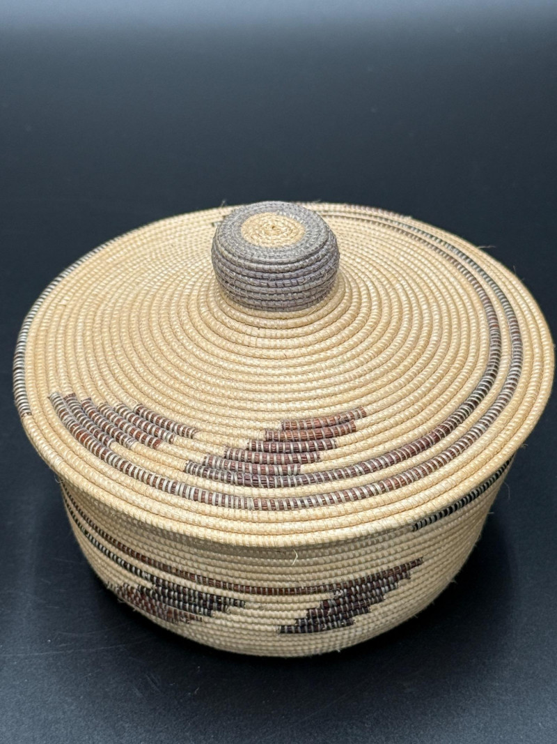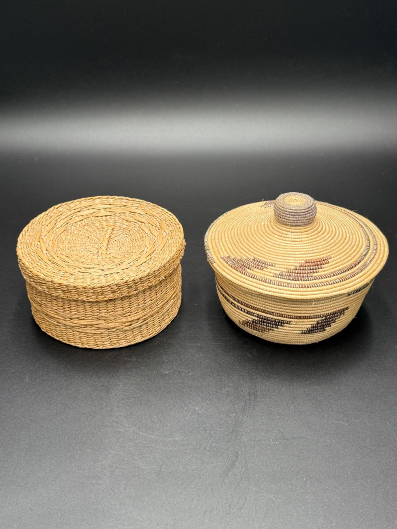 Two woven baskets with fitted lids. One has a coiled construction with geometric dark patterning and knobbed lid. The other has a plaited flat weave with matching cover. Both are circular in shape and differ in height and weaving style.