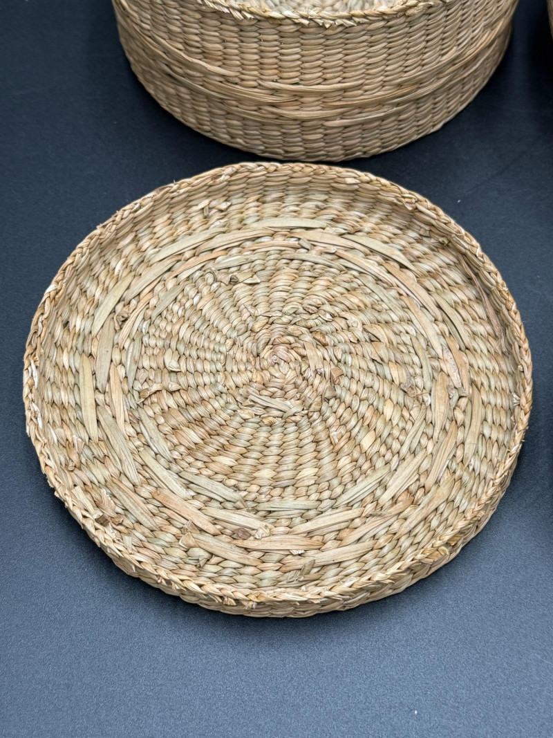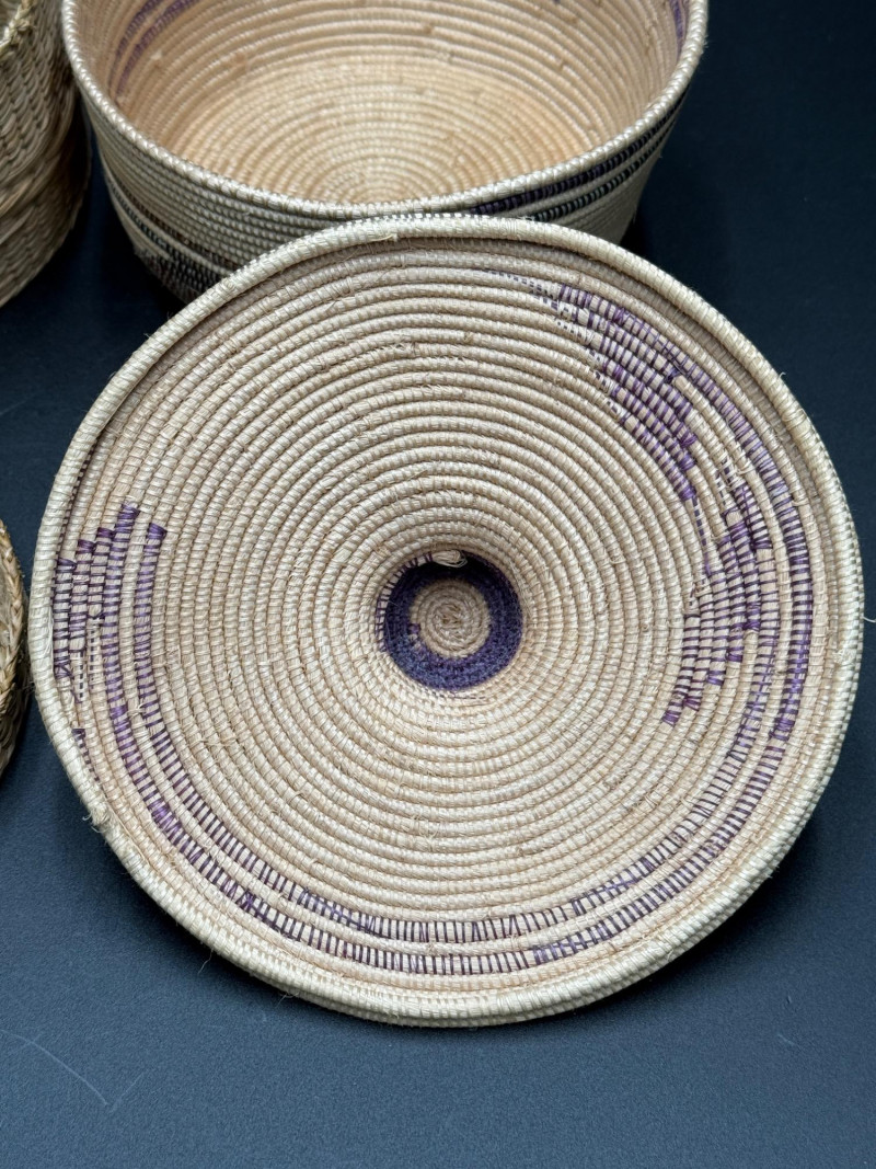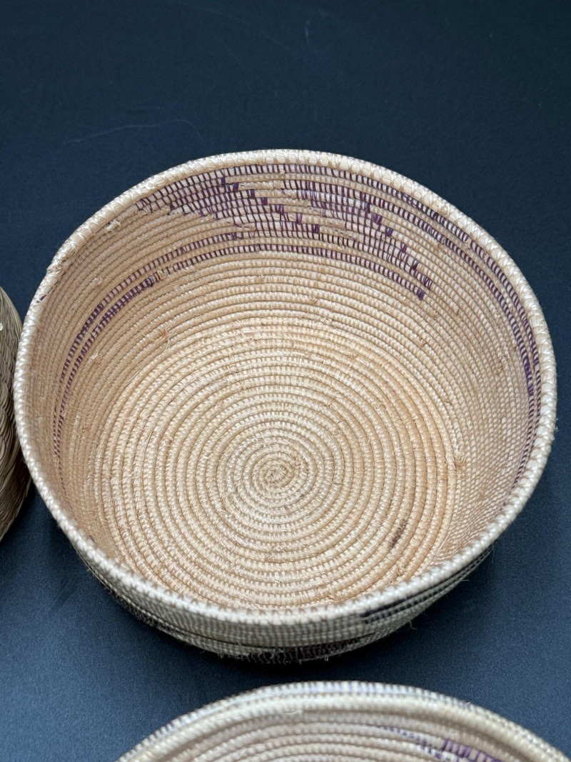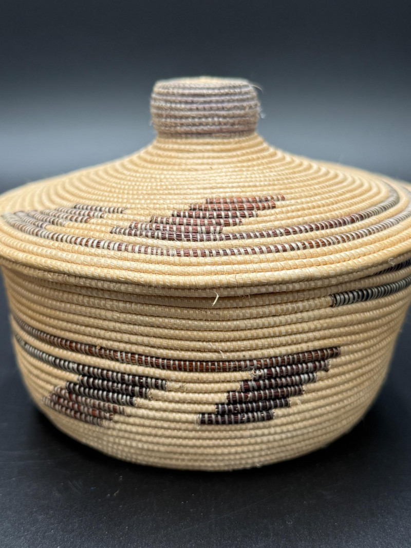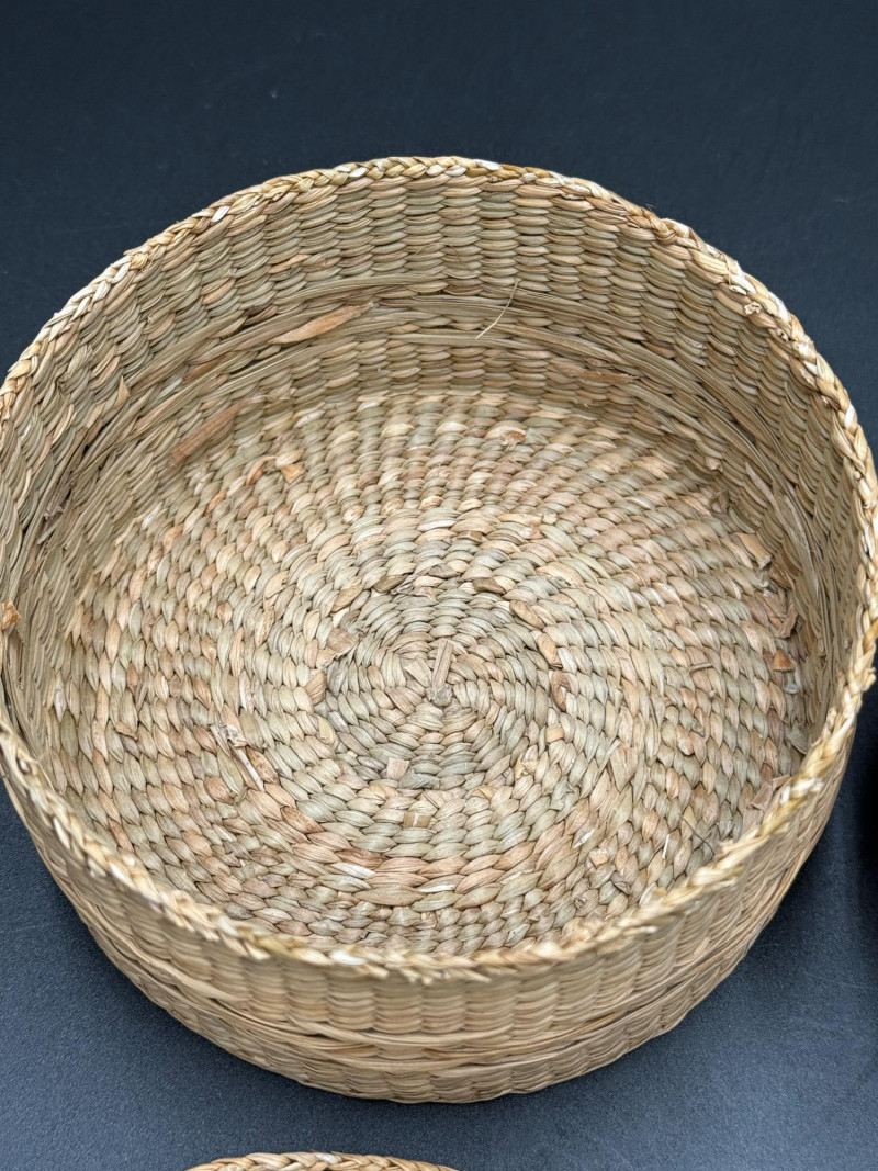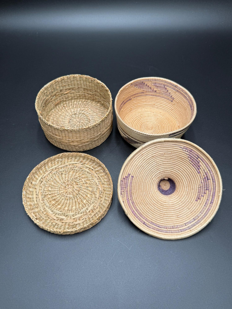 Pair of Lidded Woven Baskets Measurements: Coiled basket with pattern: approx. 4.5" H x 5.5" W Plaited flat weave basket: approx. 2.5" H x 5" W