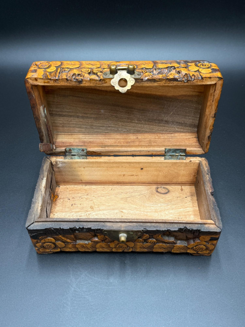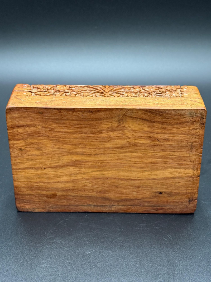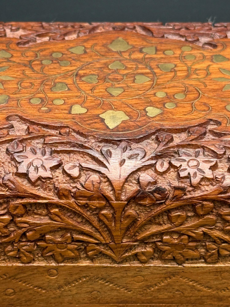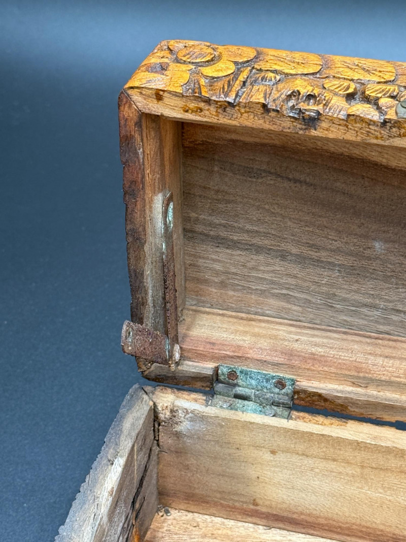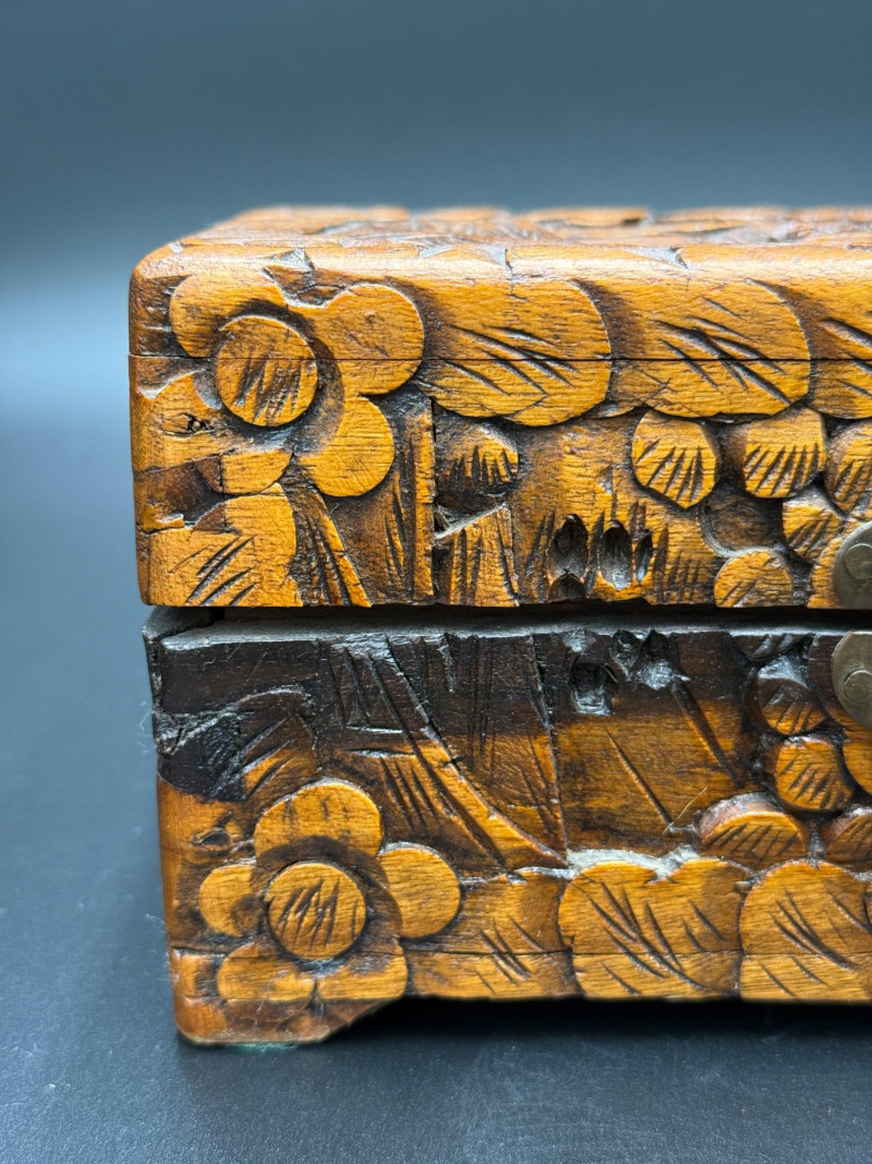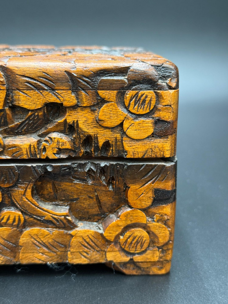 Smaller carved wooden box with floral patterns and inlaid details. Plain wooden interior and hinged lid. Signs of general wear.