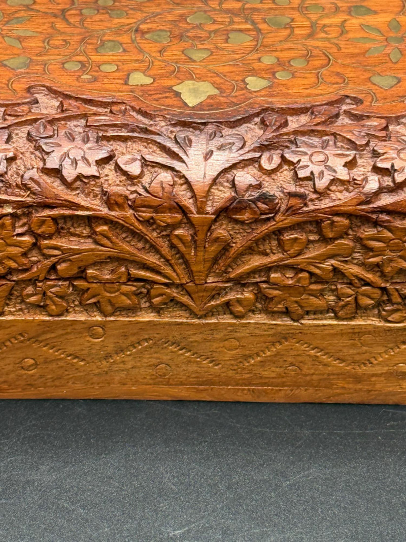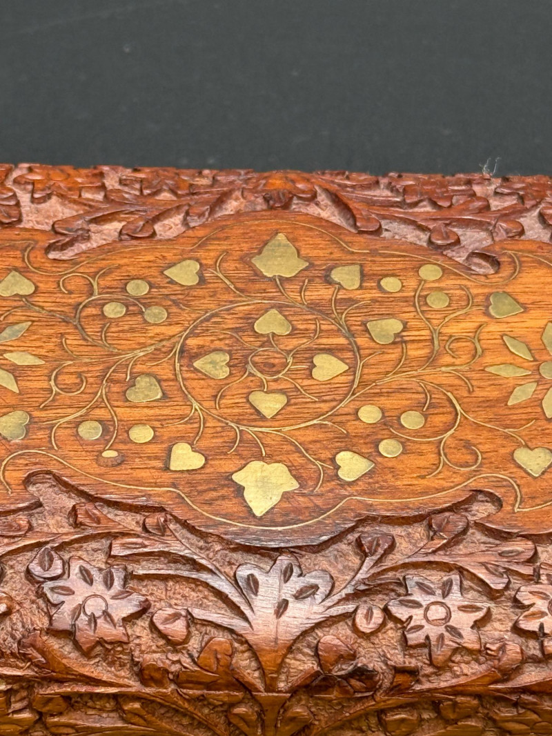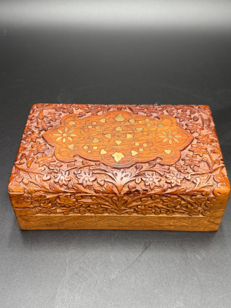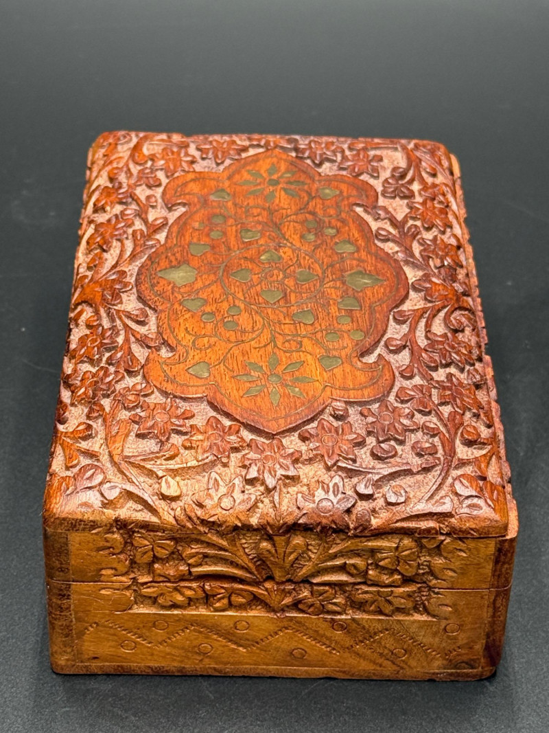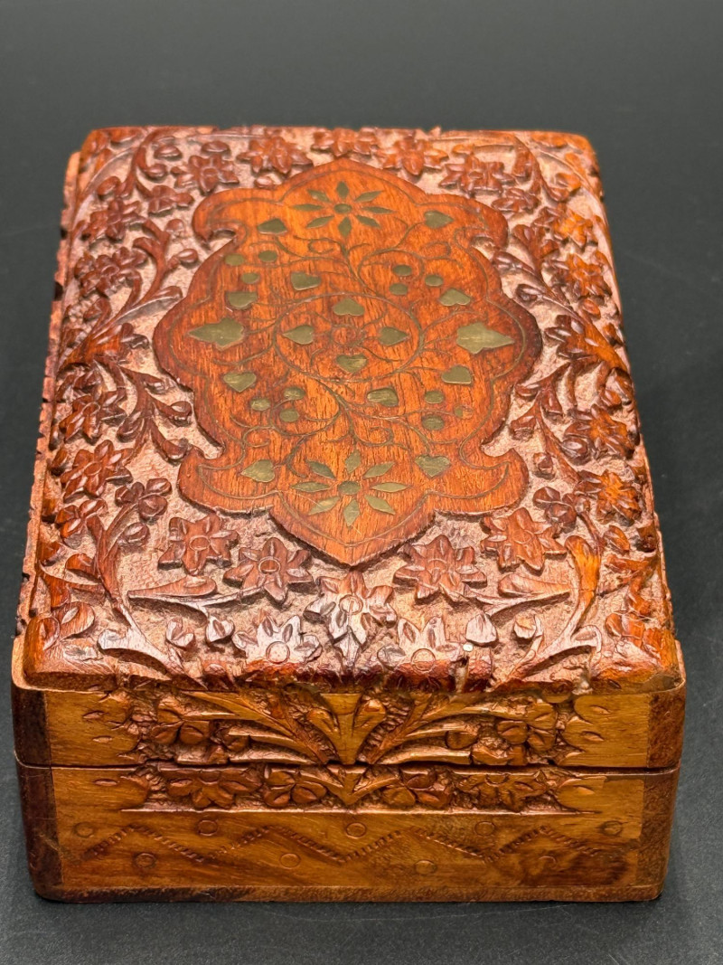 Smaller carved wooden box with floral patterns and inlaid details. Plain wooden interior and hinged lid. Signs of general wear.