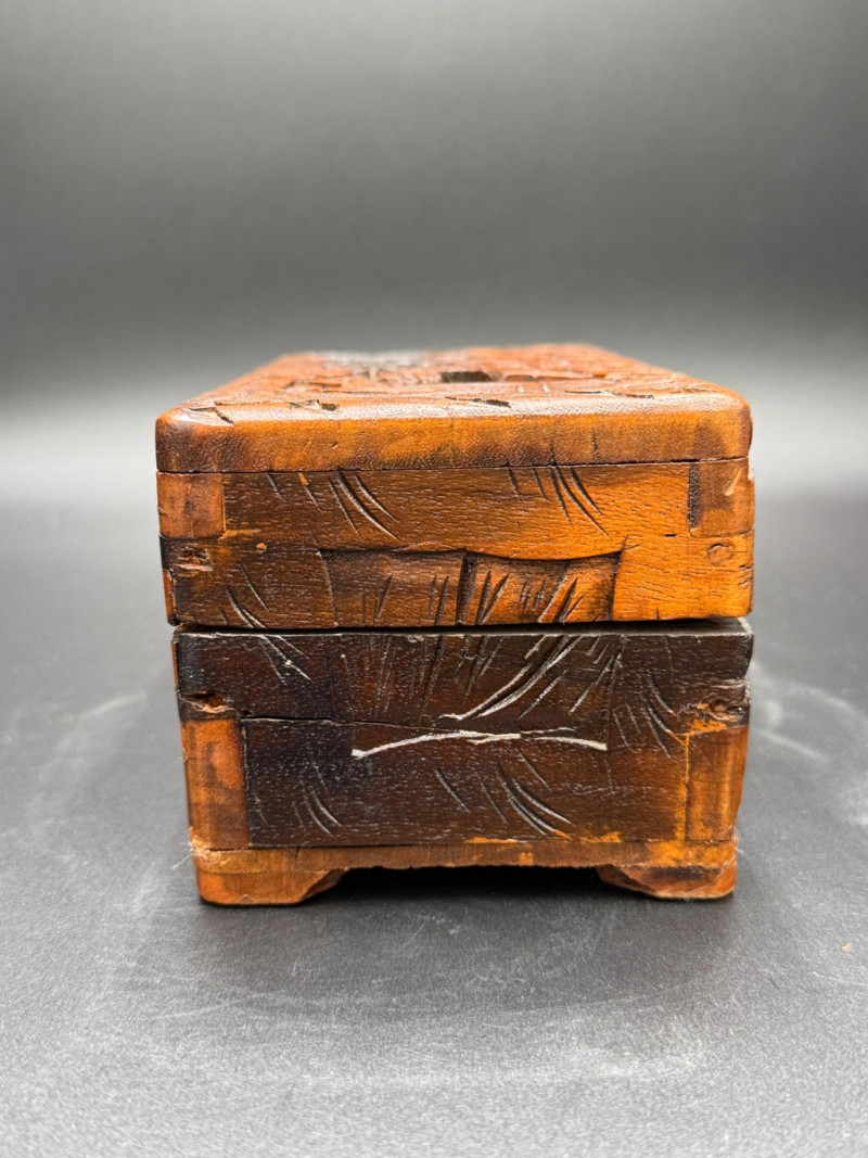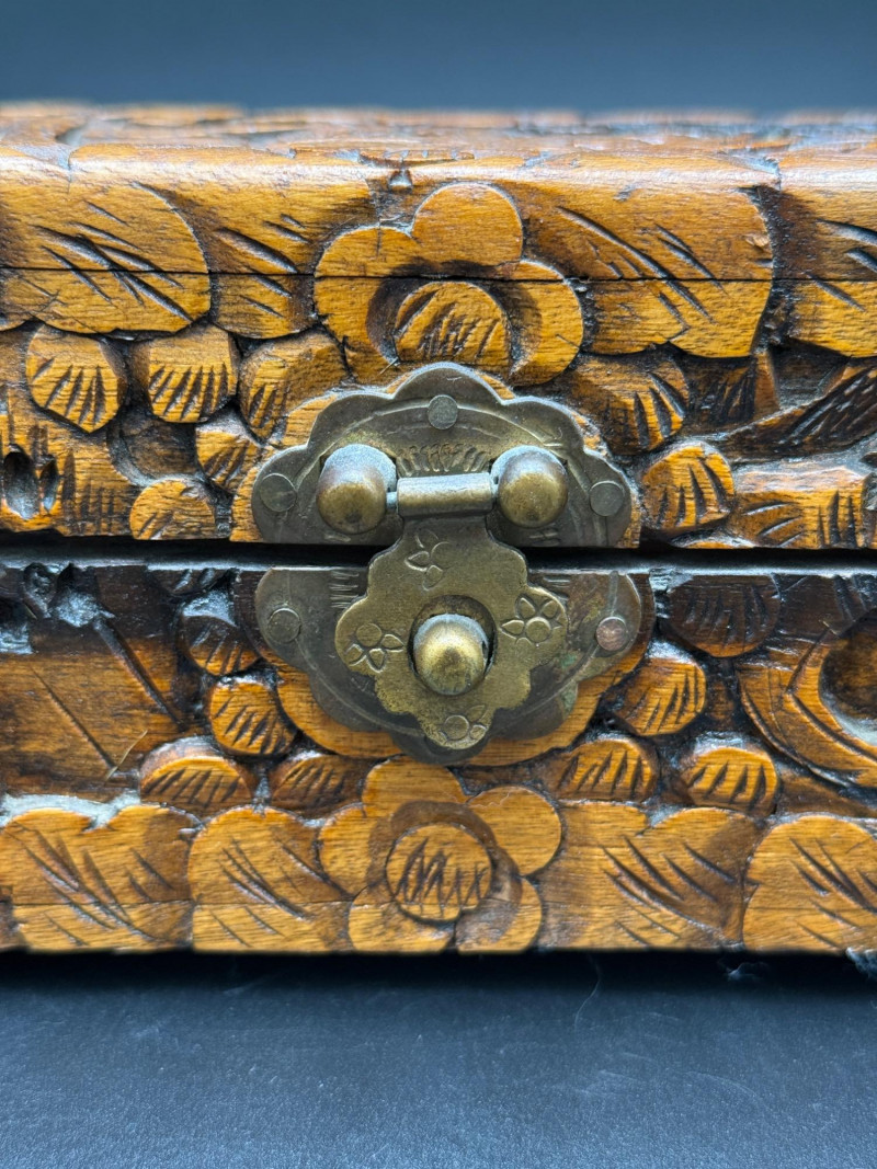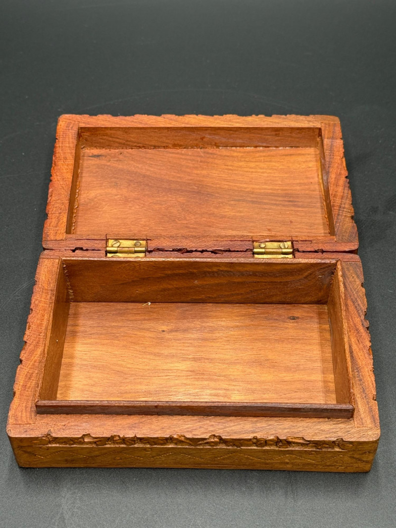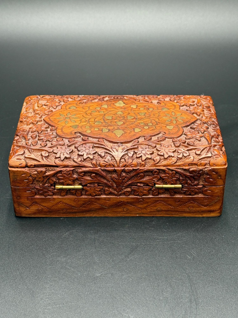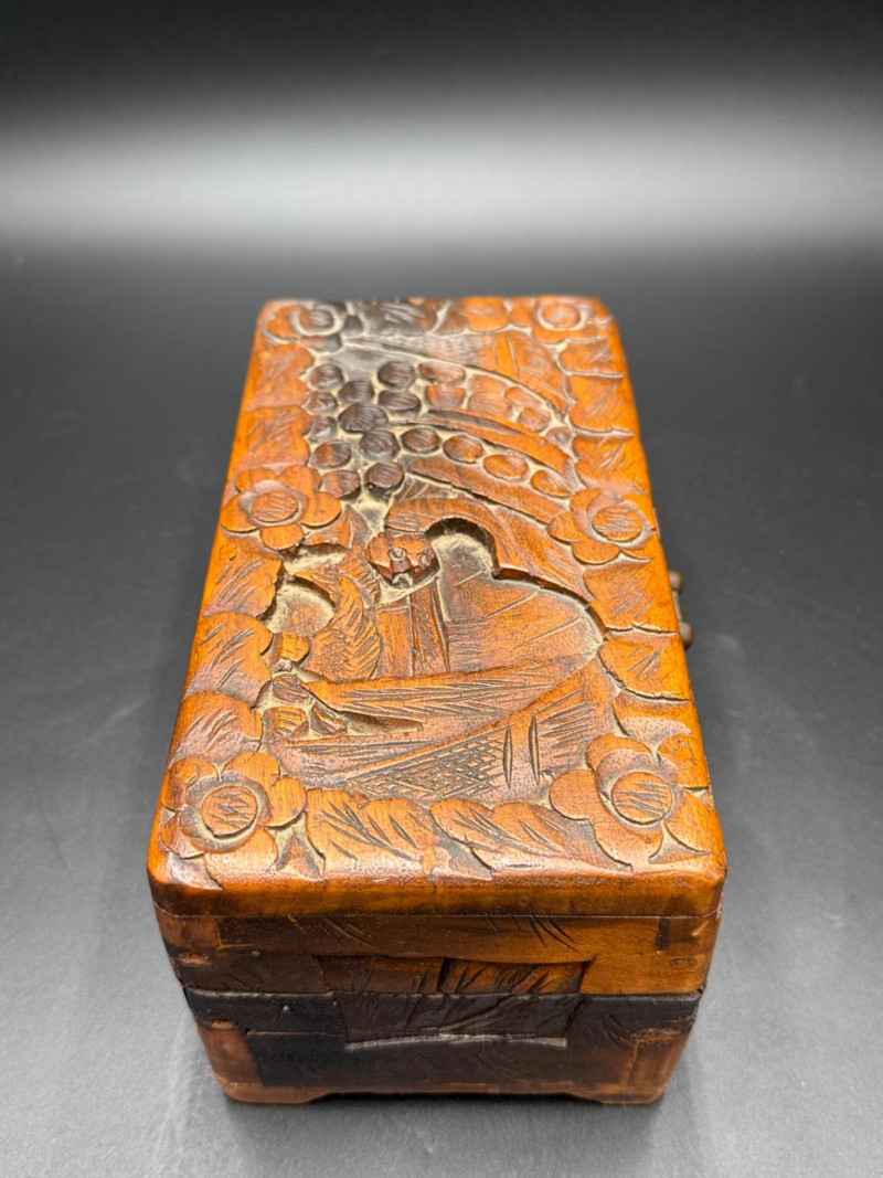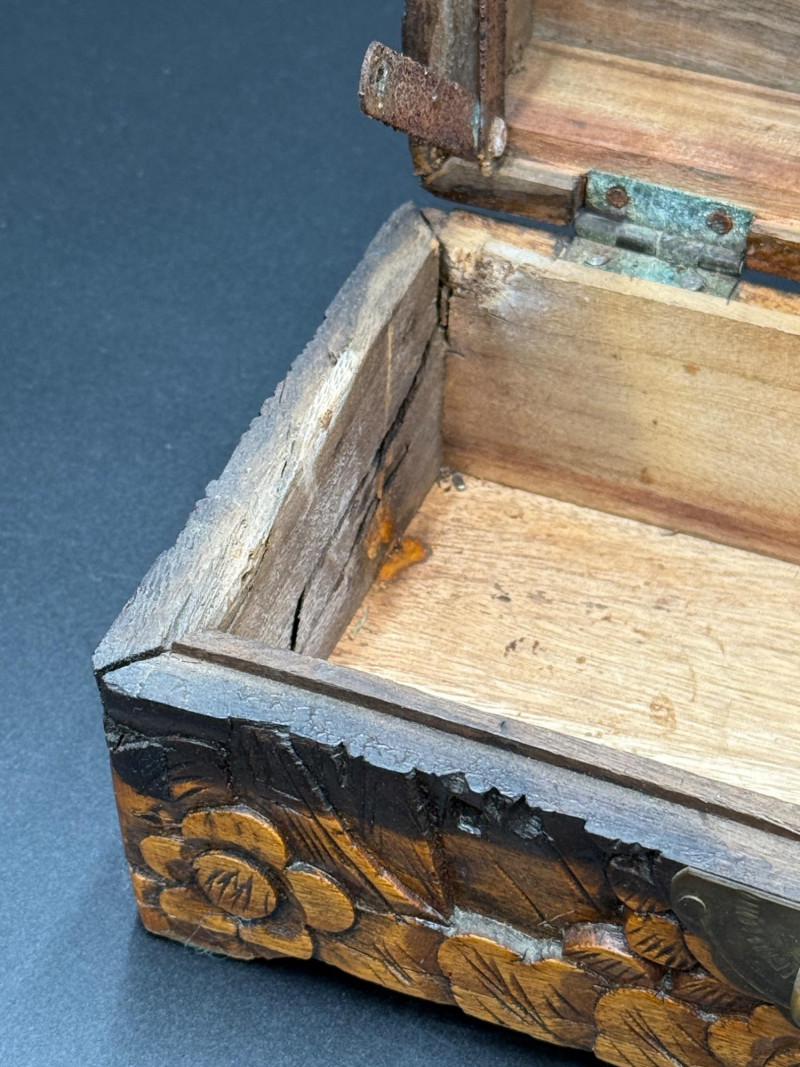 Smaller carved wooden box with floral patterns and inlaid details. Plain wooden interior and hinged lid. Signs of general wear.