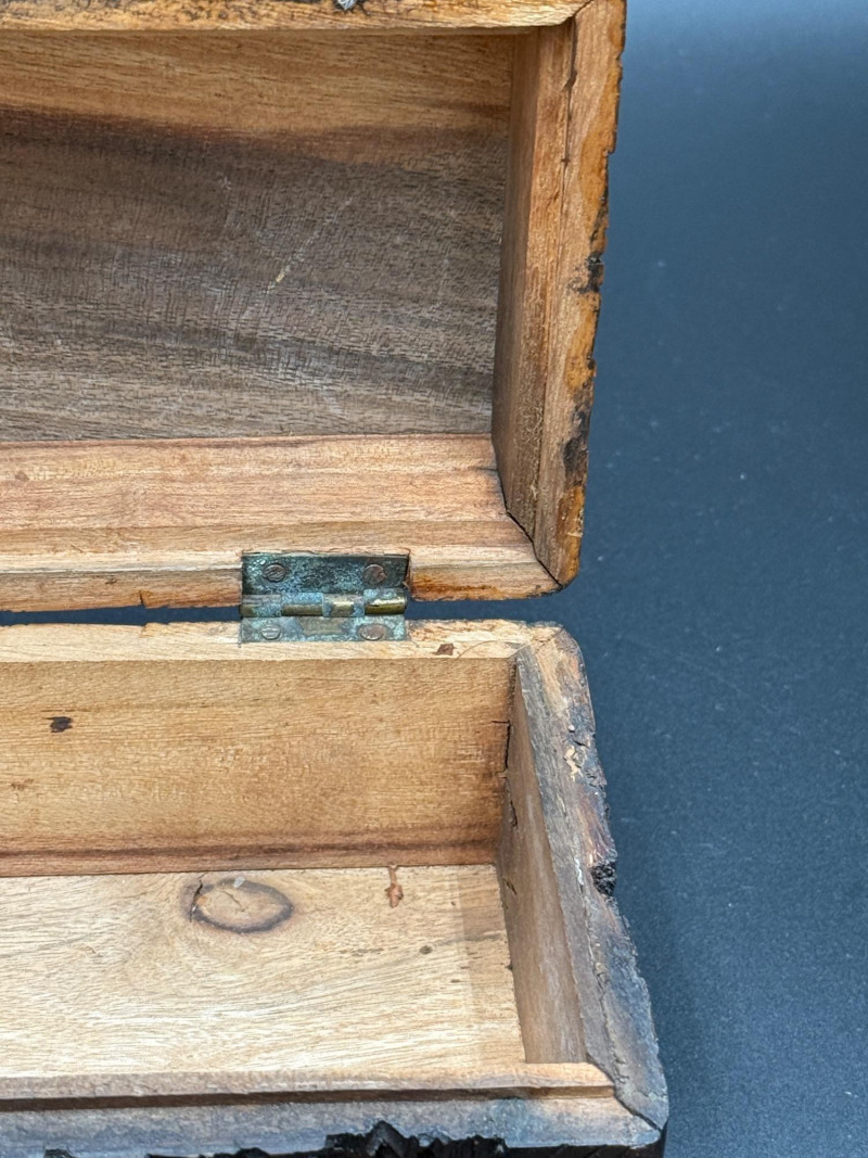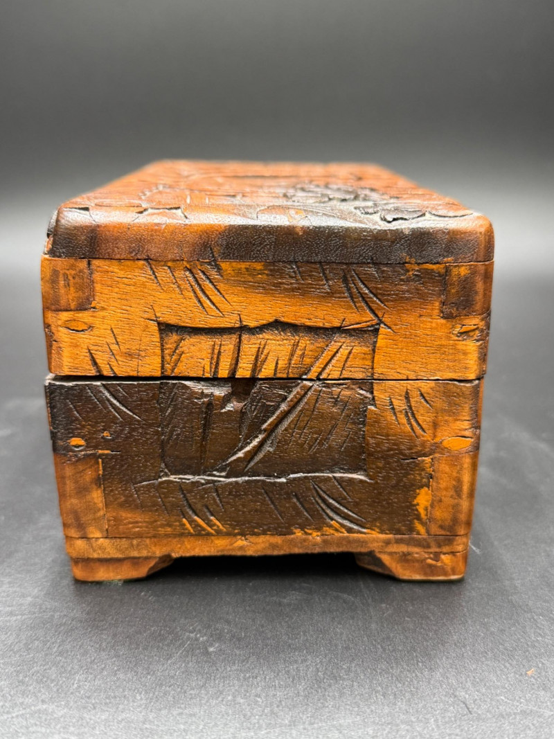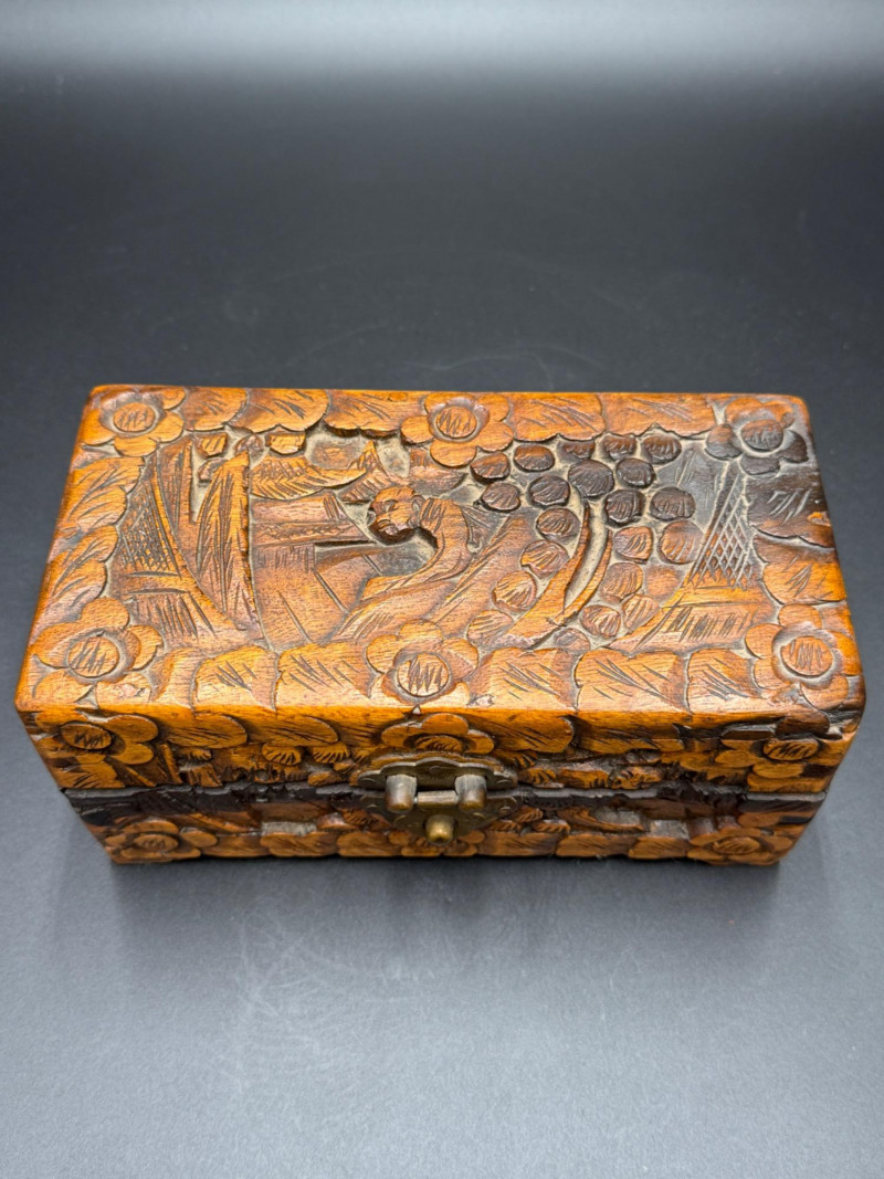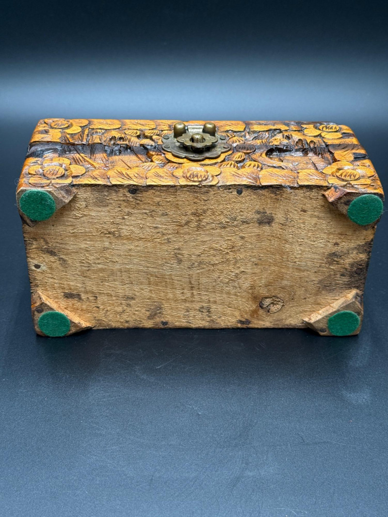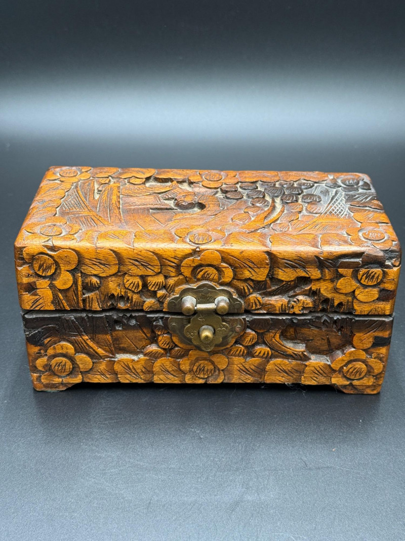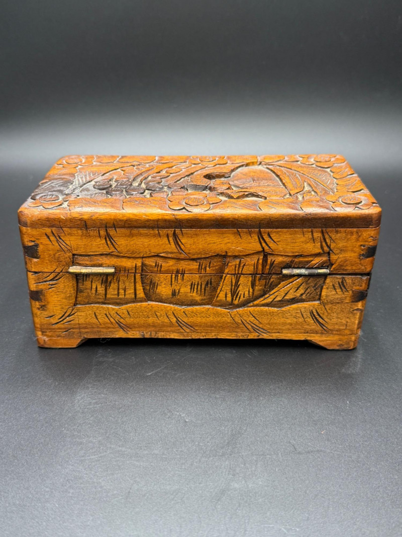 Smaller carved wooden box with floral patterns and inlaid details. Plain wooden interior and hinged lid. Signs of general wear.