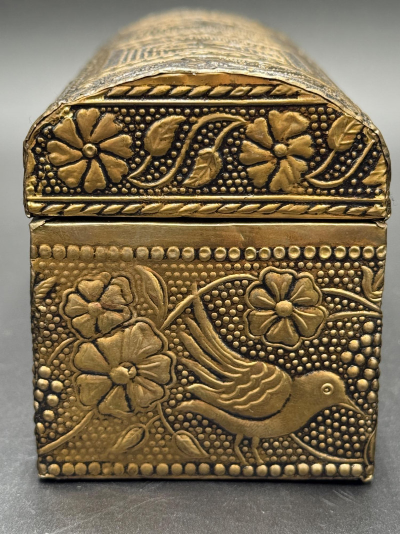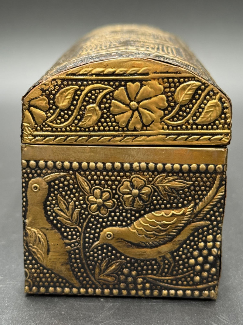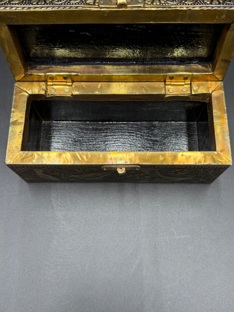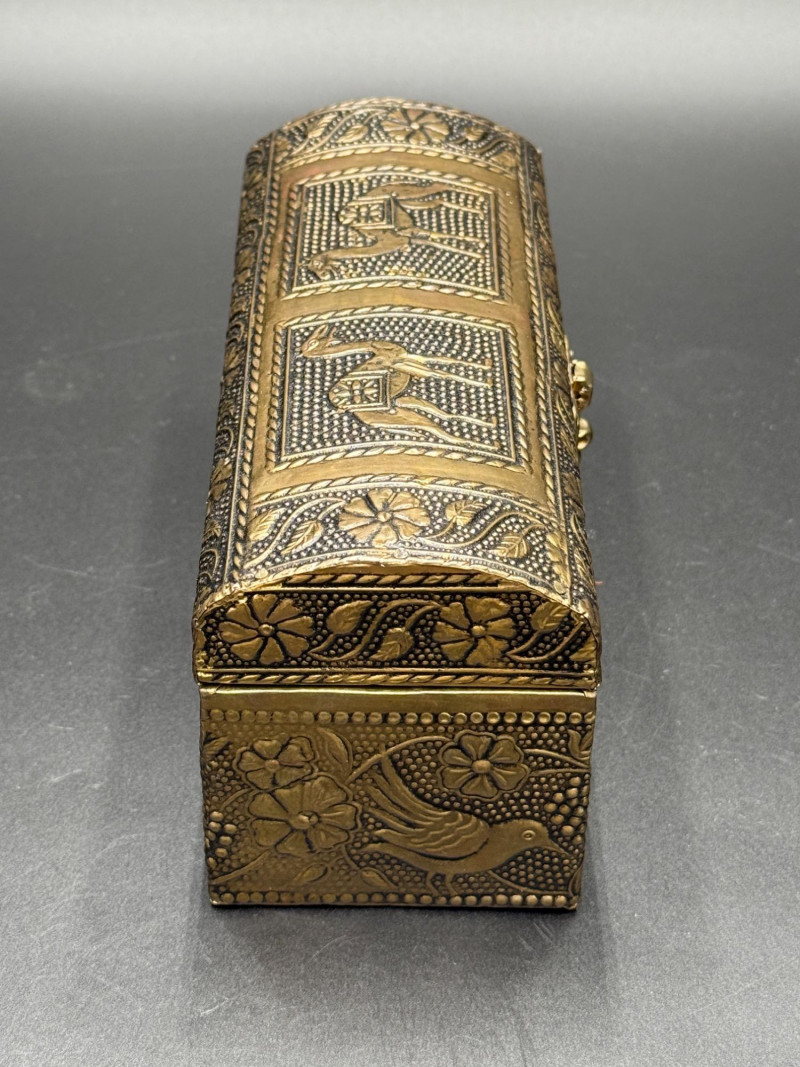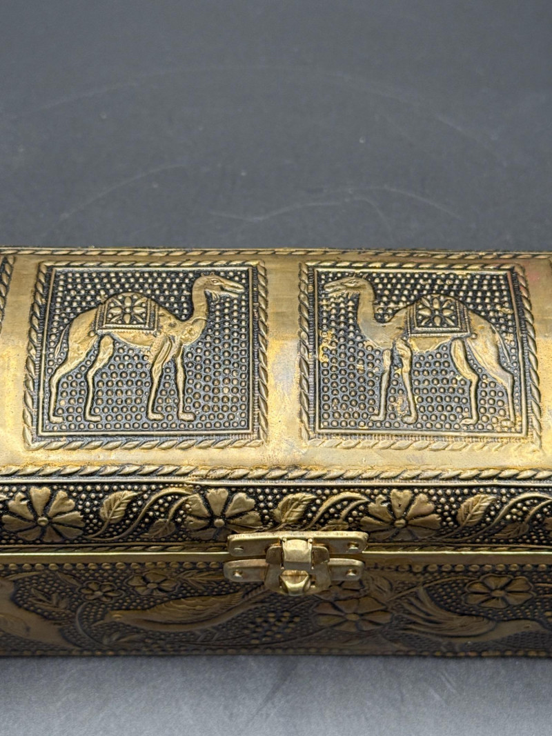 Rectangular box with etched camel, floral, and bird designs on a gold-tone surface. Domed lid with front latch and black-lined interior.