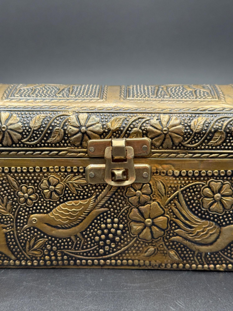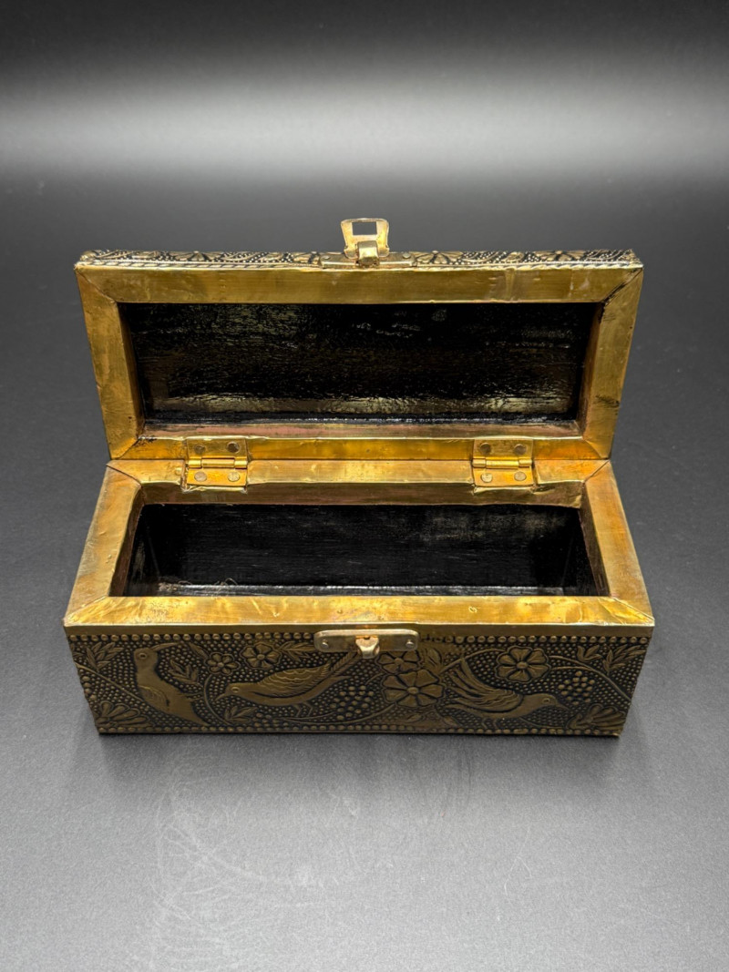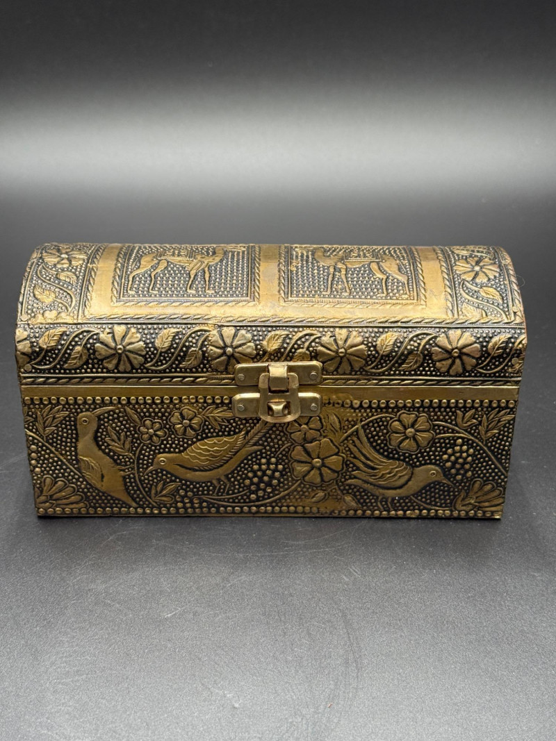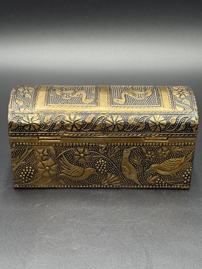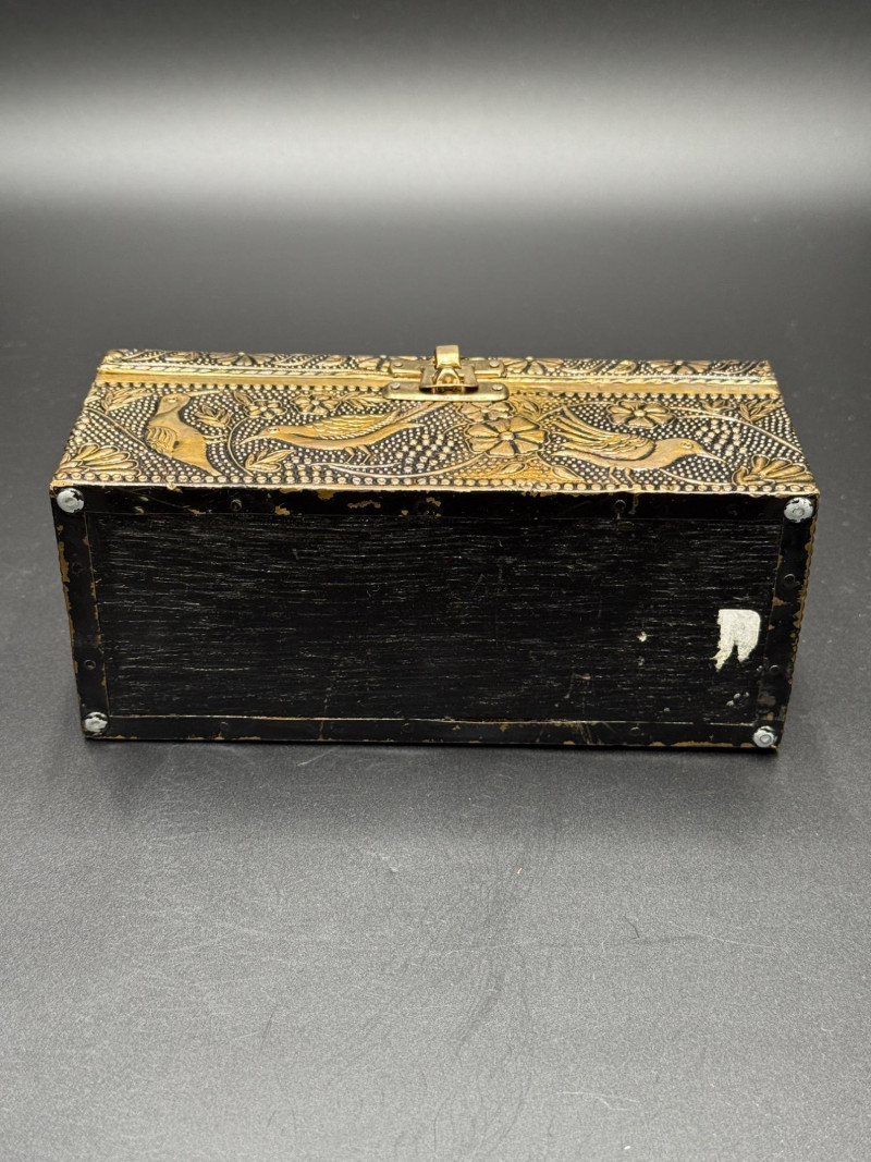 Rectangular box with etched camel, floral, and bird designs on a gold-tone surface. Domed lid with front latch and black-lined interior.